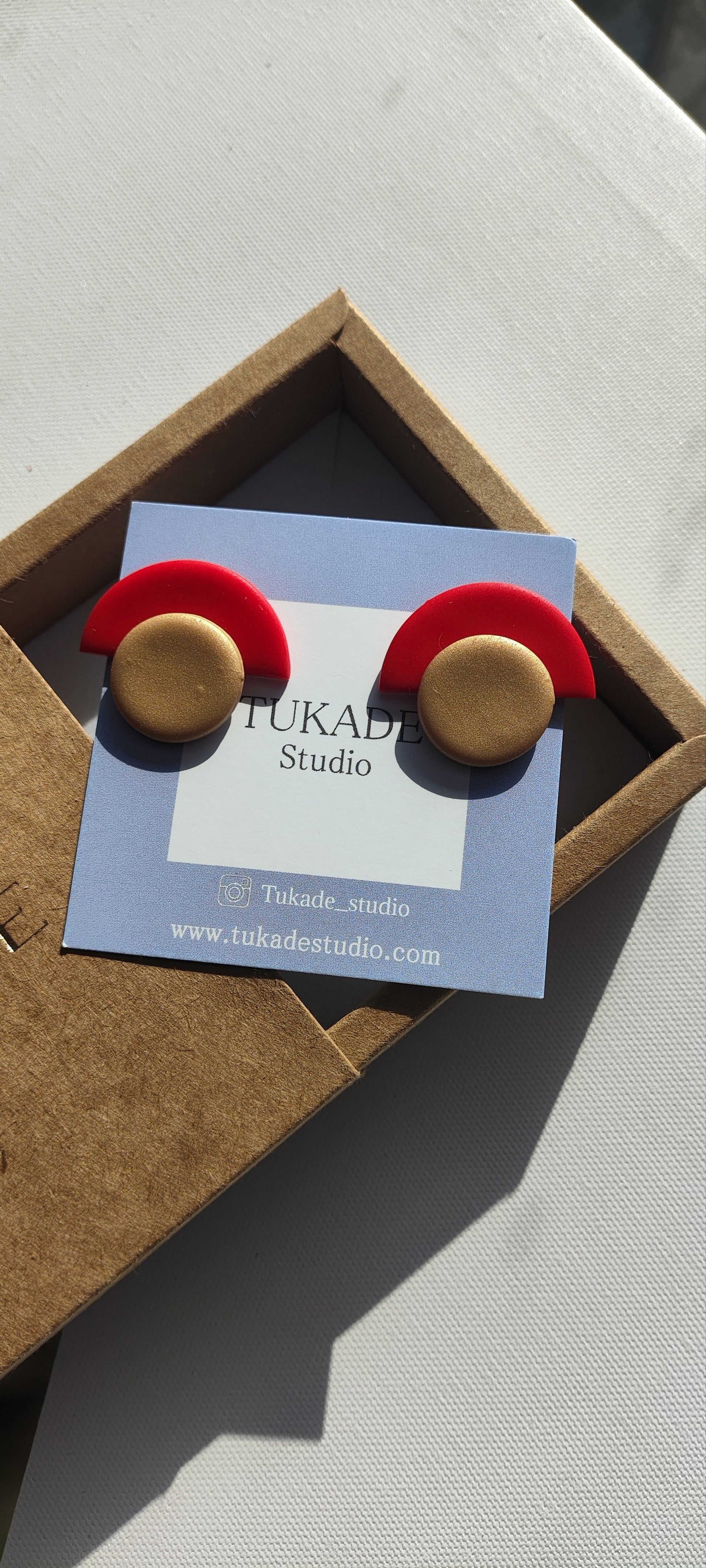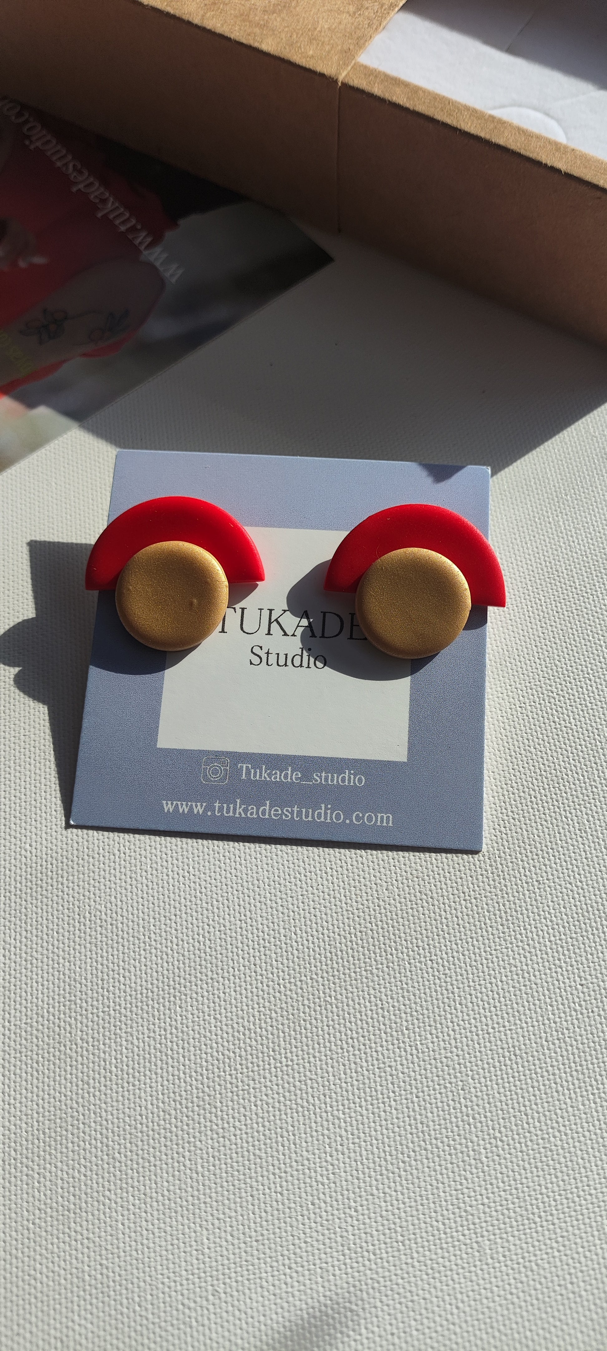 Pendientes minimalistas AVE en forma de media luna y círculo en color rojo amapola y beige-dorado metalizado