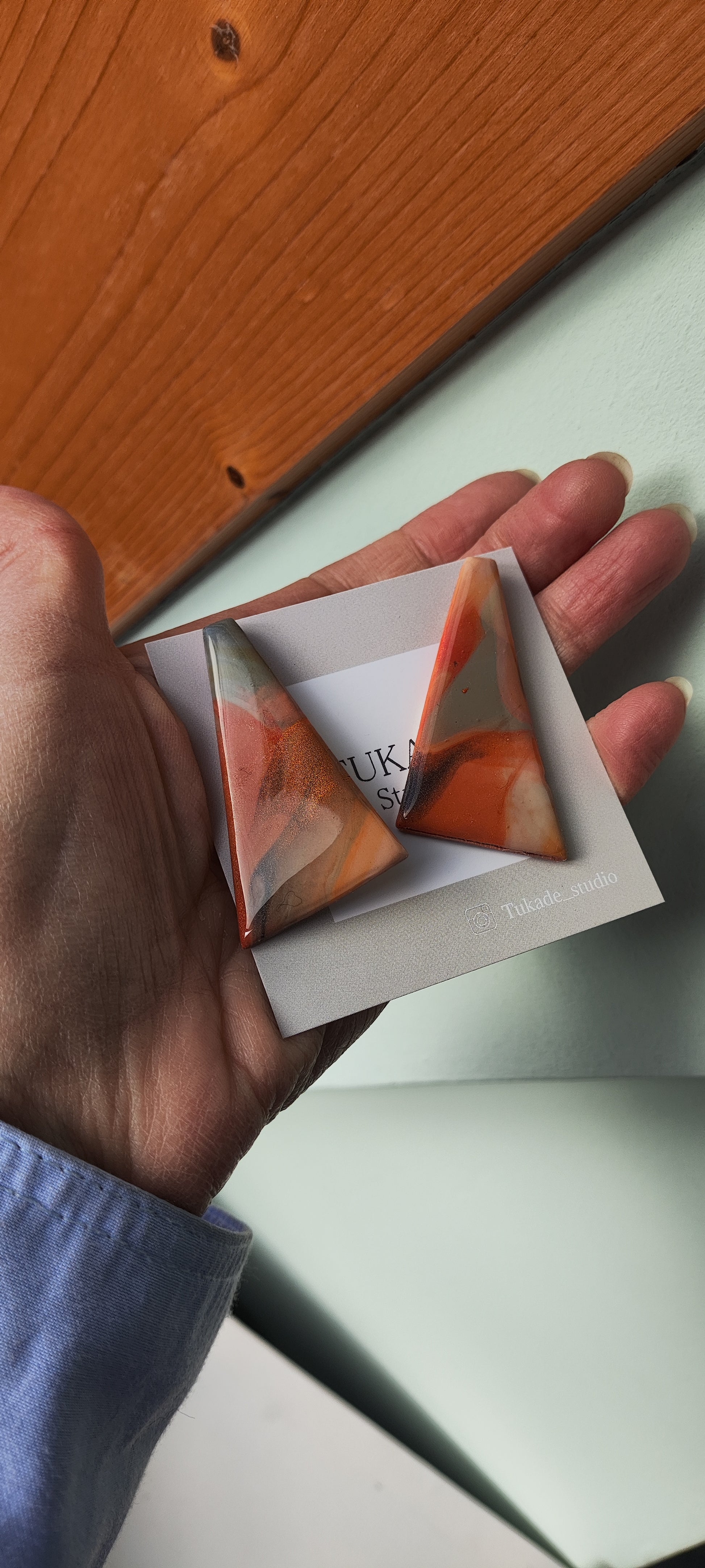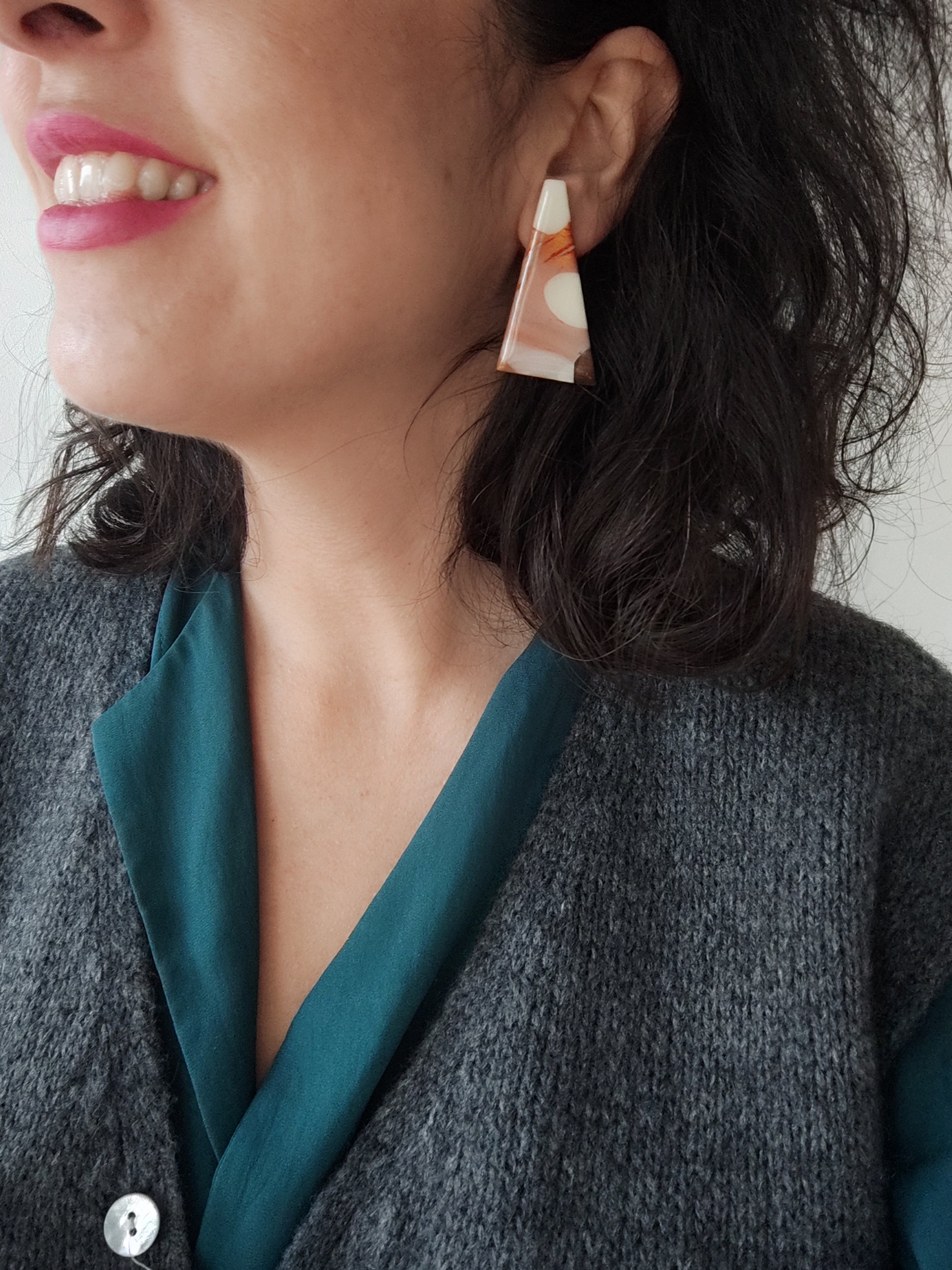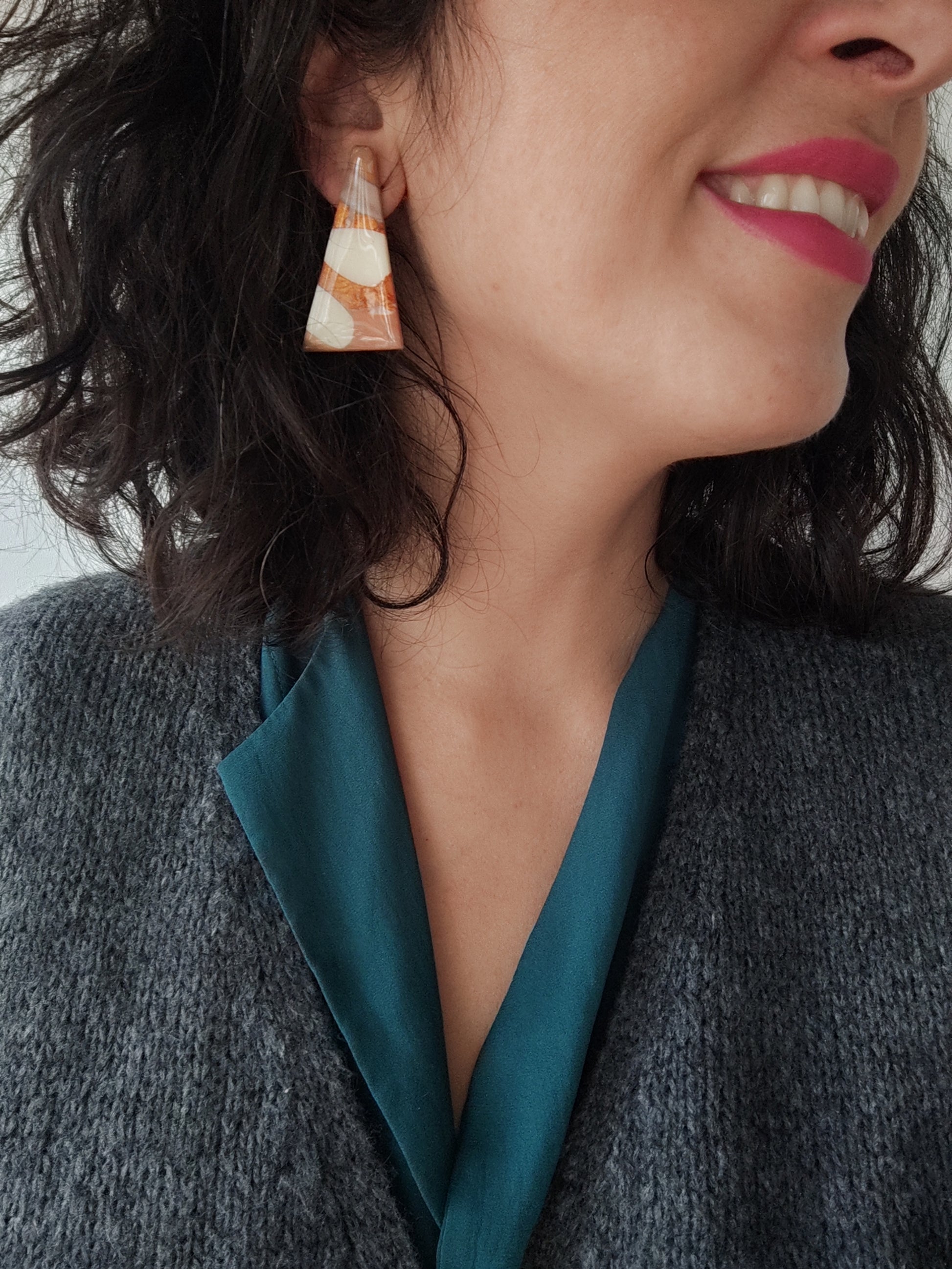 Pendientes minimalistas CANDIDA en forma geométrica irregular, mezcla de colores y acabado brillo en resina. Cada par es único e irrepetible.