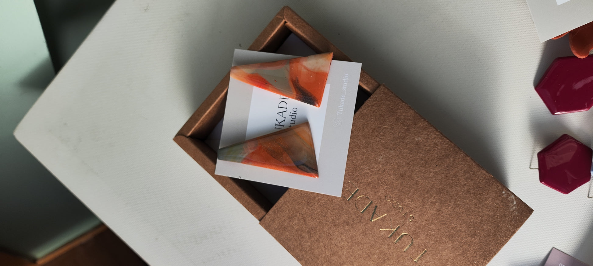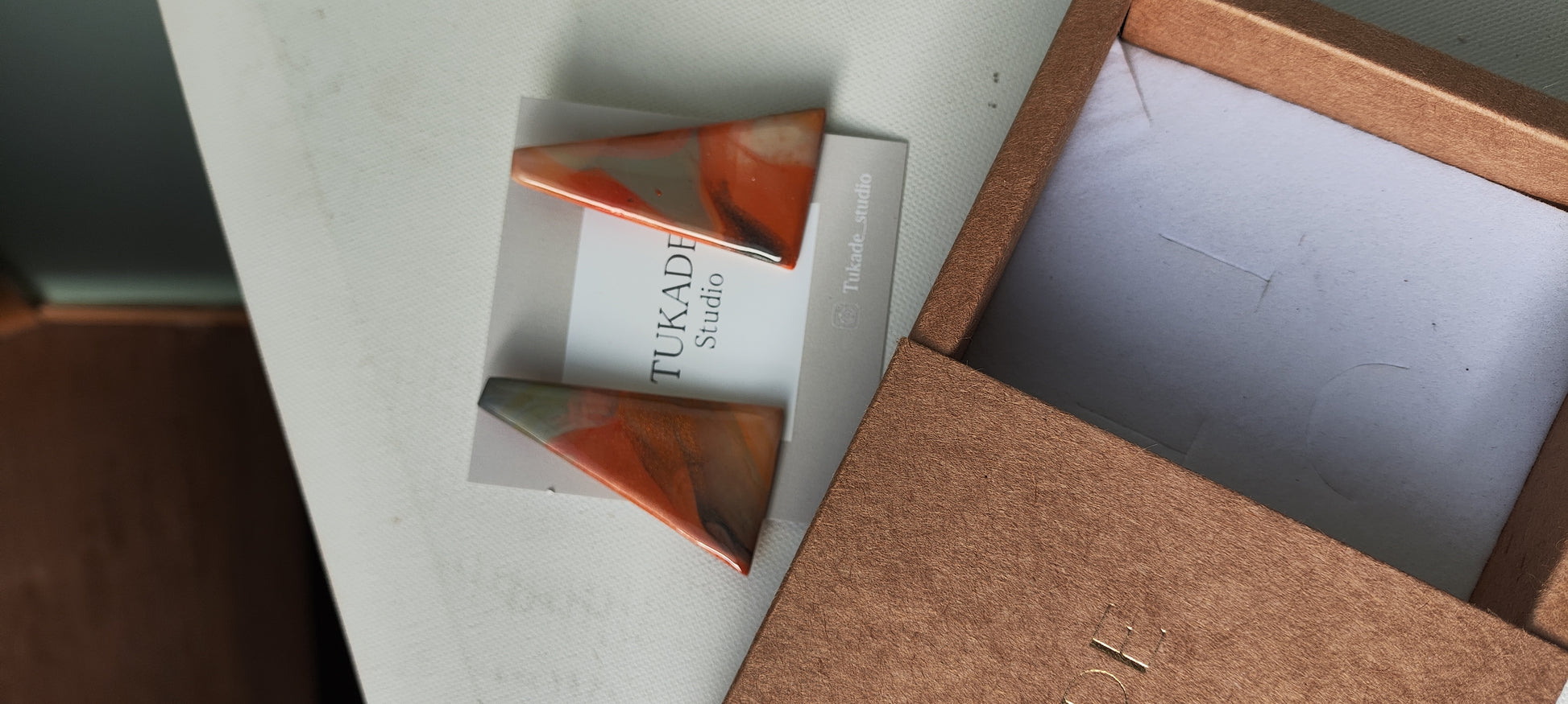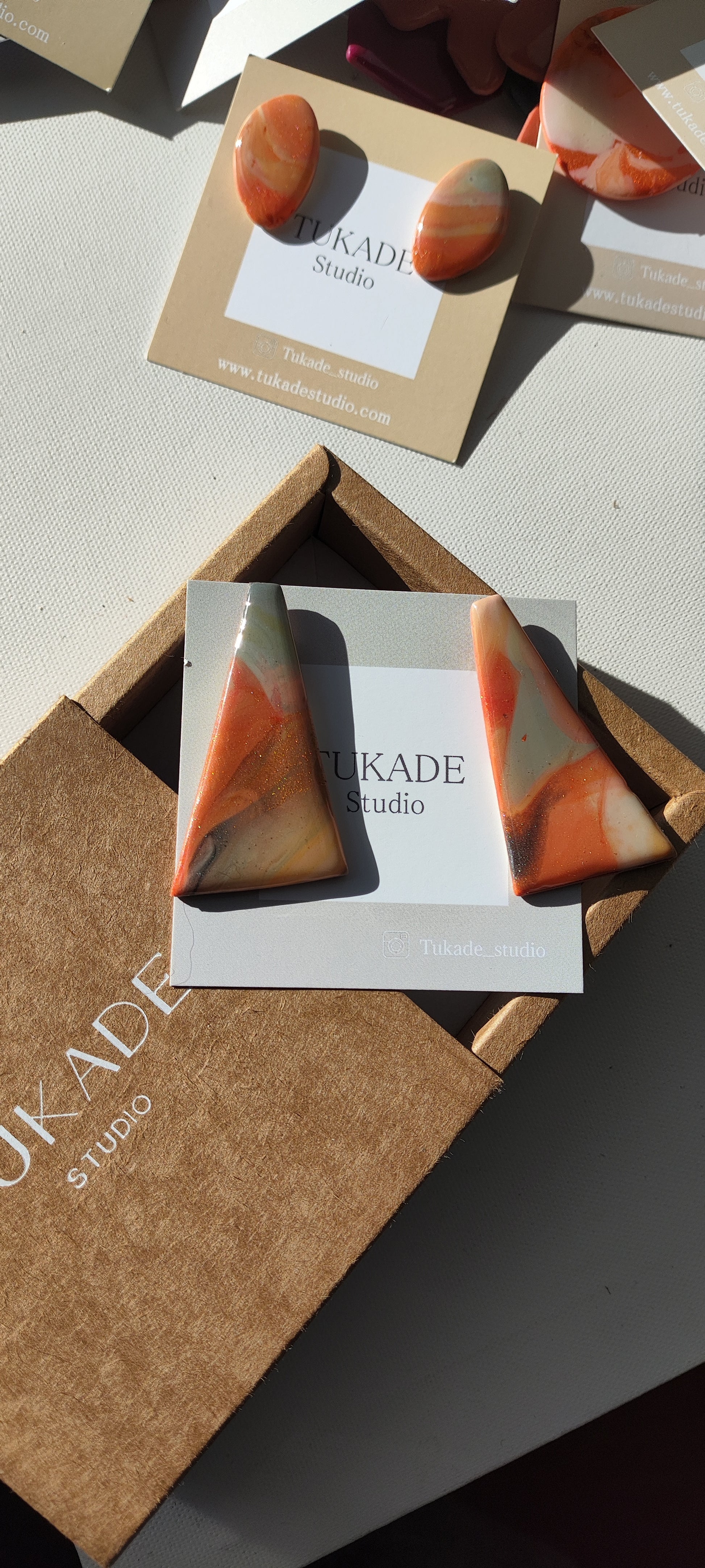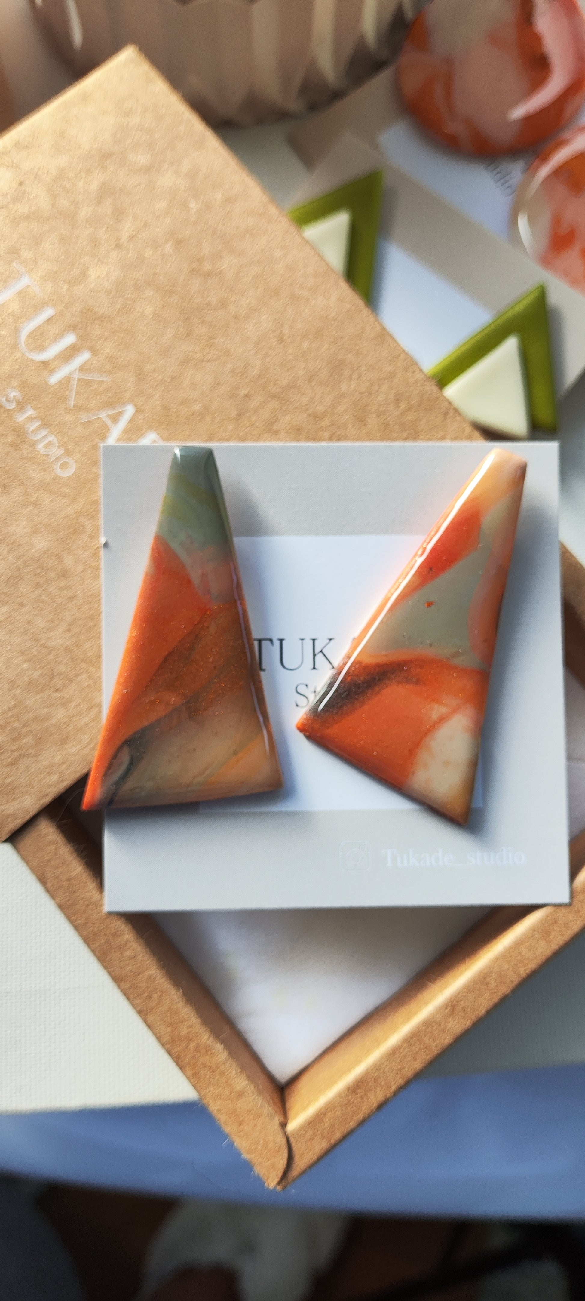 Pendientes minimalistas CANDIDA en forma geométrica irregular, mezcla de colores y acabado brillo en resina. Cada par es único e irrepetible.