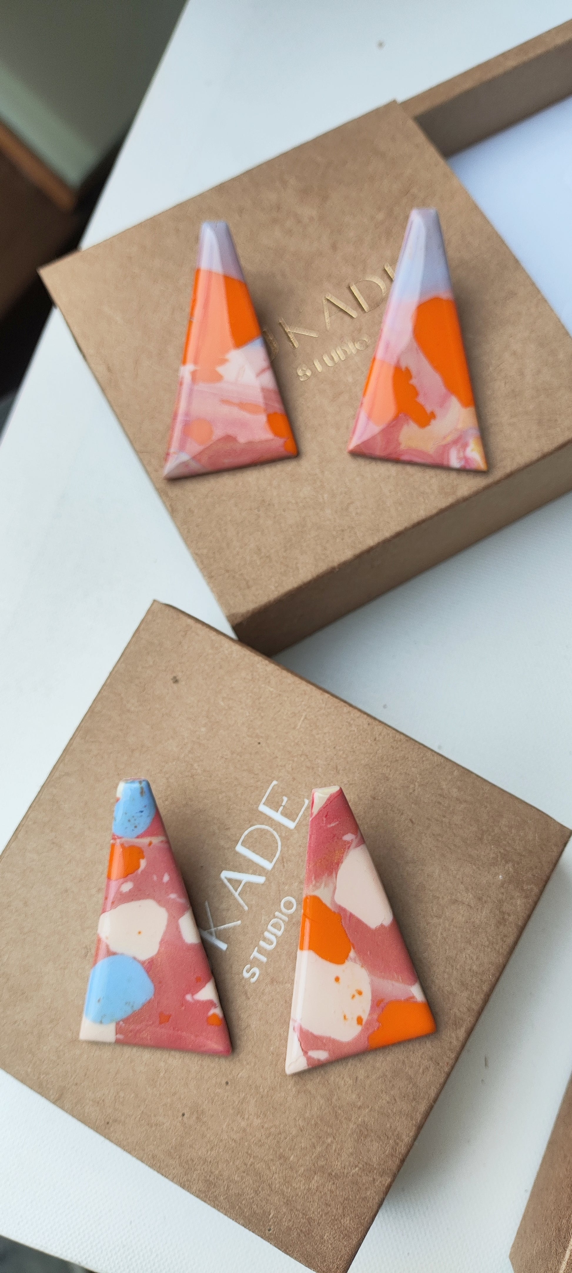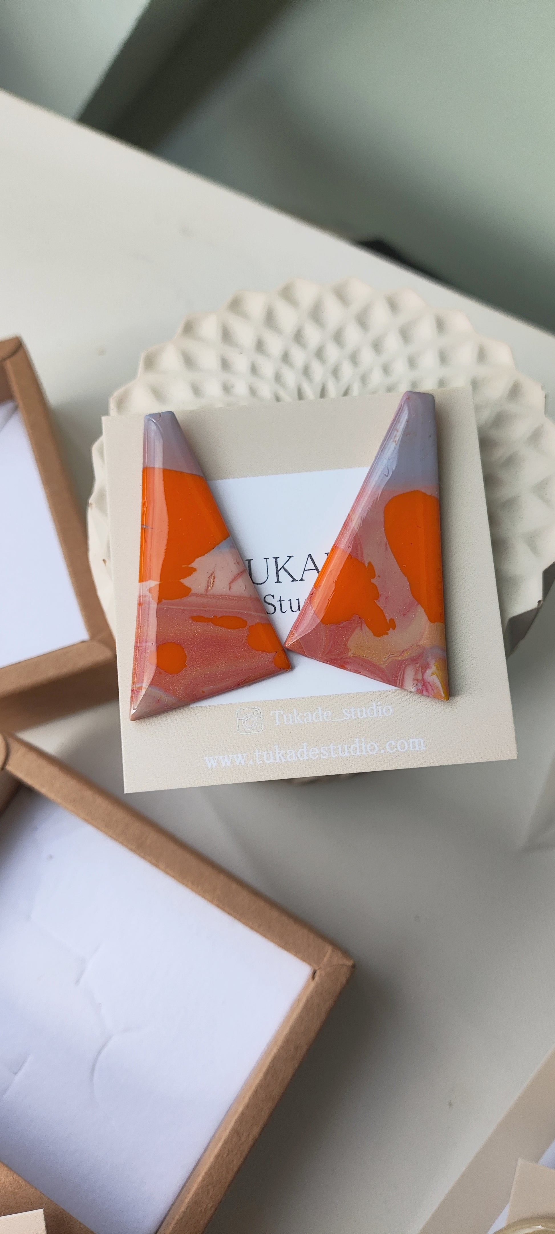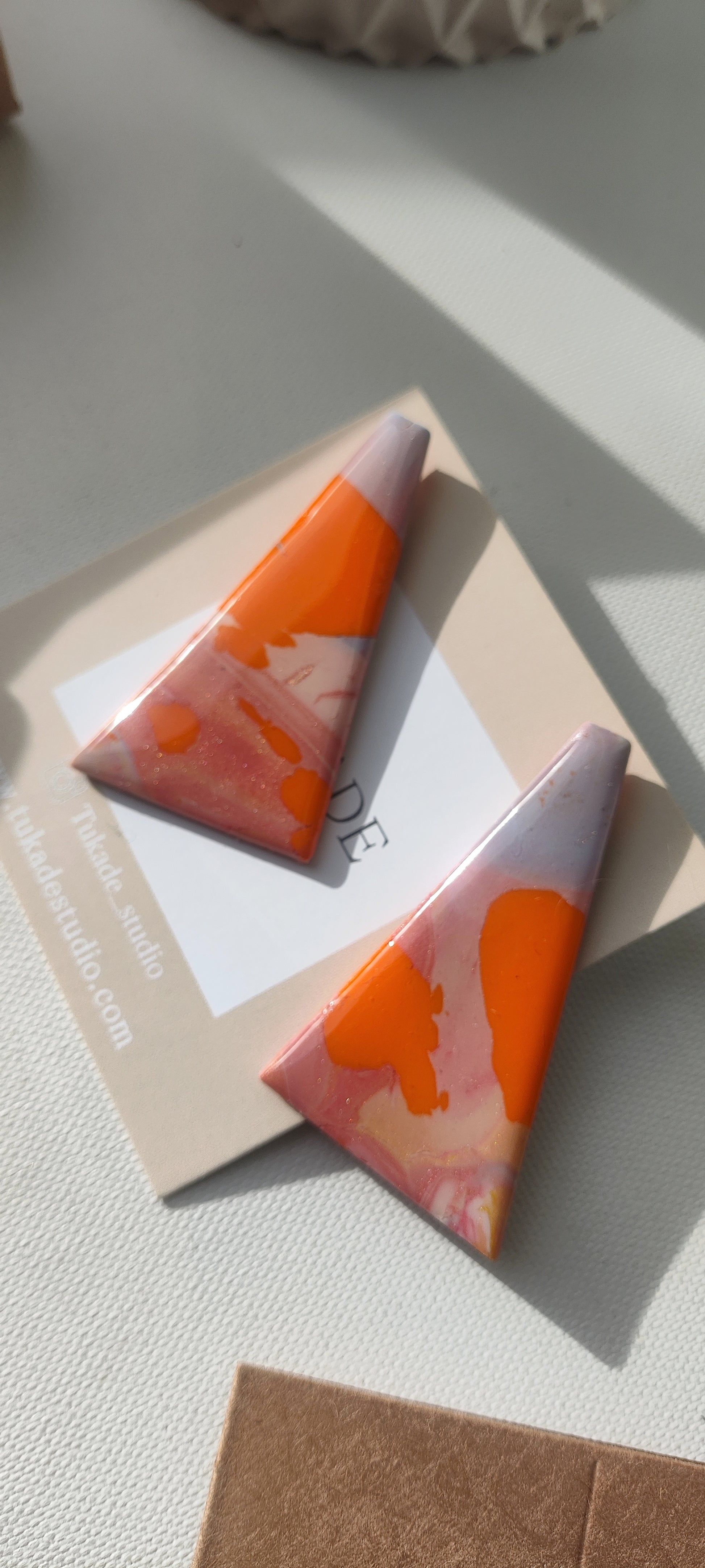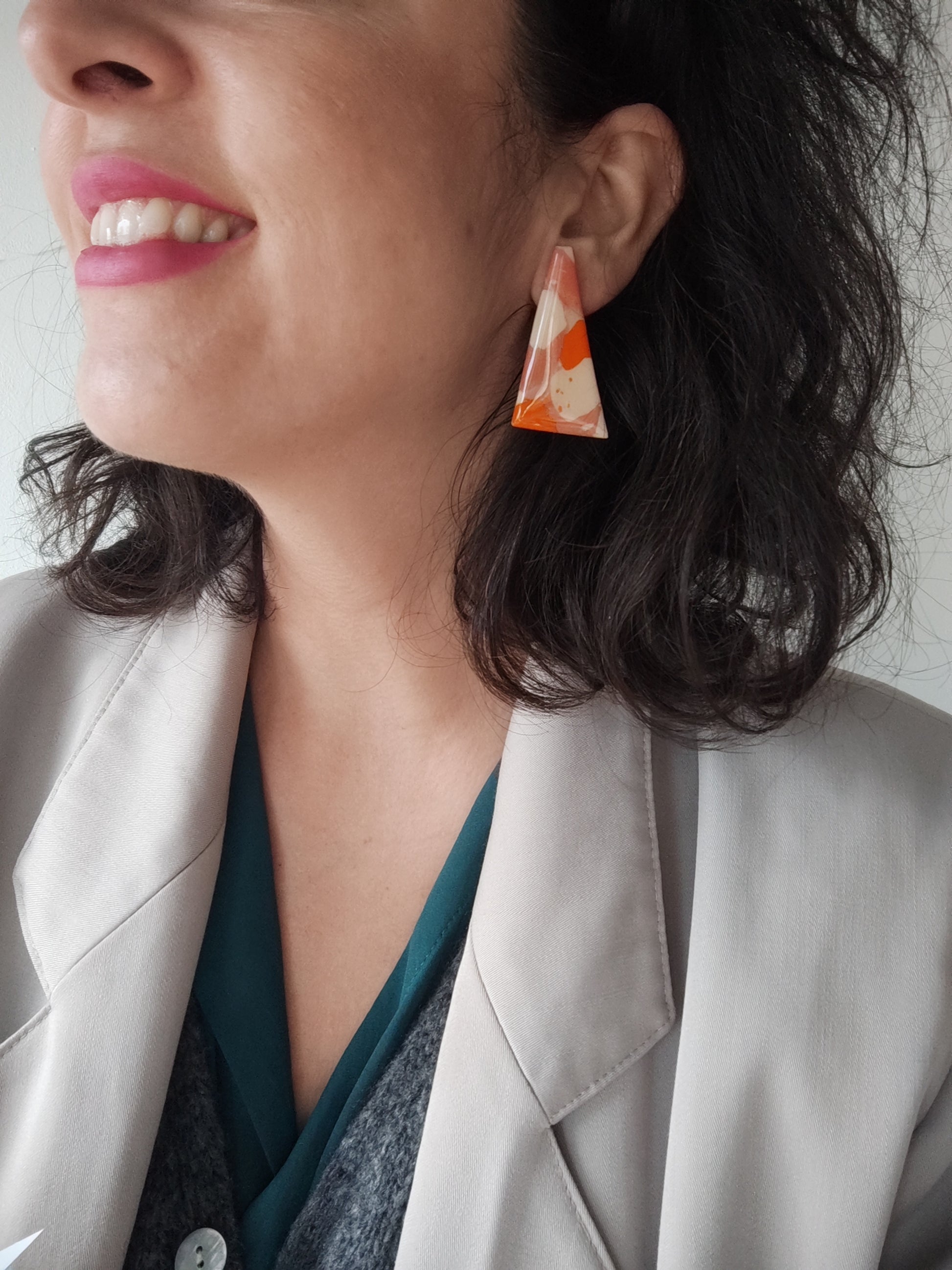 Pendientes minimalistas CANDIDA en forma geométrica irregular, mezcla de colores y acabado brillo en resina. Cada par es único e irrepetible.