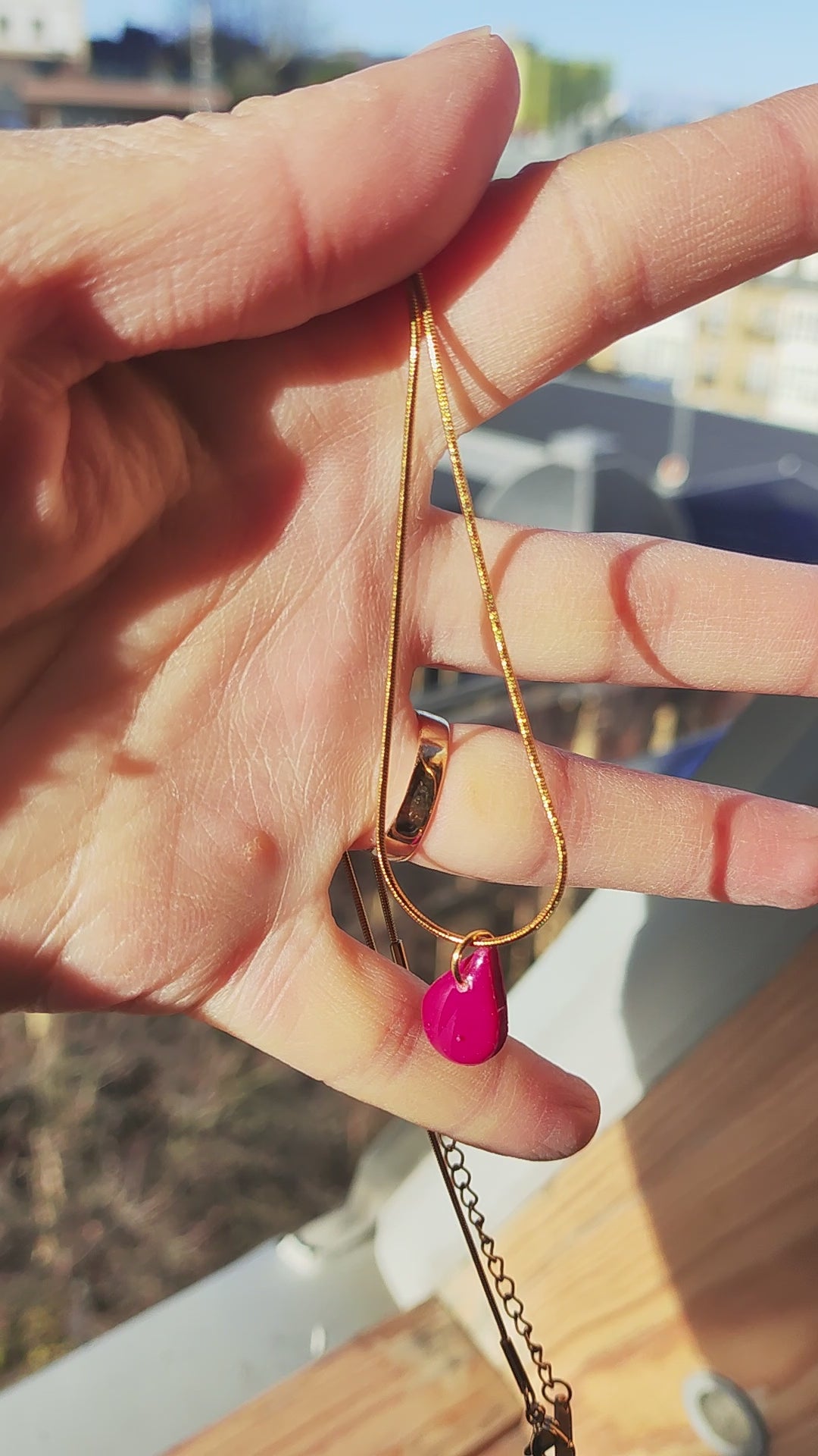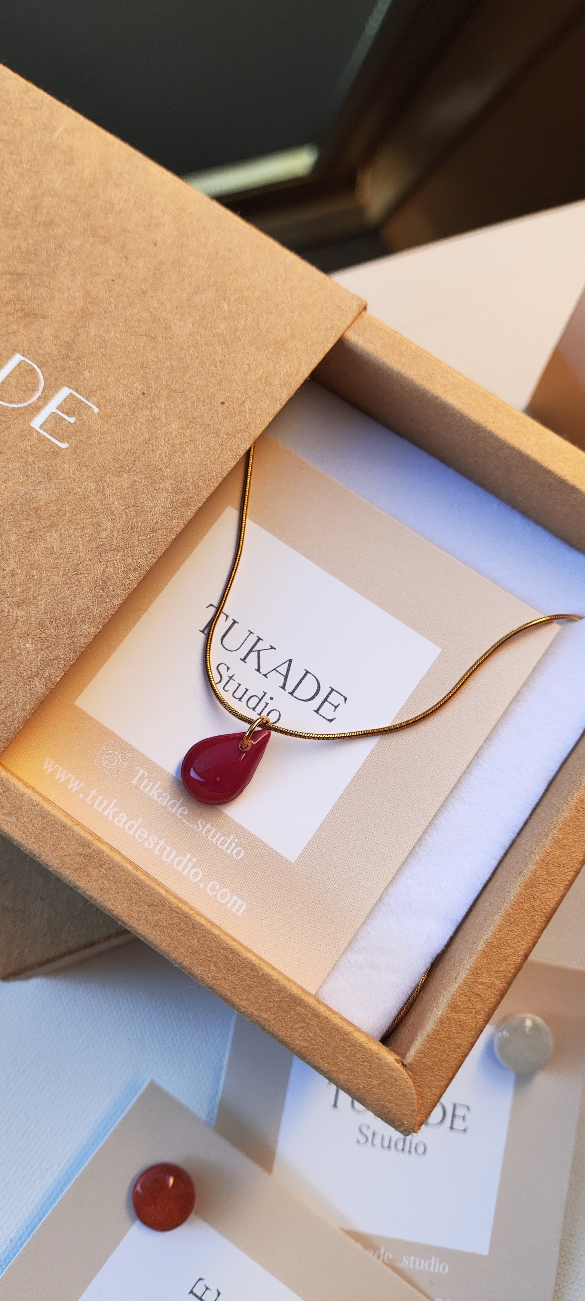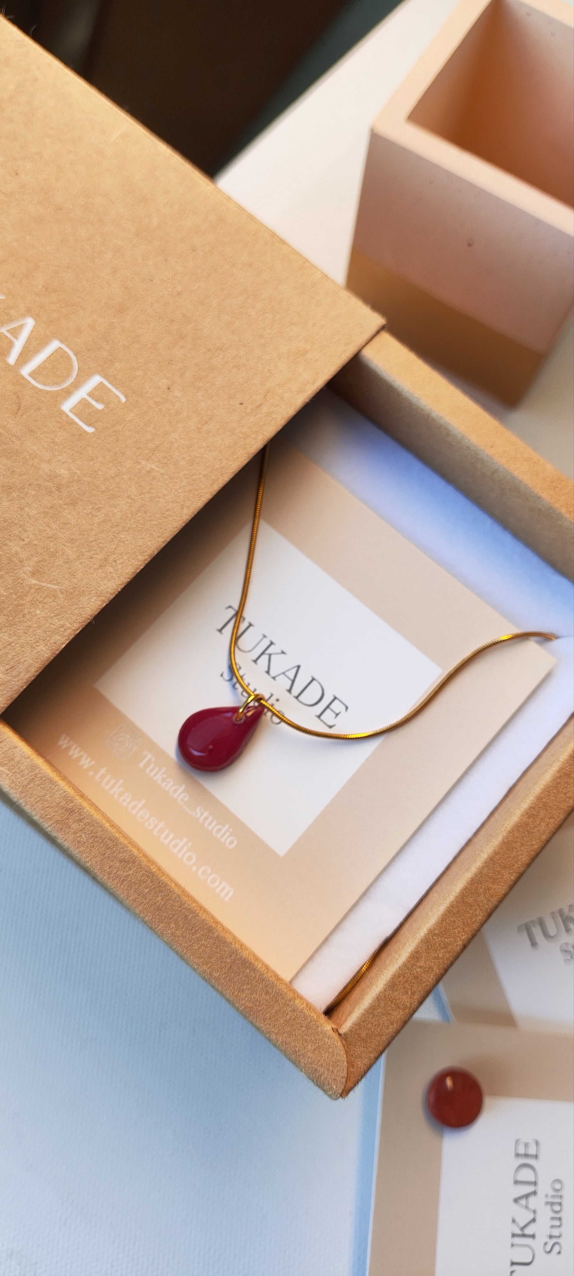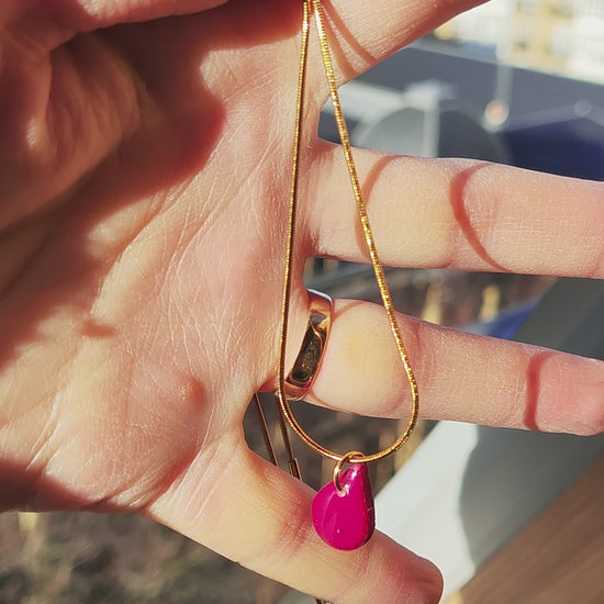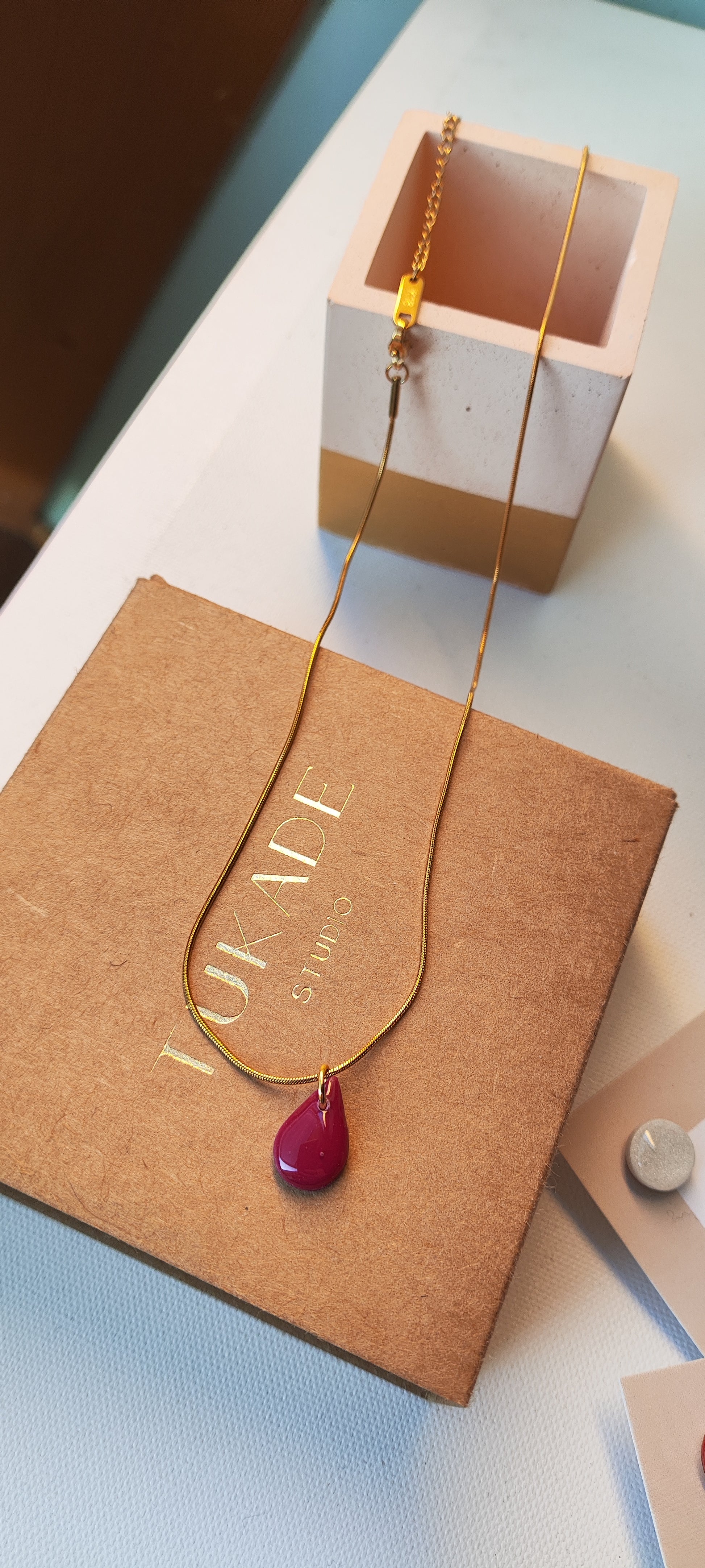 Collar-gargantilla con cadena de acero inoxidable tipo rulo con baño de oro y colgante Tukade burdeos en forma de lágrima realizadoo en arcilla polimérica y acabado en brillo resina