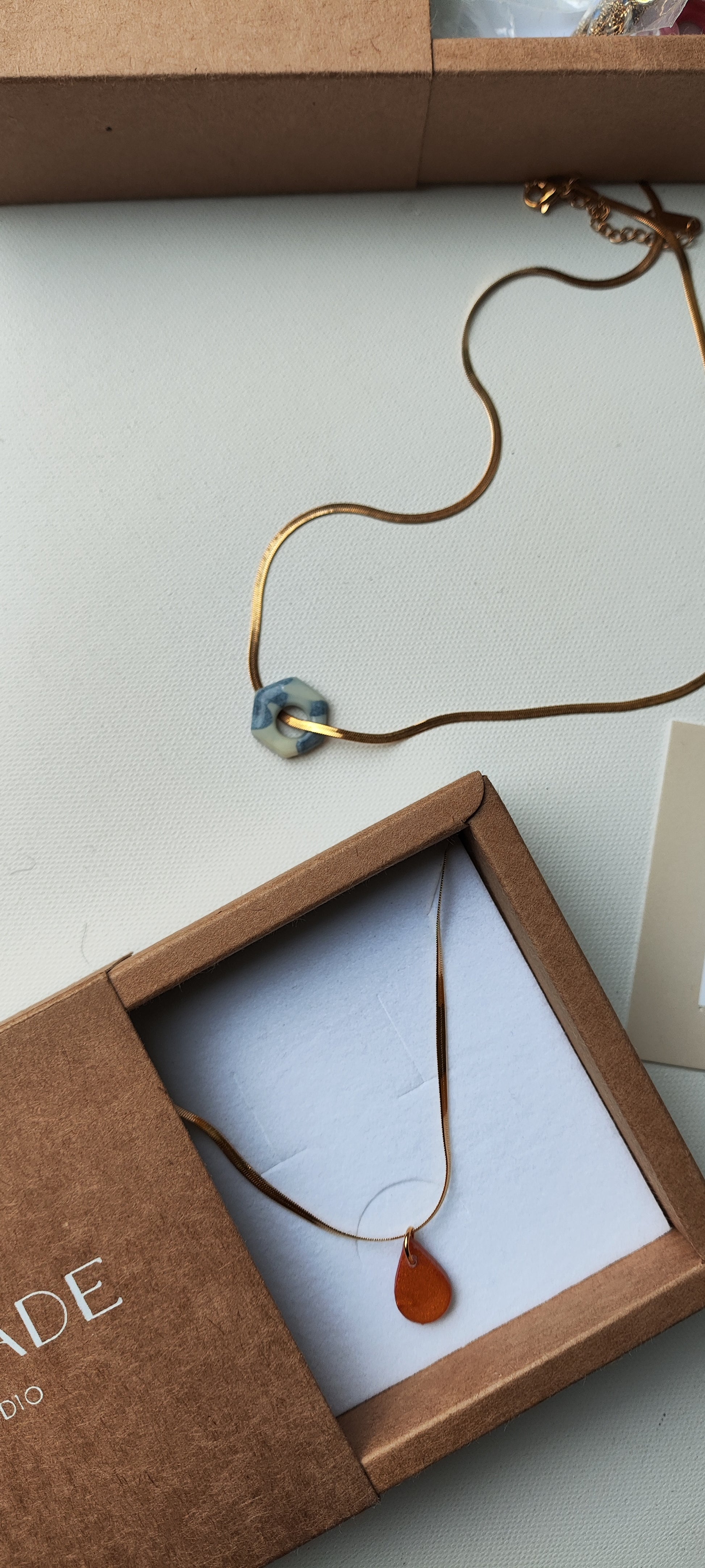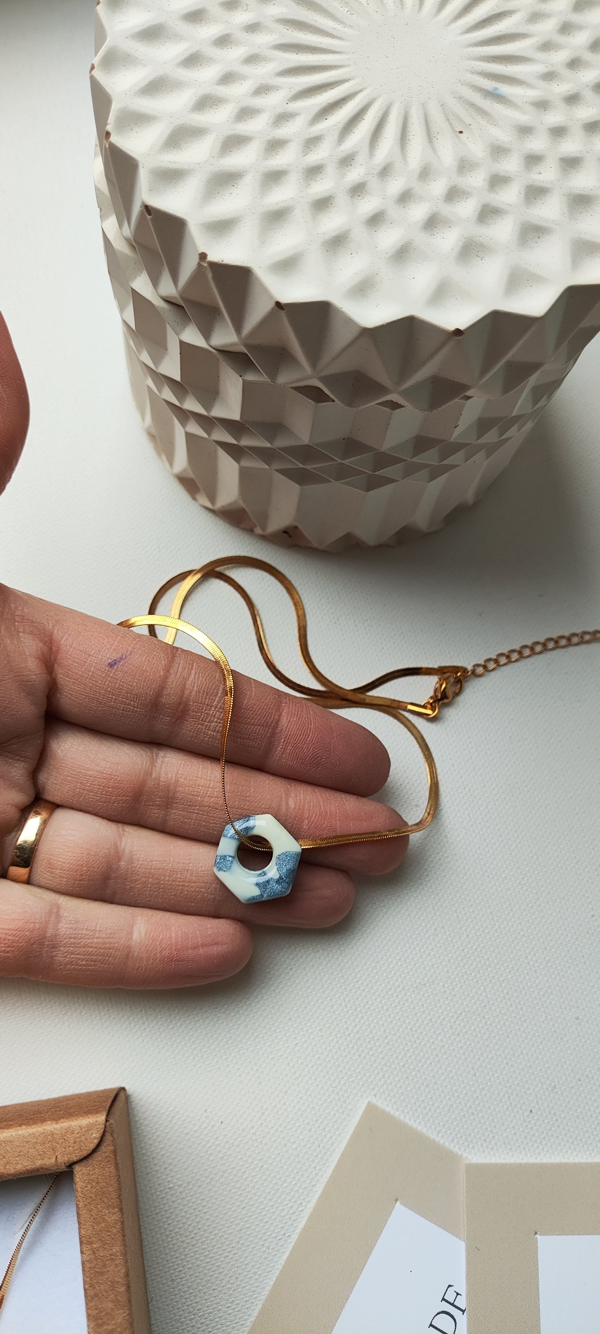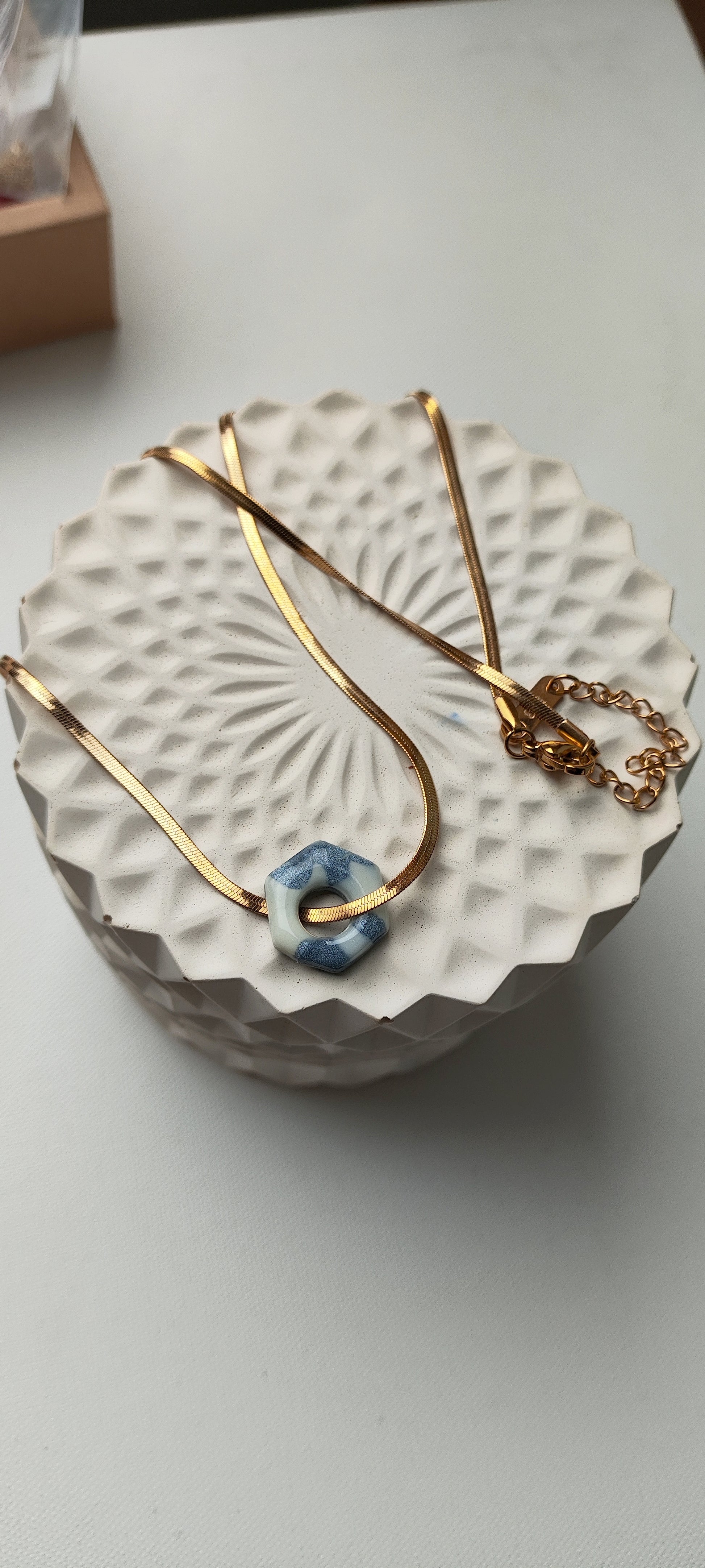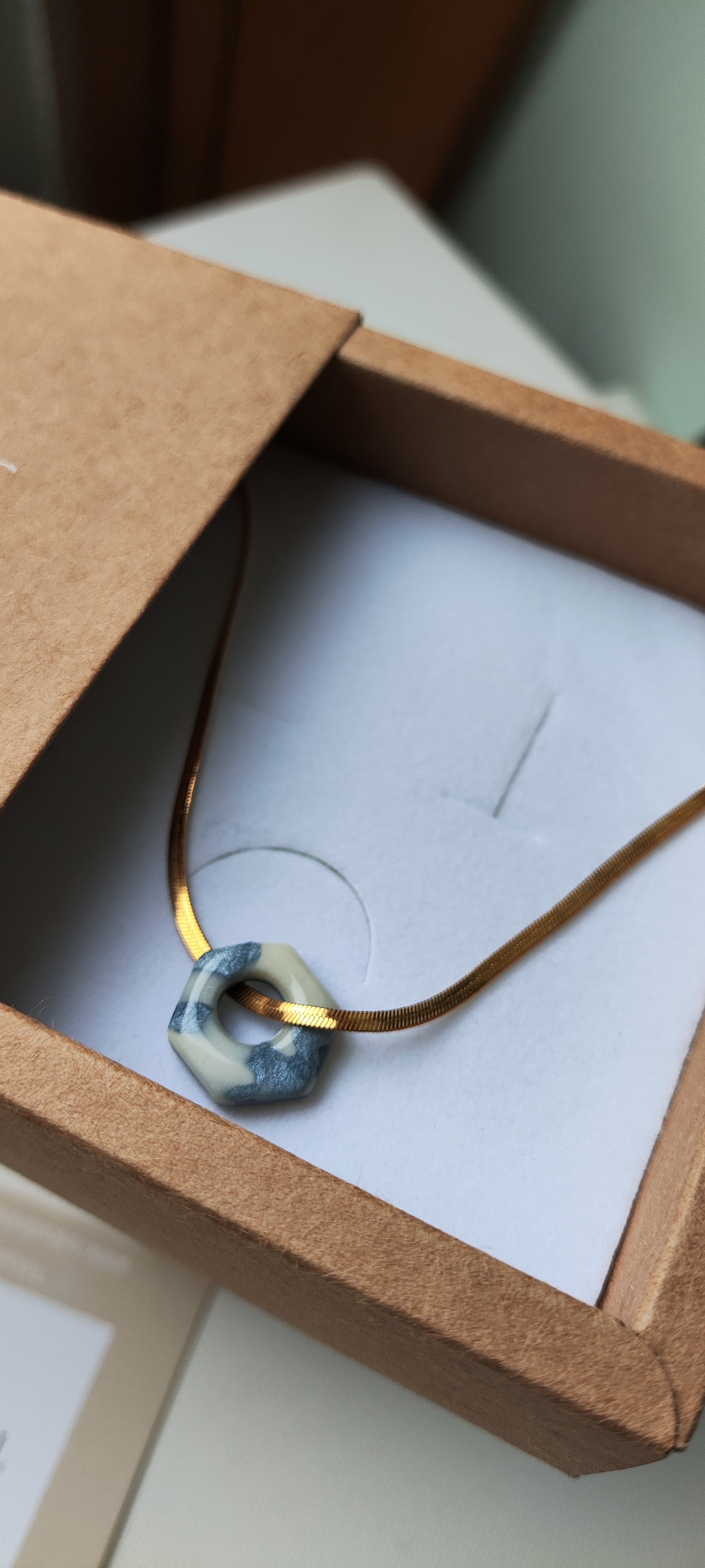 Collar-gargantilla con cadena plana de acero inoxidable con baño de oro y colgante Tukade hexágono azul y crudo degradado realizado en arcilla polimérica y acabado en brillo resina
