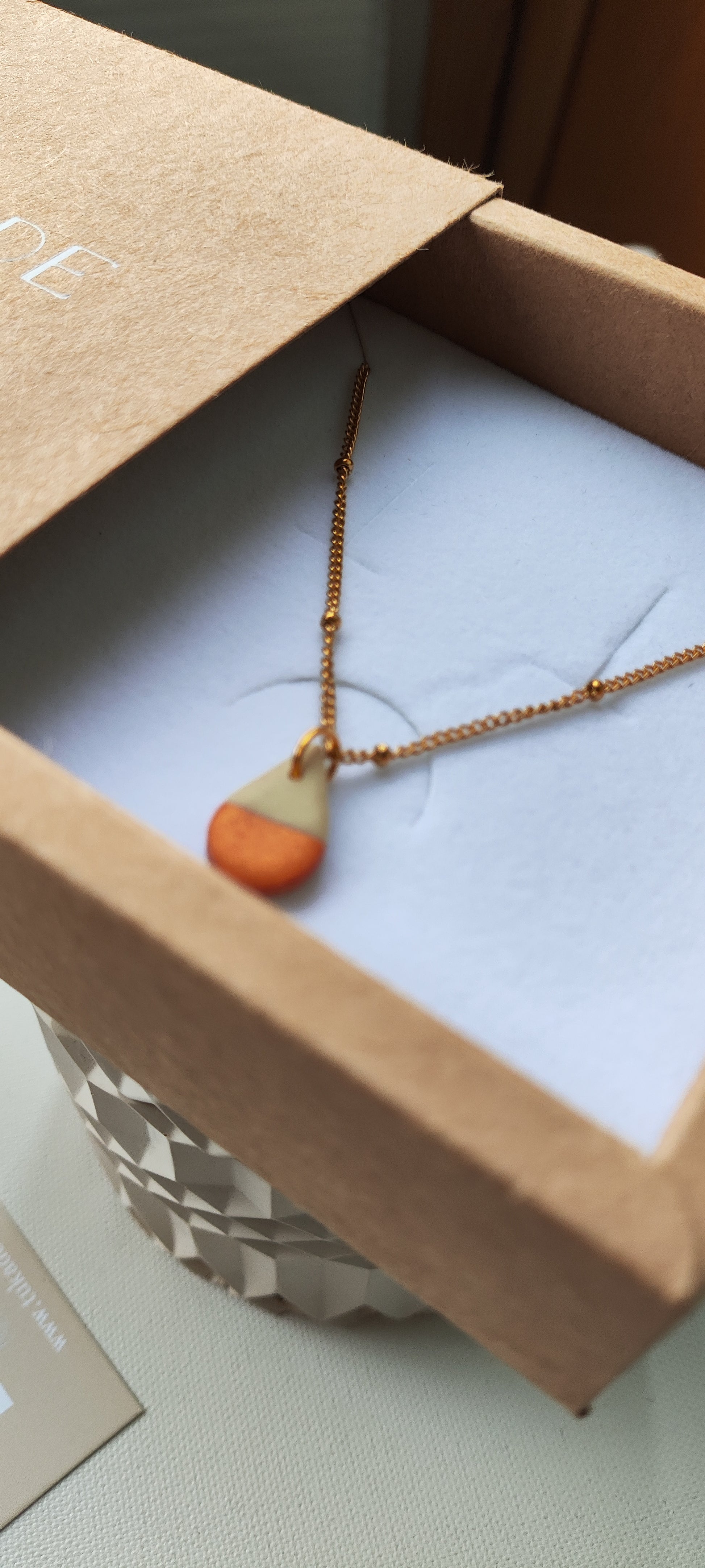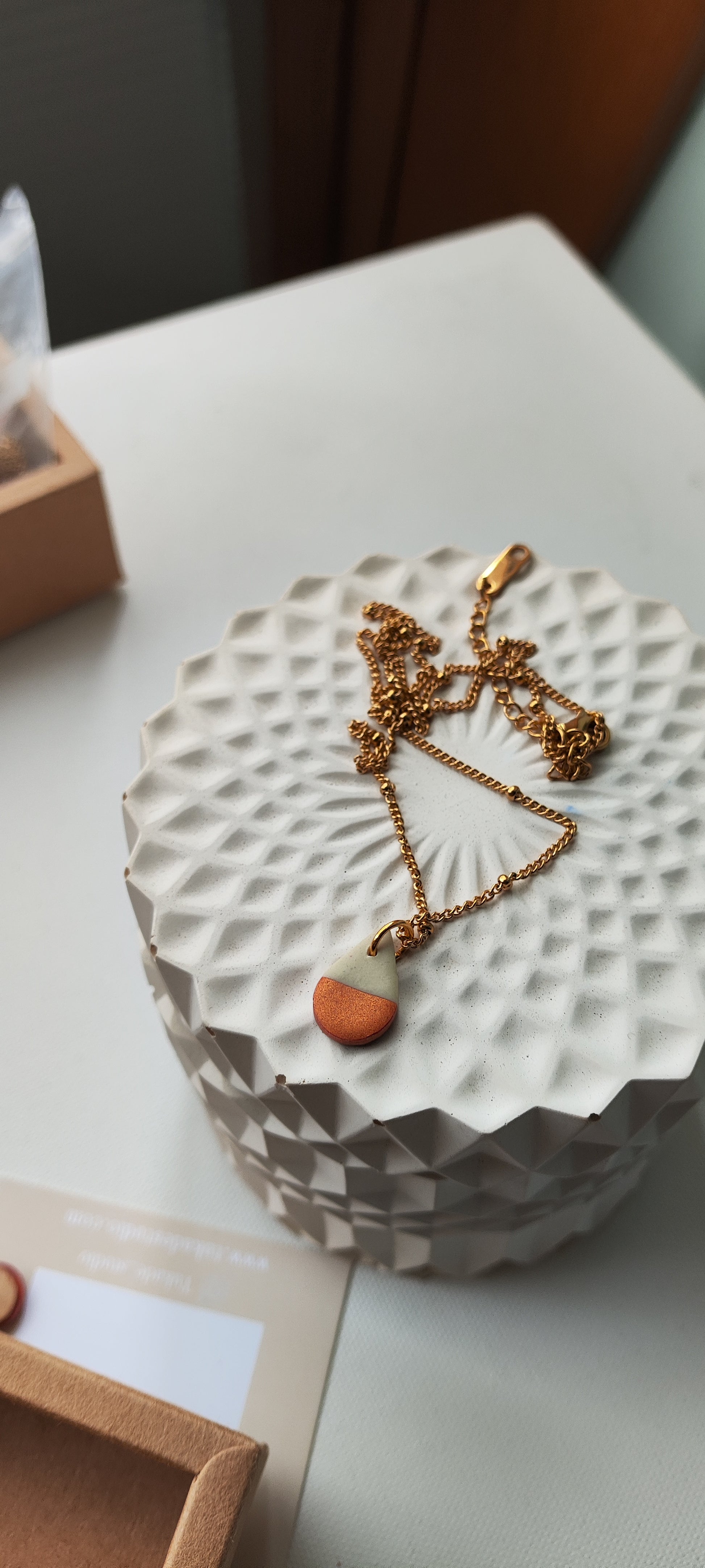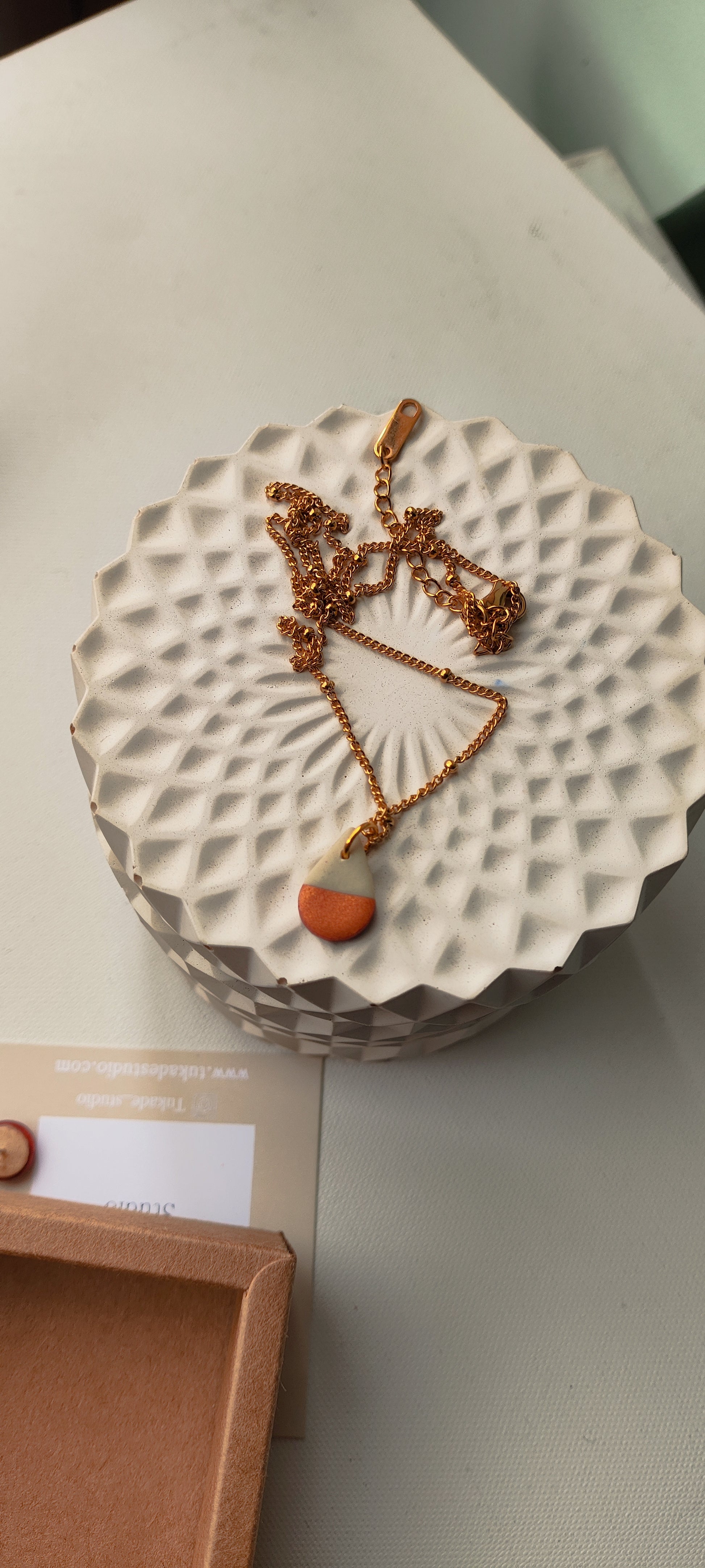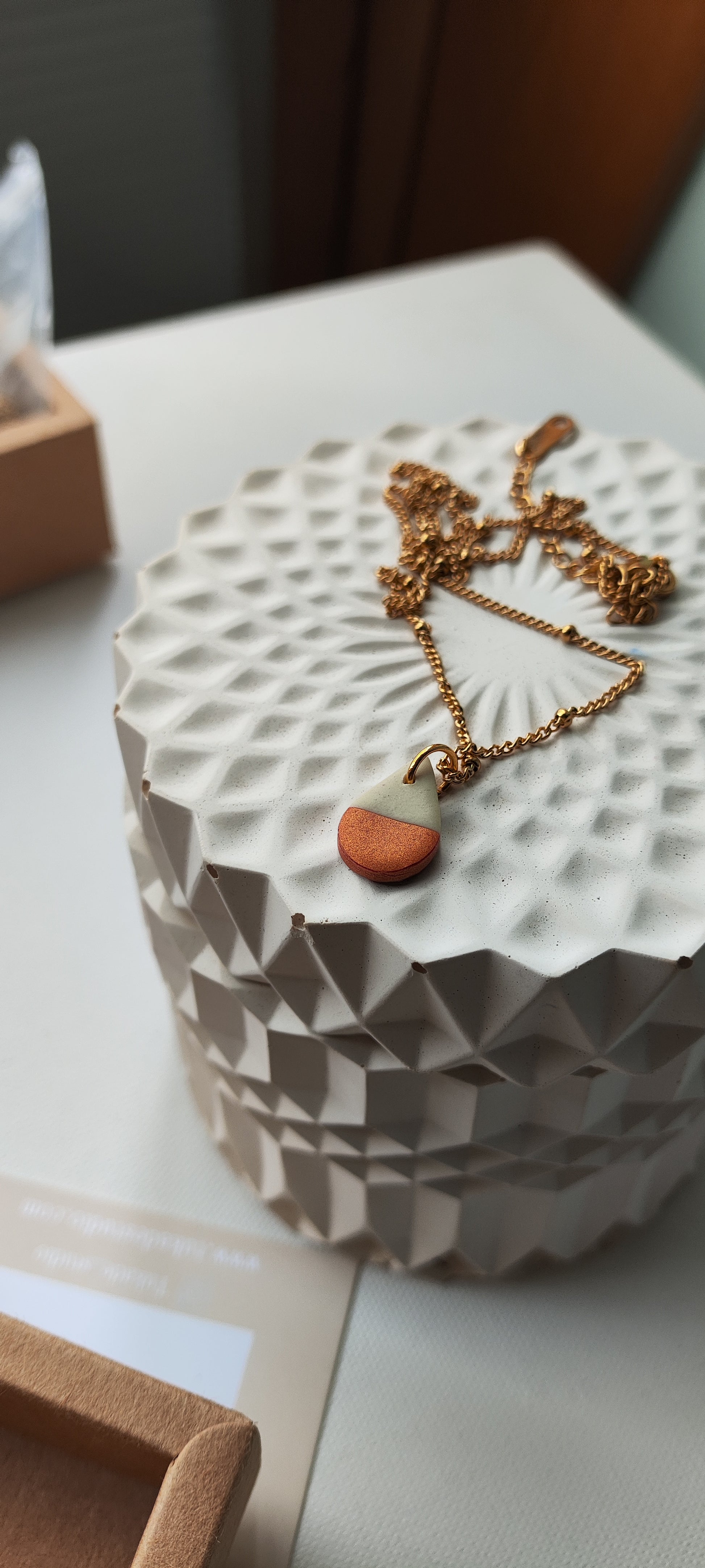 Collar-gargantilla con cadena de bonitas de acero inoxidable con baño de oro y colgante bicolor Tukade color beige y cobre en forma de lágrima realizadoo en arcilla polimérica.