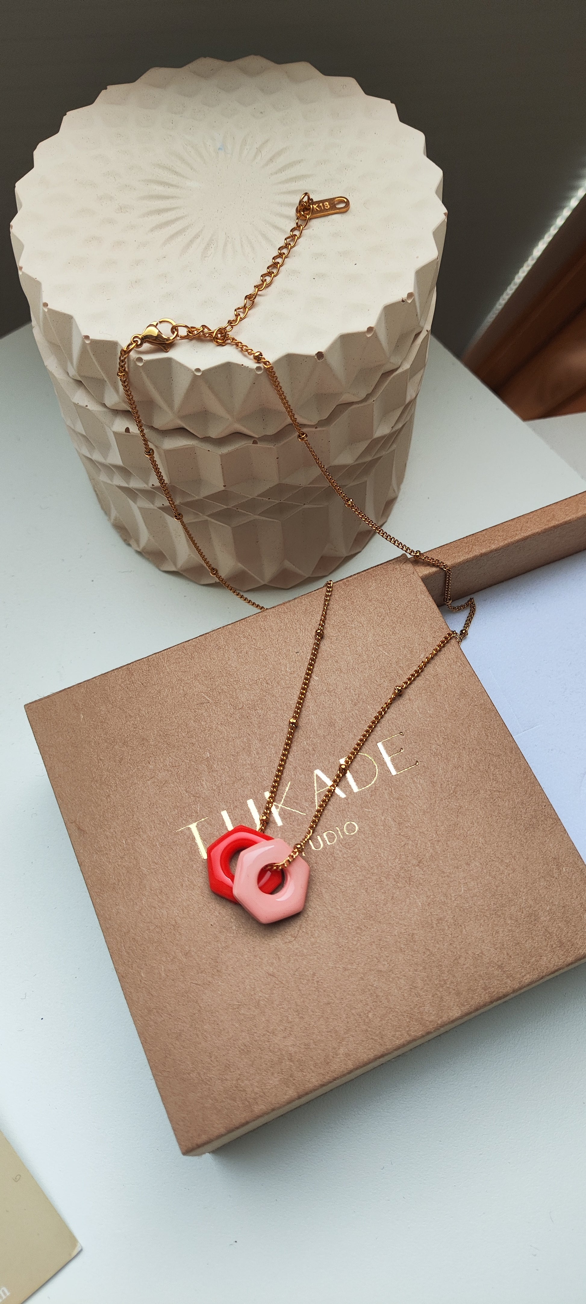 Precioso collar GILDA con dos piezas hexágono amapola y rosa y cadena con bolitas de acero inoxidable y baño en oro.
