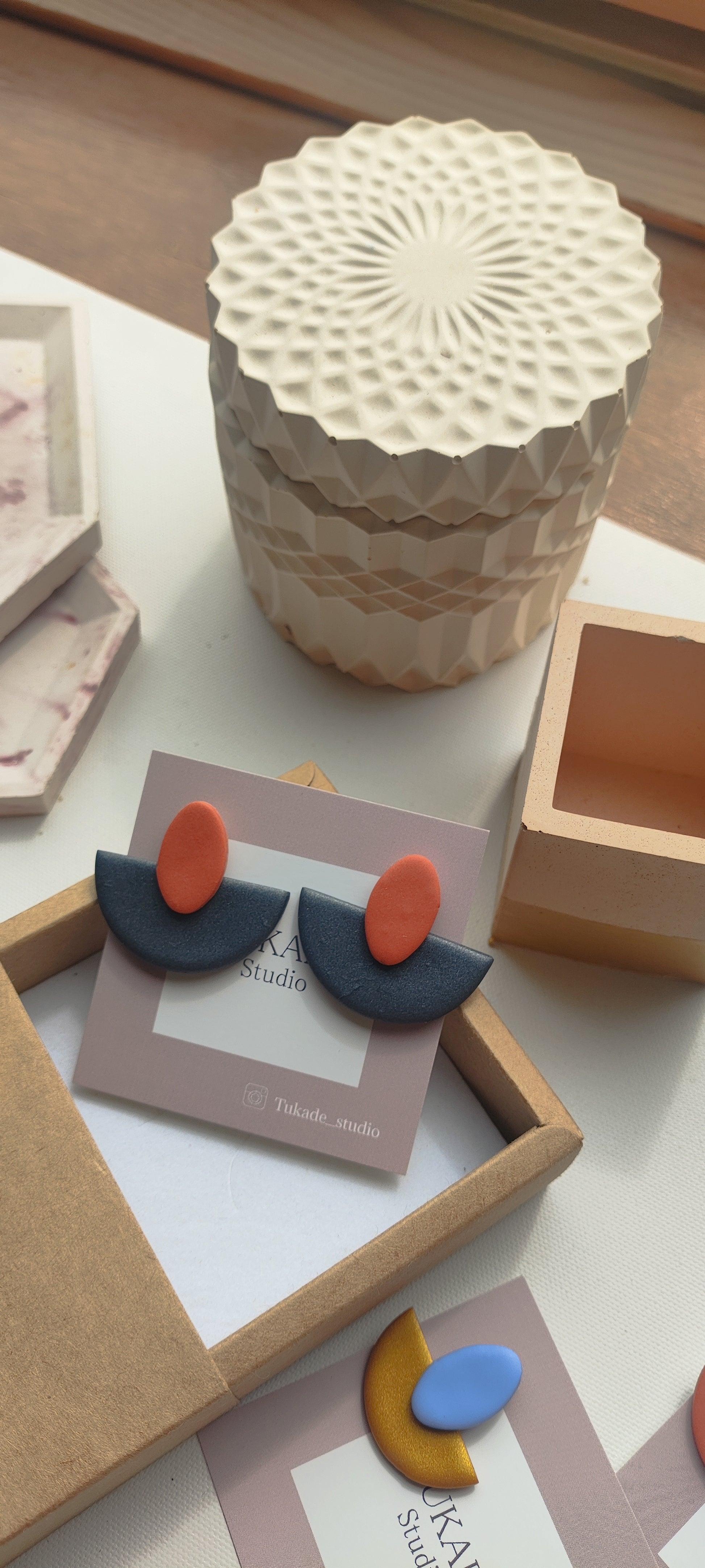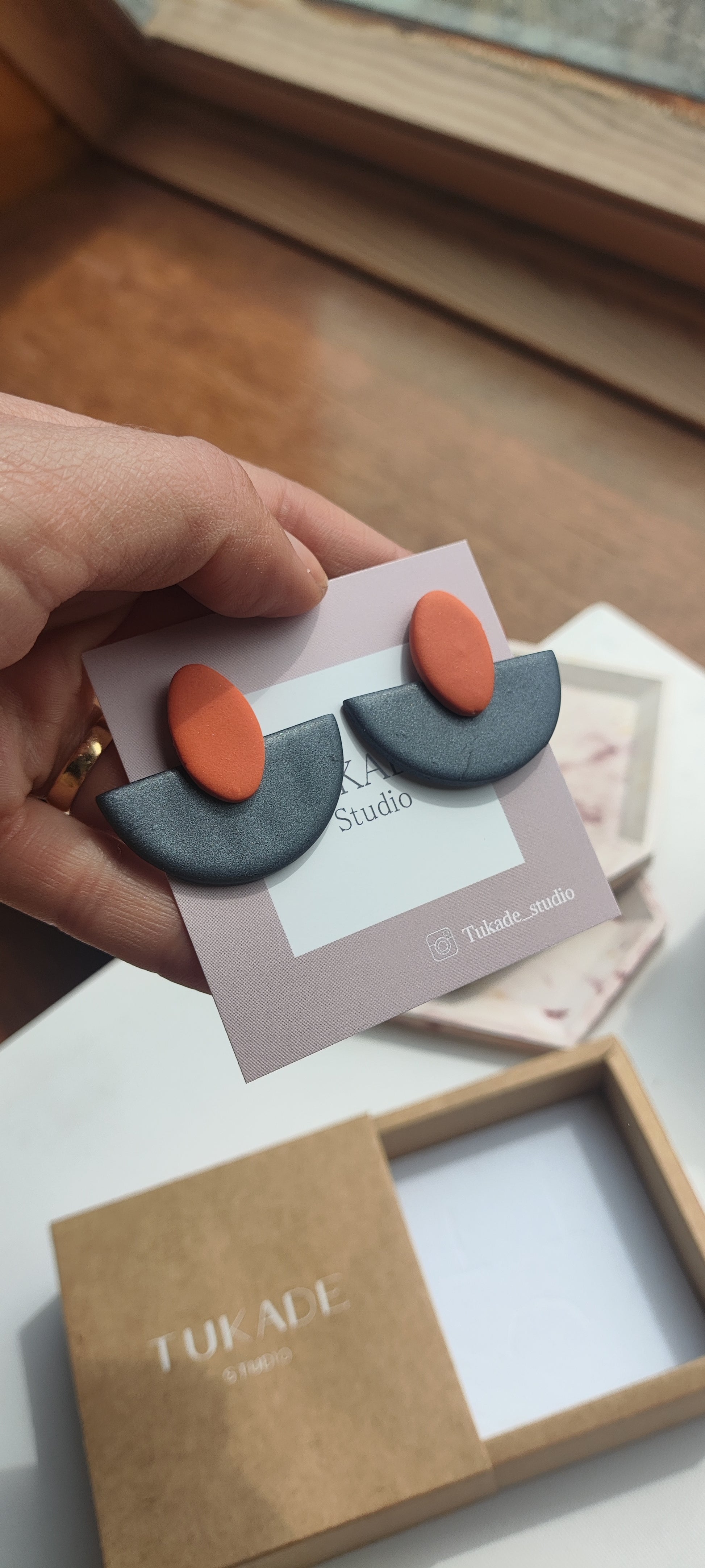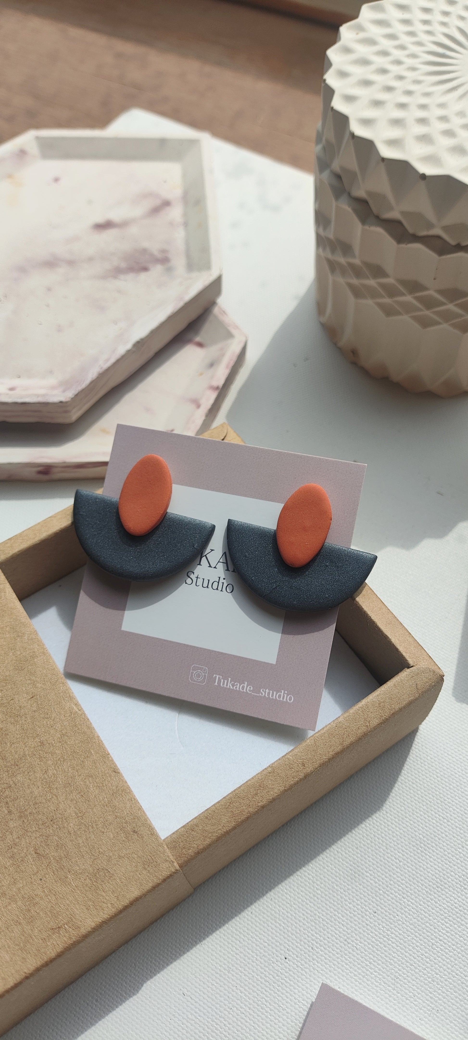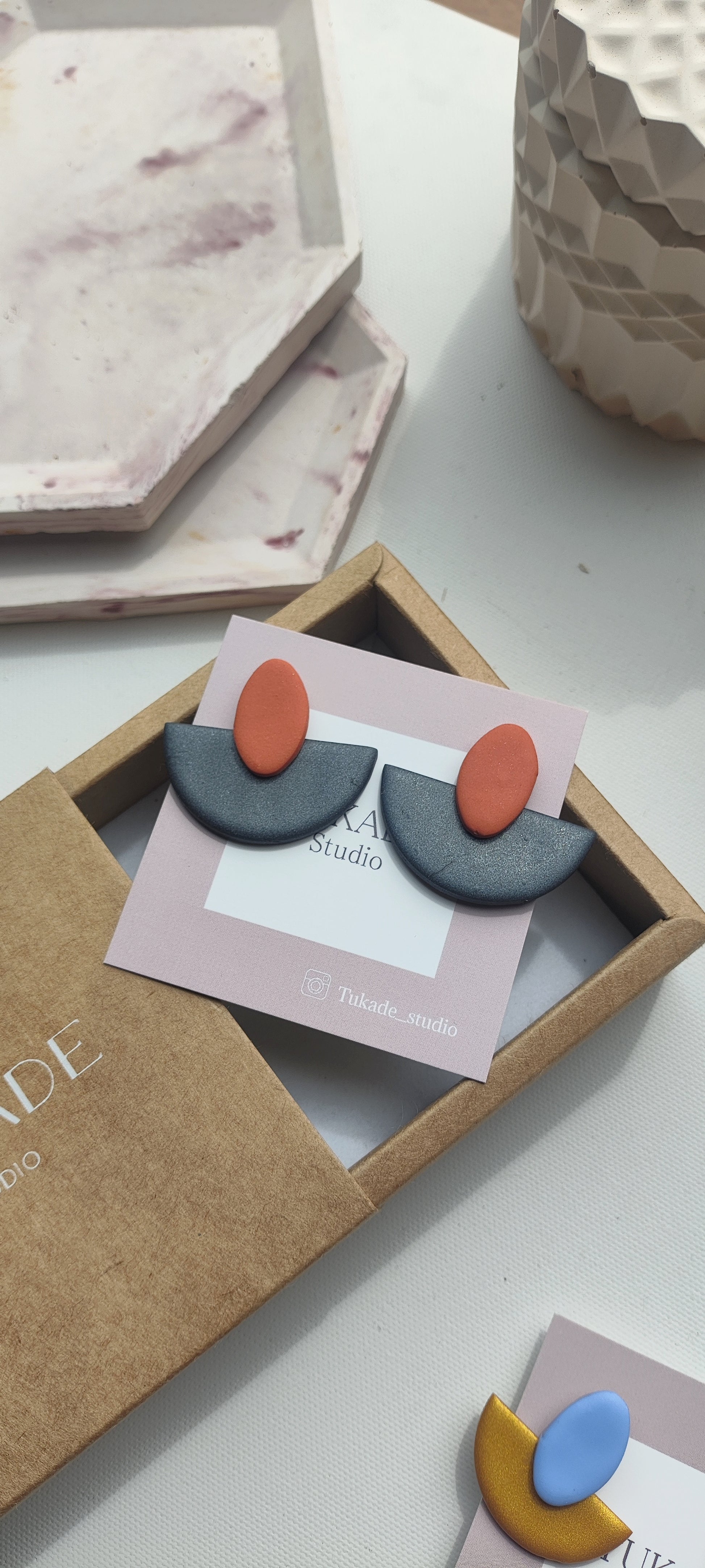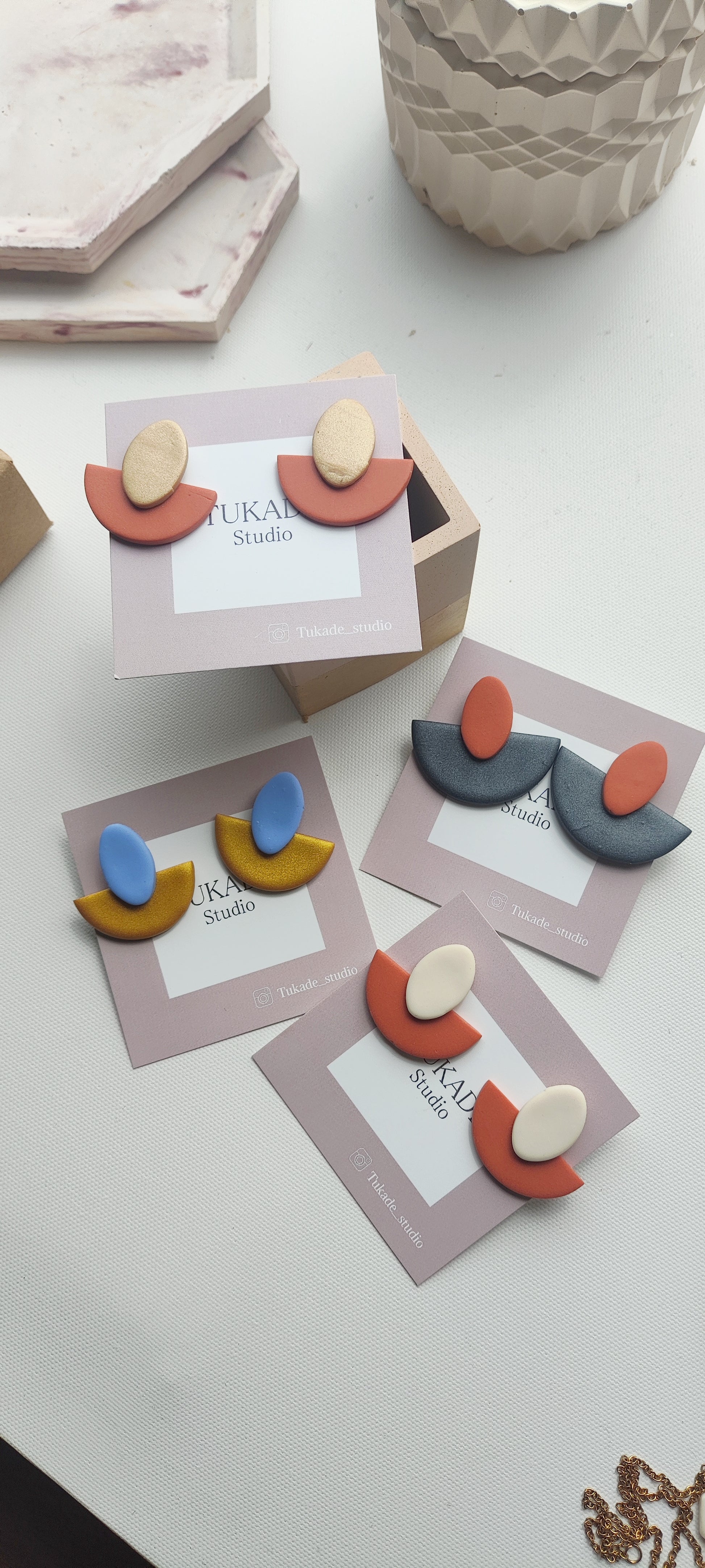 Cada par de pendientes está realizado a mano con mucho cuidado y cariño, con todo su proceso desde el modelado, corte, varios horneados, lijado y pulido.