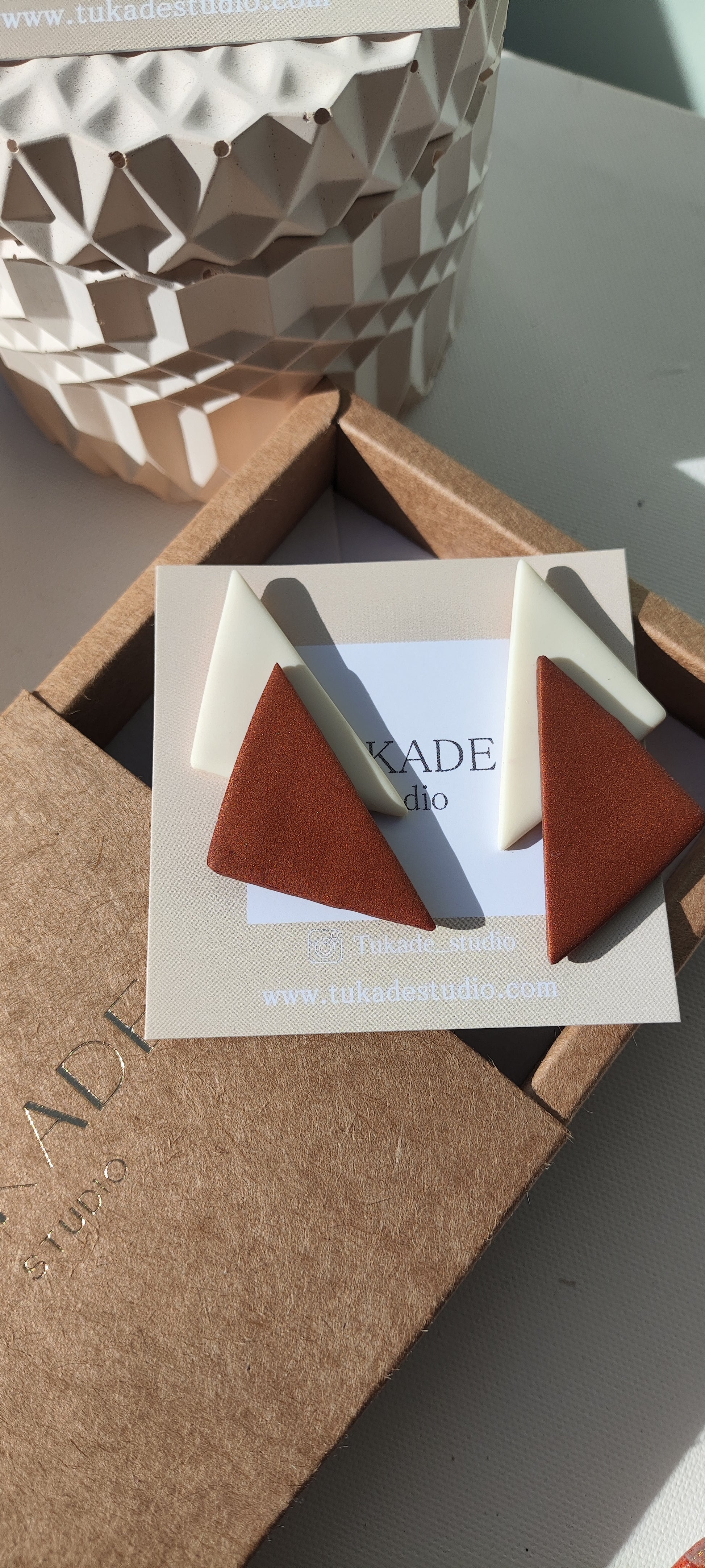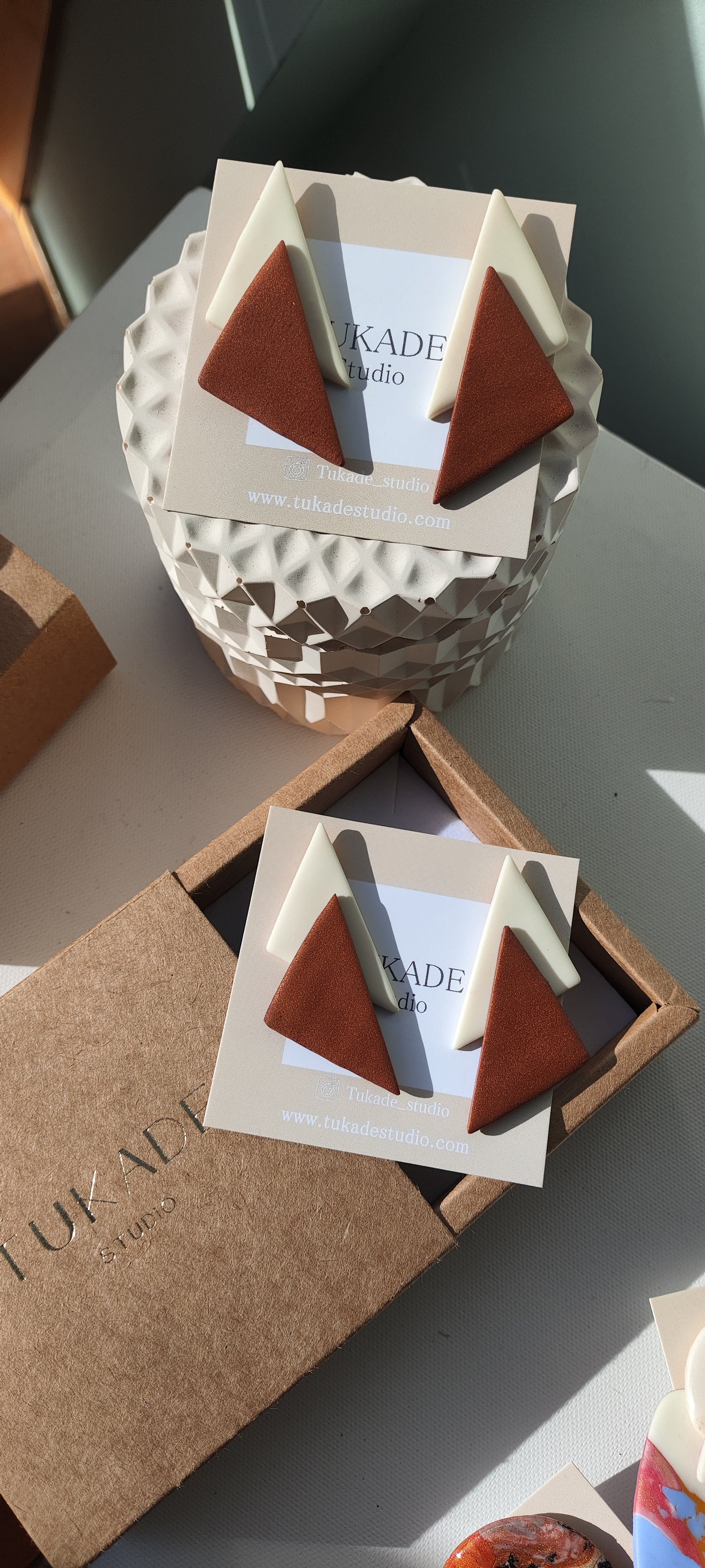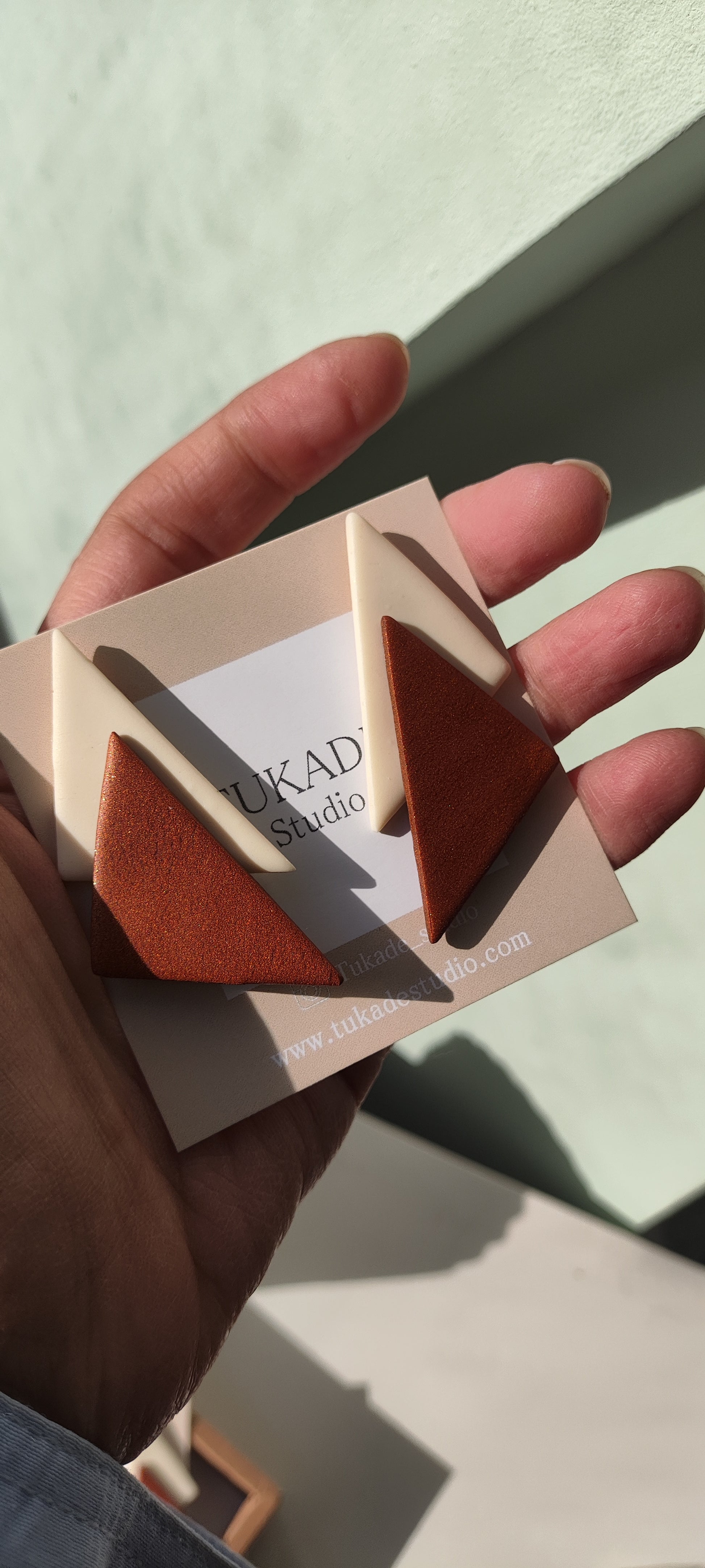 Pendientes minimalistas IVETTE en forma de doble triángulo, en color chocolate y crudo.