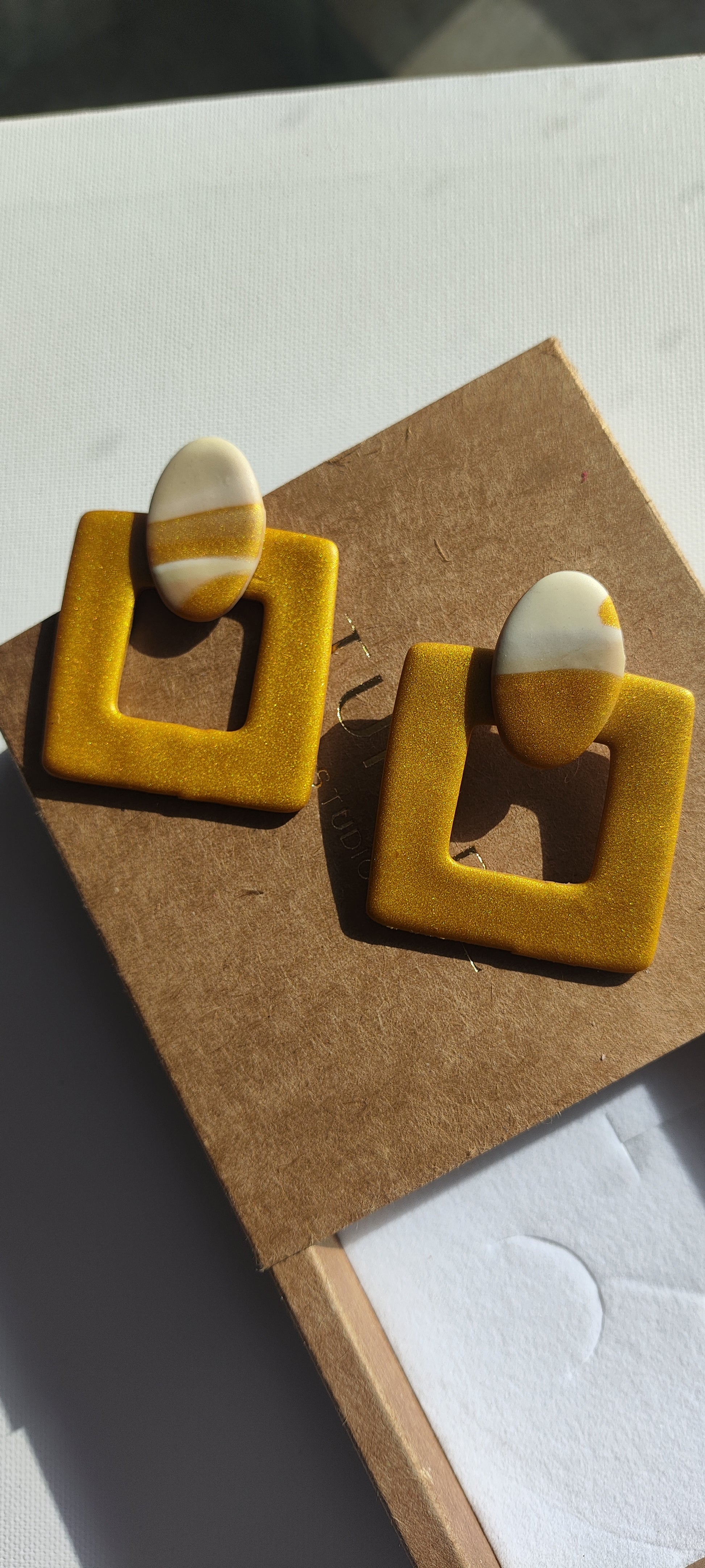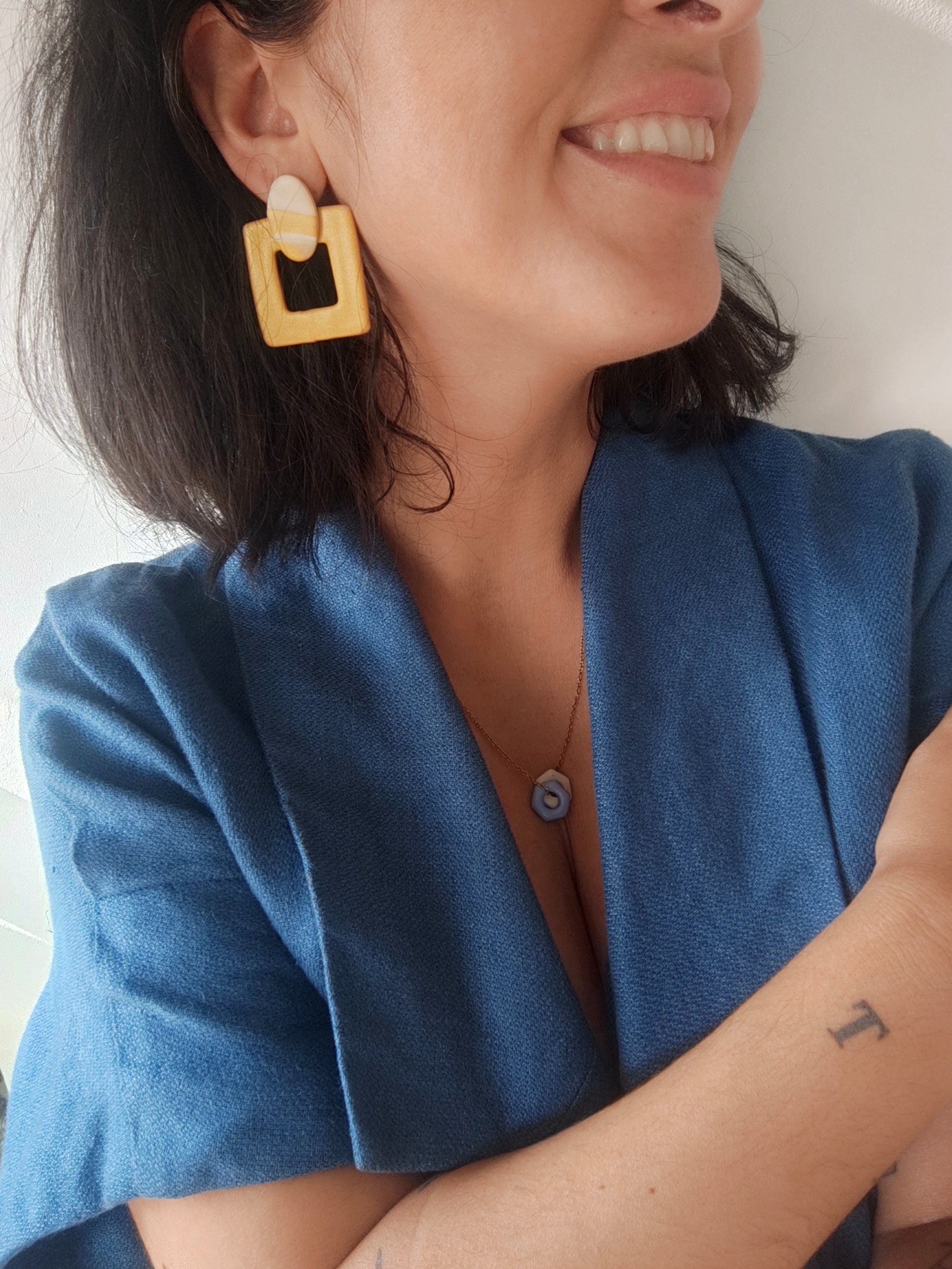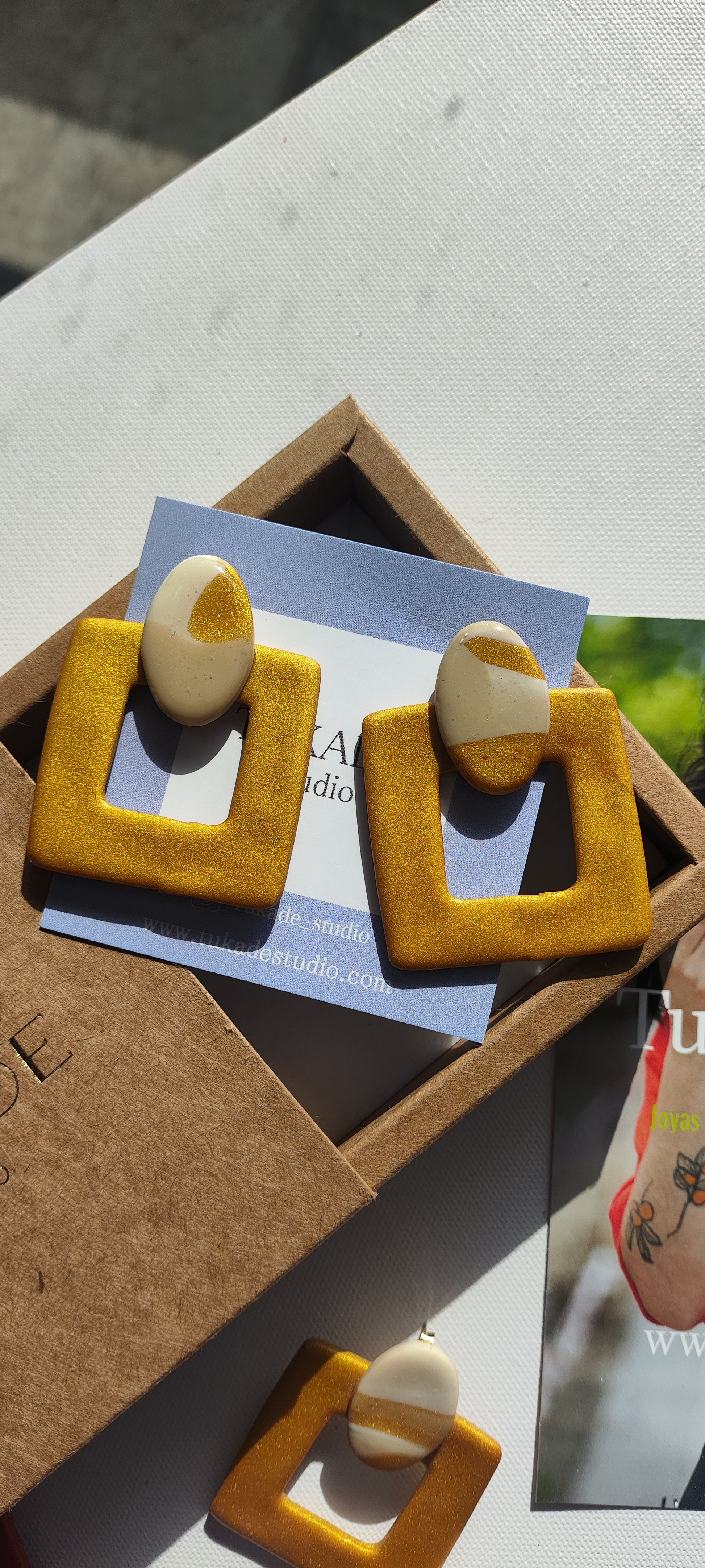 Pendientes JIMENA en forma cuadrada y óvalo. Color ocre metalizado y crudo degradado.