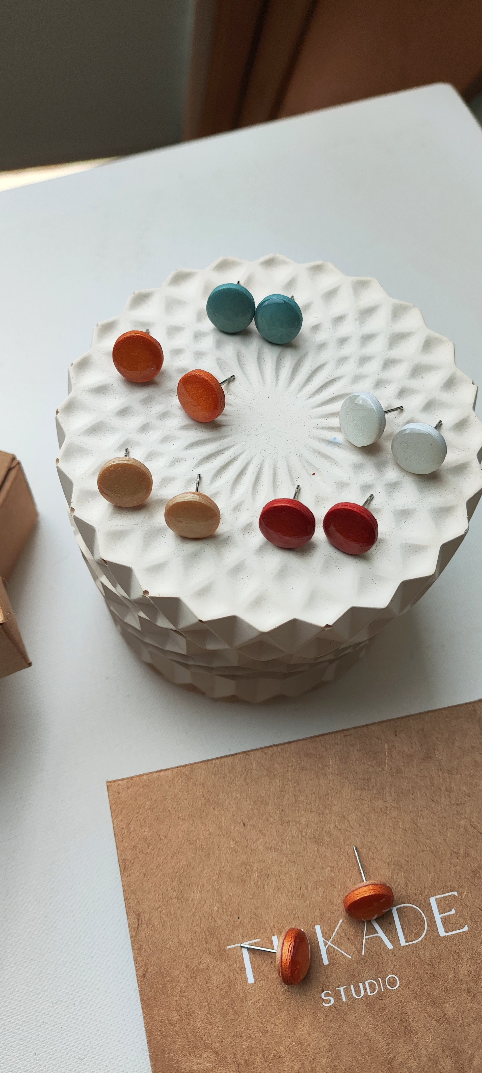 Cada par de pendientes está realizado a mano con mucho cuidado y cariño, con todo su proceso desde el modelado, corte, varios horneados, lijado y pulido.