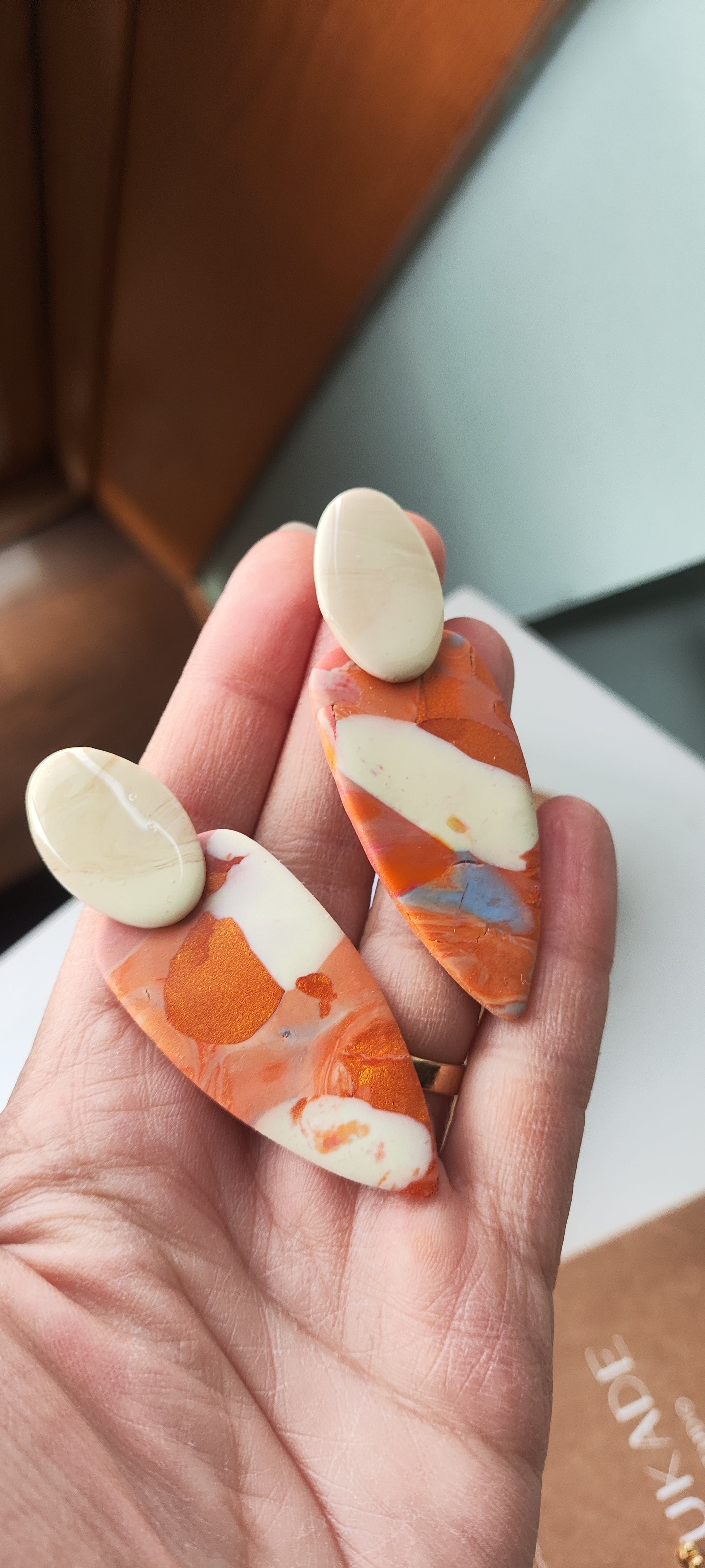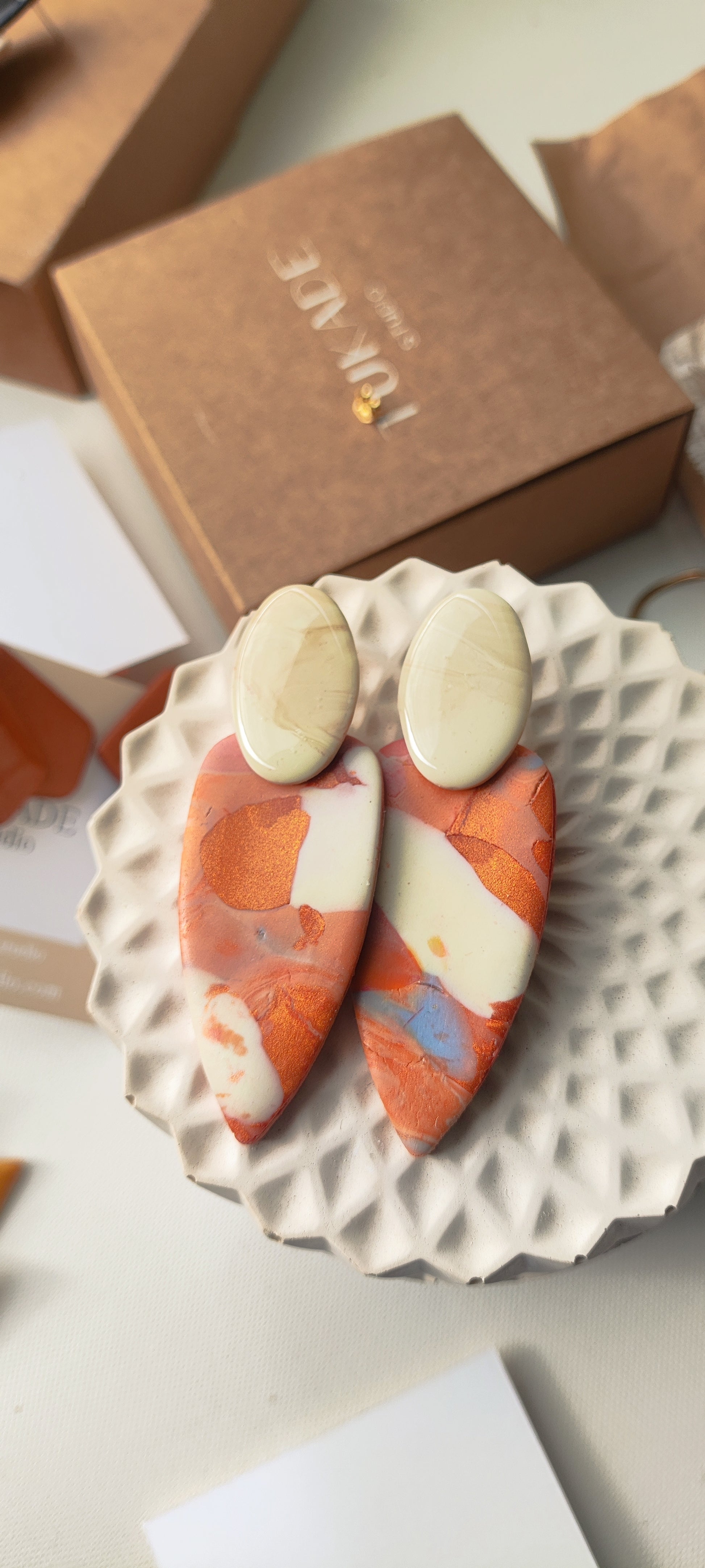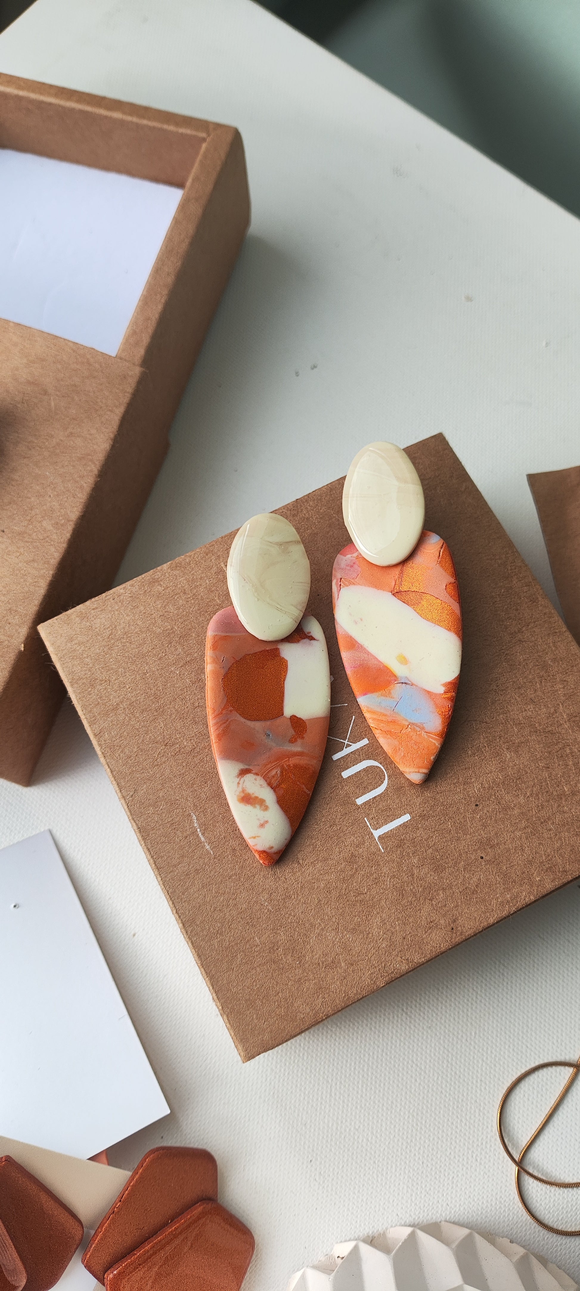 Cada par de pendientes está realizado a mano con mucho cuidado y cariño, con todo su proceso desde el modelado, corte, varios horneados, lijado y pulido.