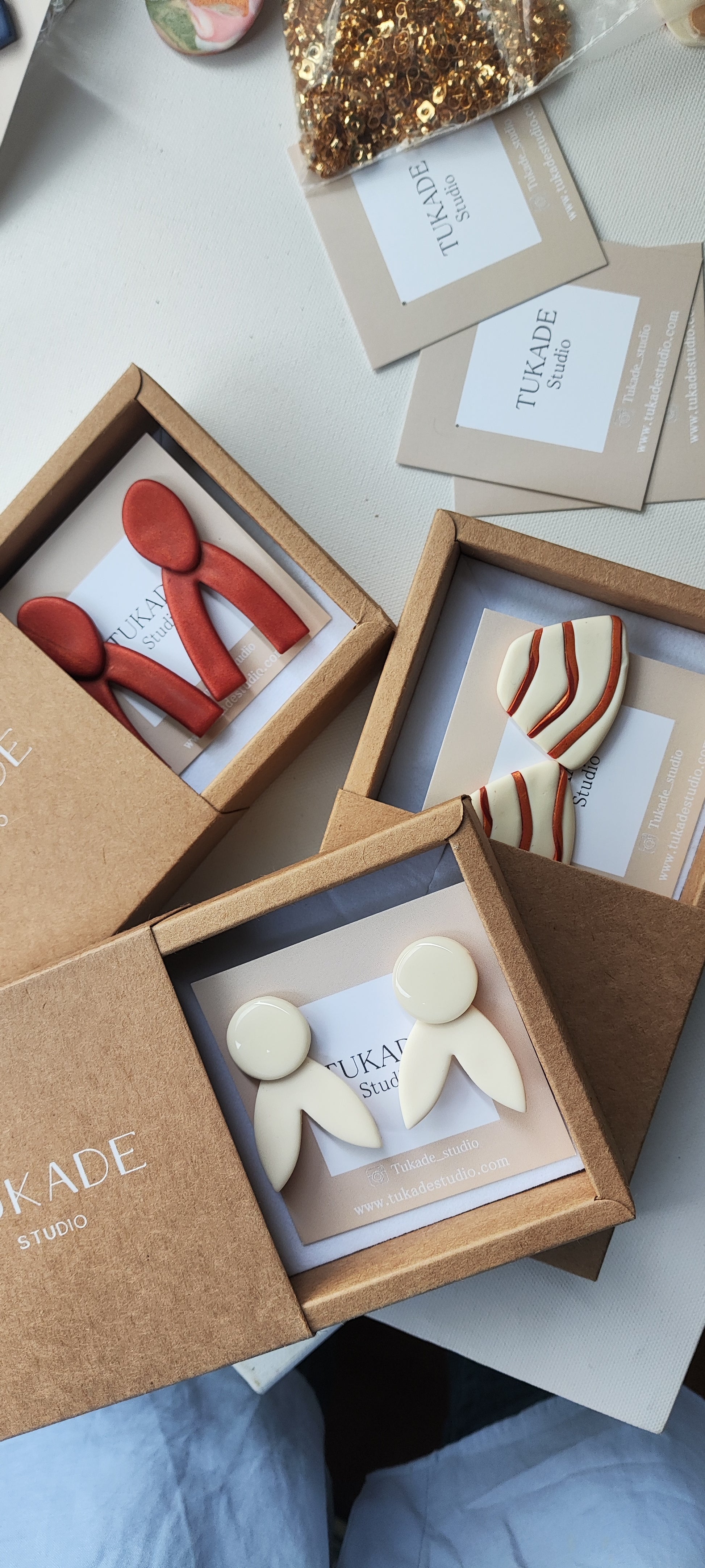 Cada par de pendientes está realizado a mano con mucho cuidado y cariño, con todo su proceso desde el modelado, corte, varios horneados, lijado y pulido.