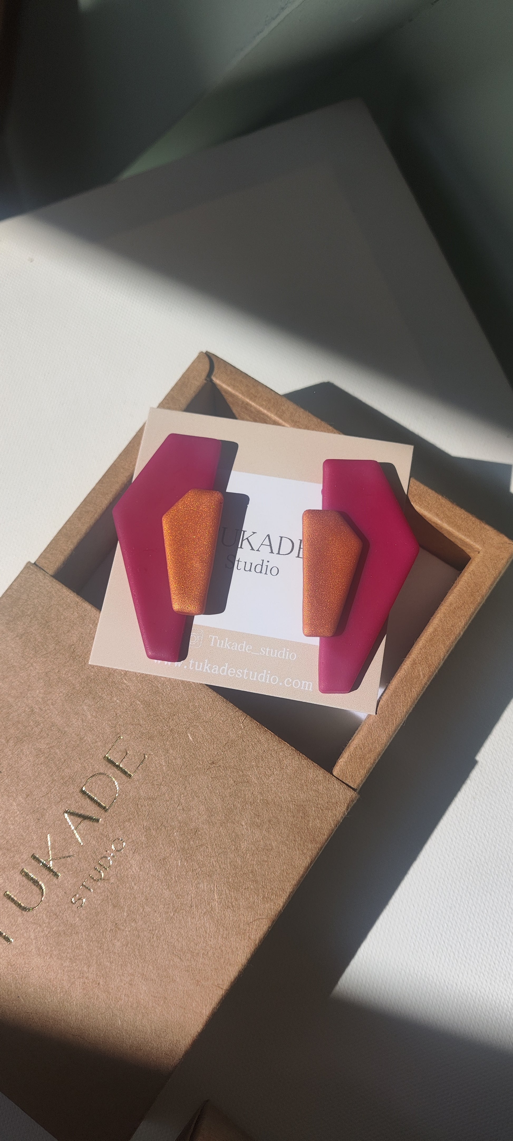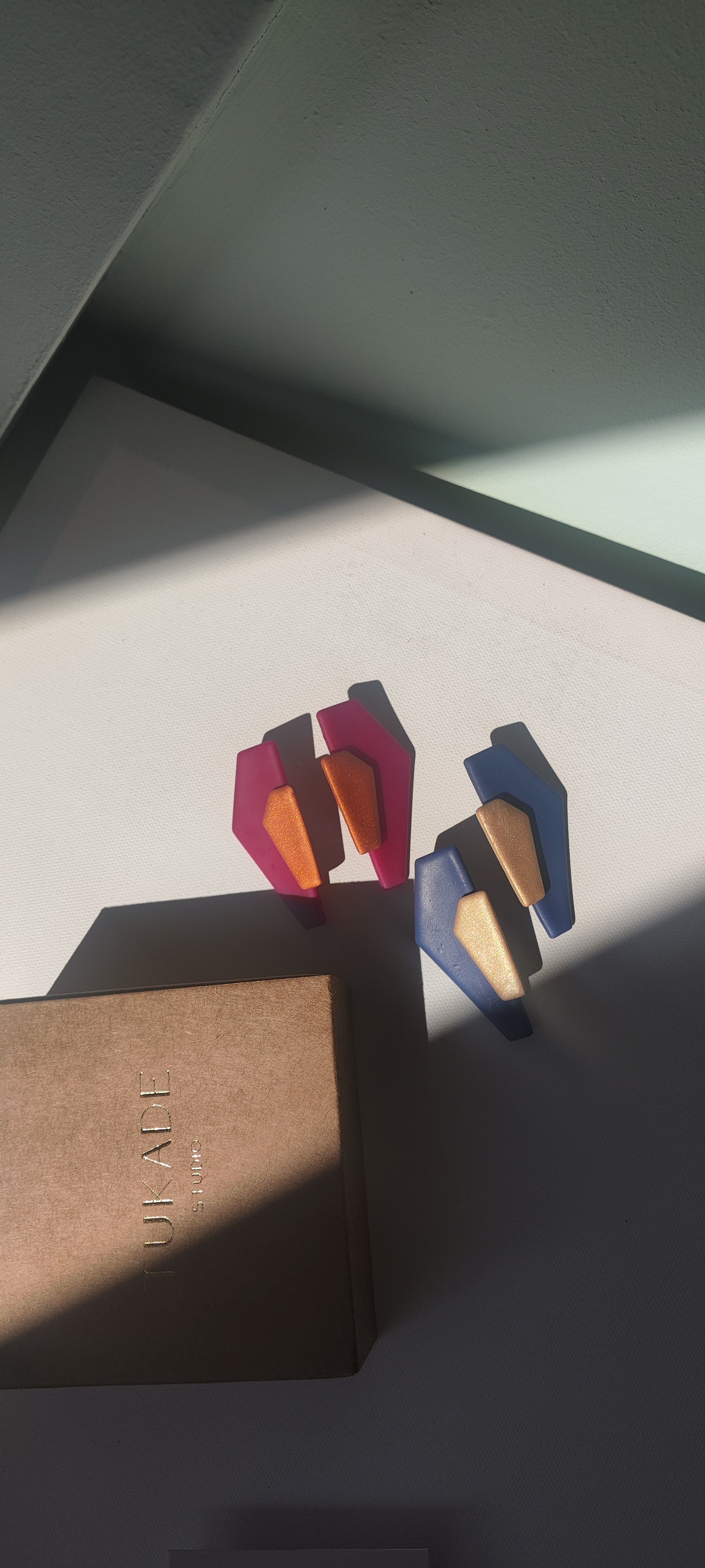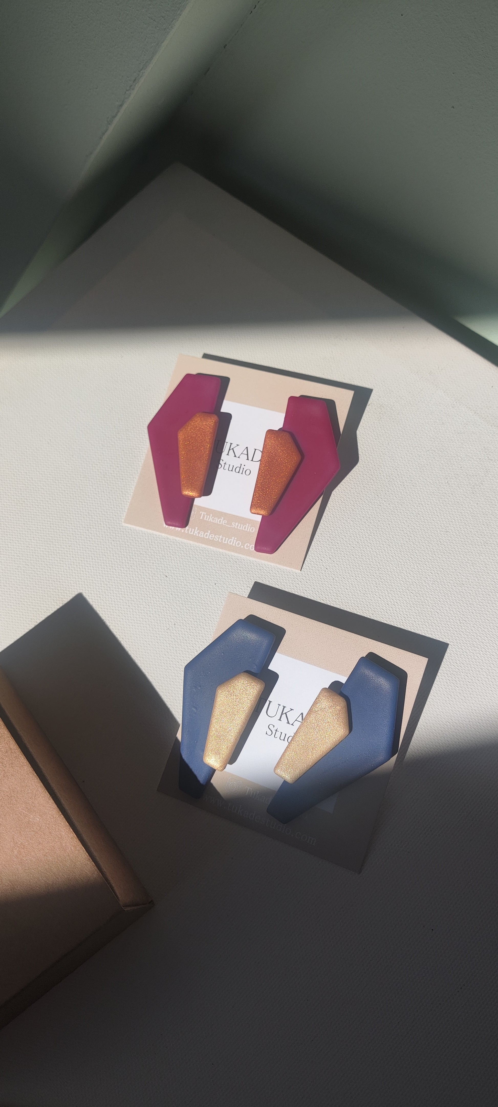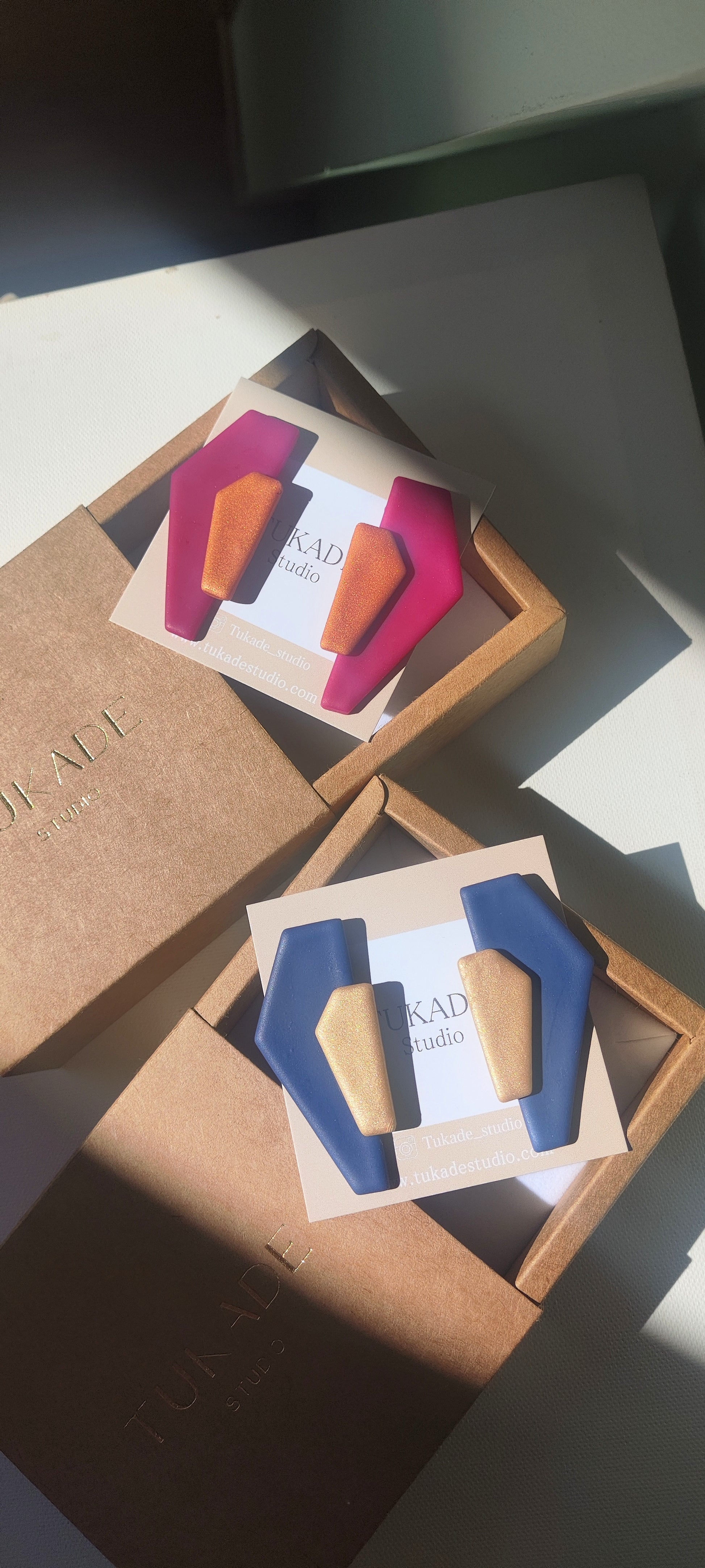 Pendientes MINERVA en forma alargada. Dos versiones: magenta y cobre o azul marino y champán.
