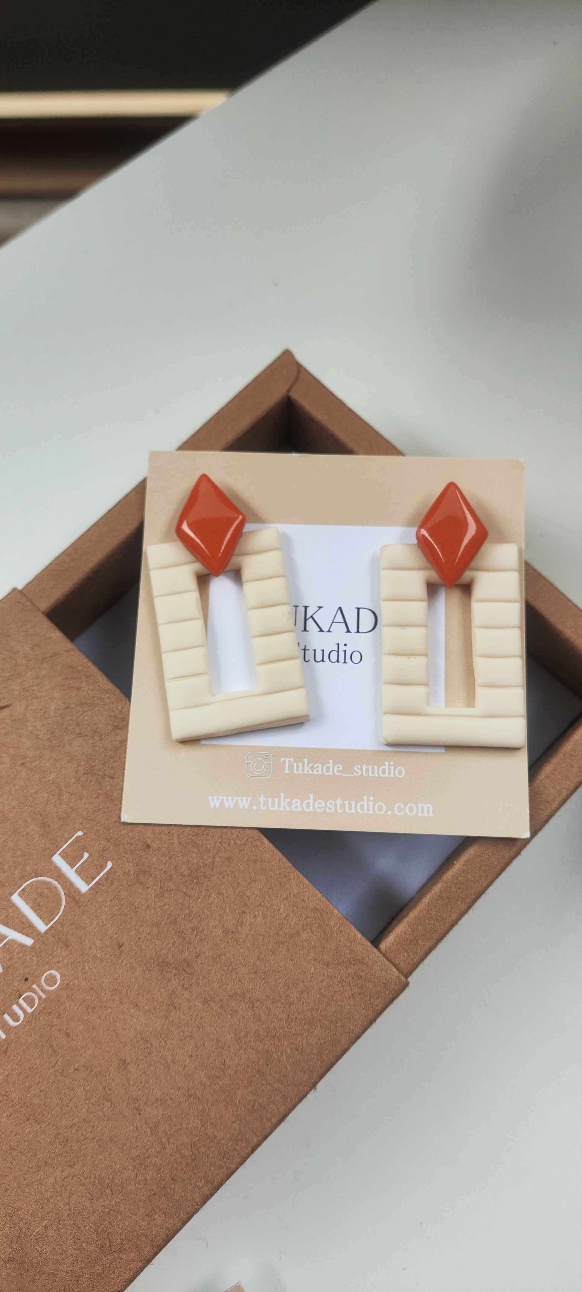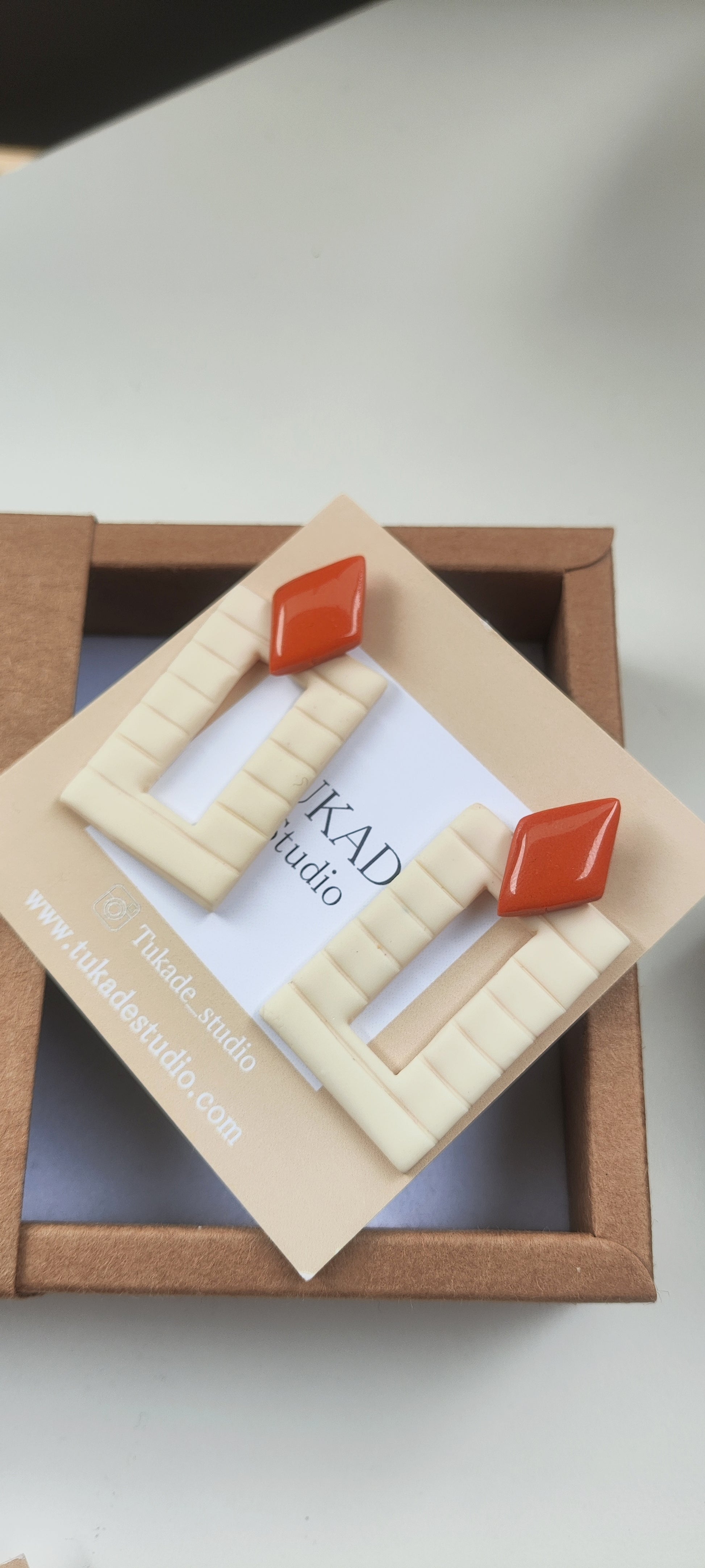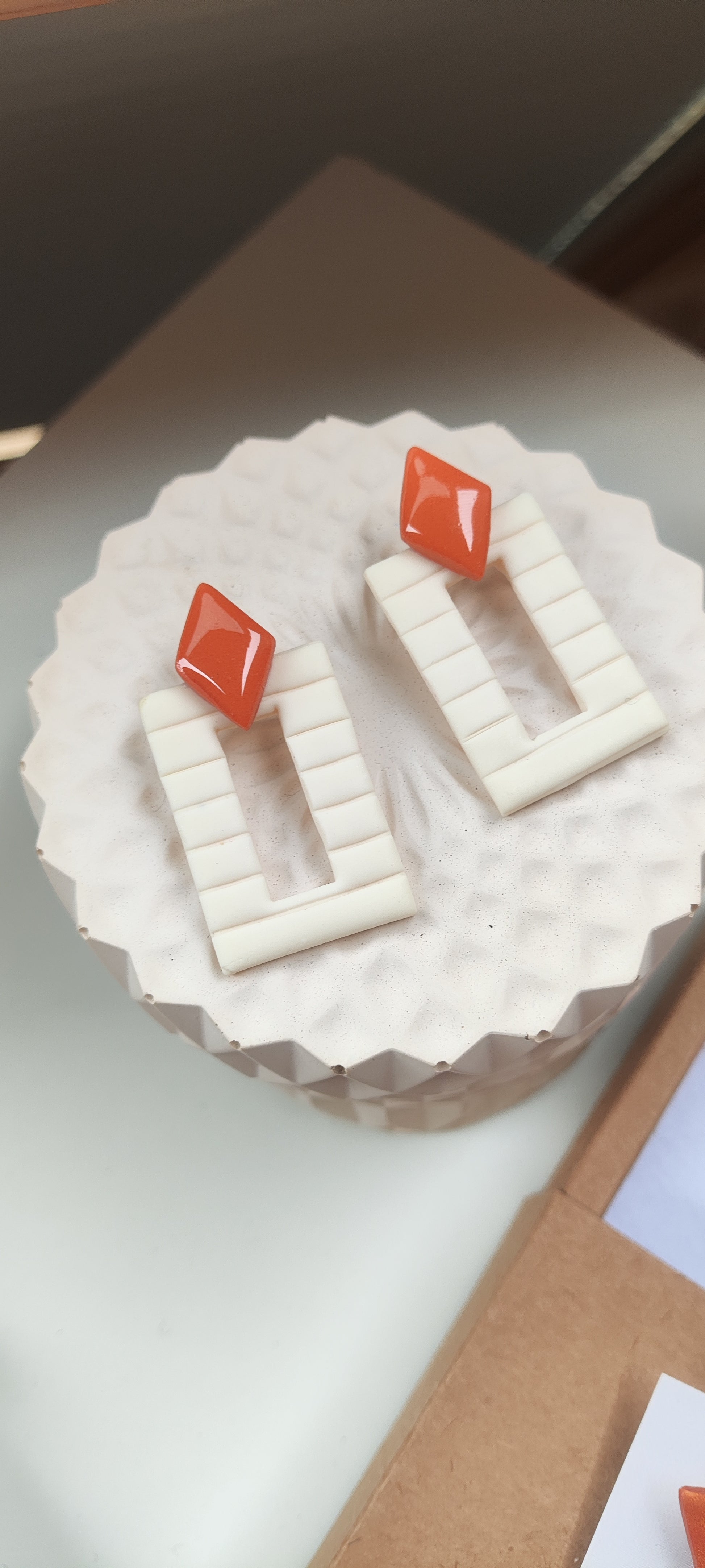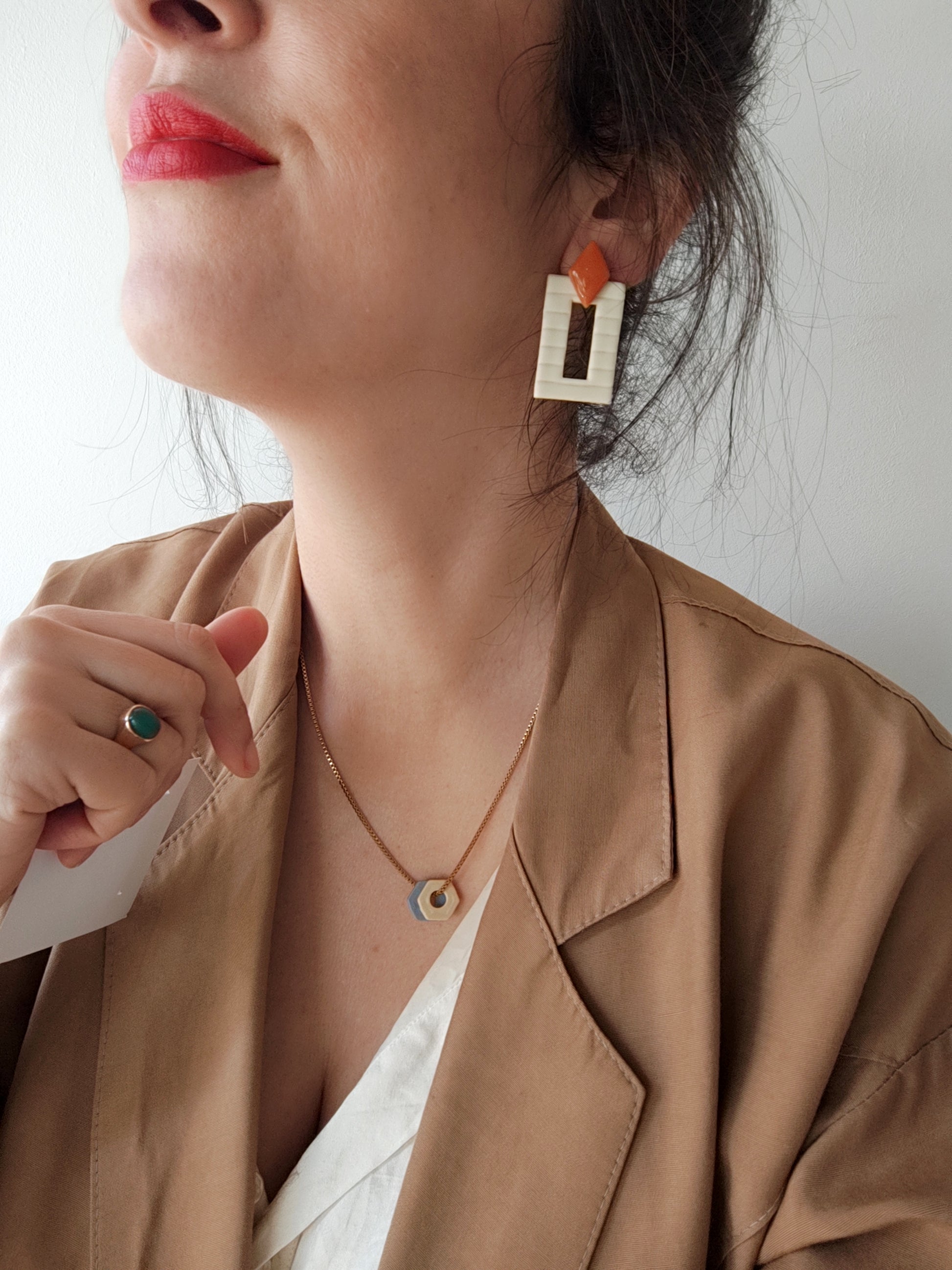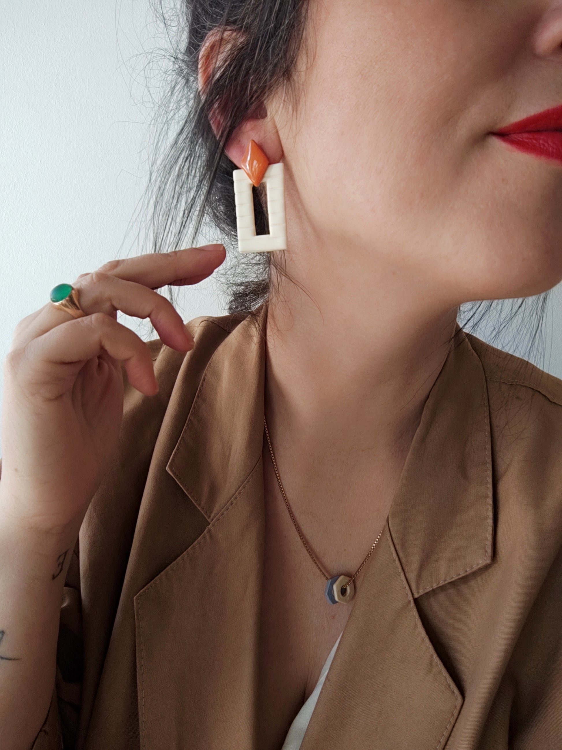 Pendientes minimalistas NICOLASA en forma de rectángulo y rayas con rombo, tamaño regular color crudo y teja con acabado brillo en resina. .