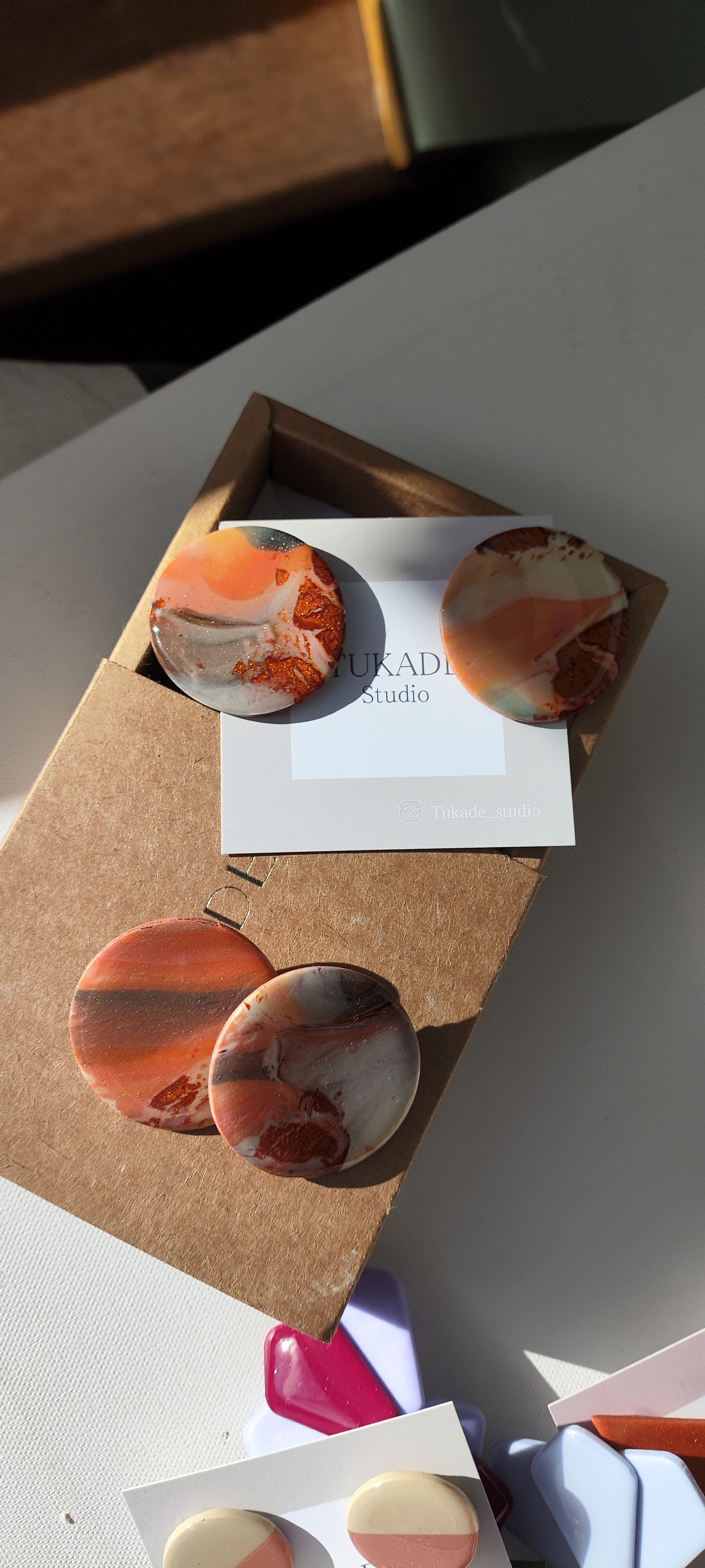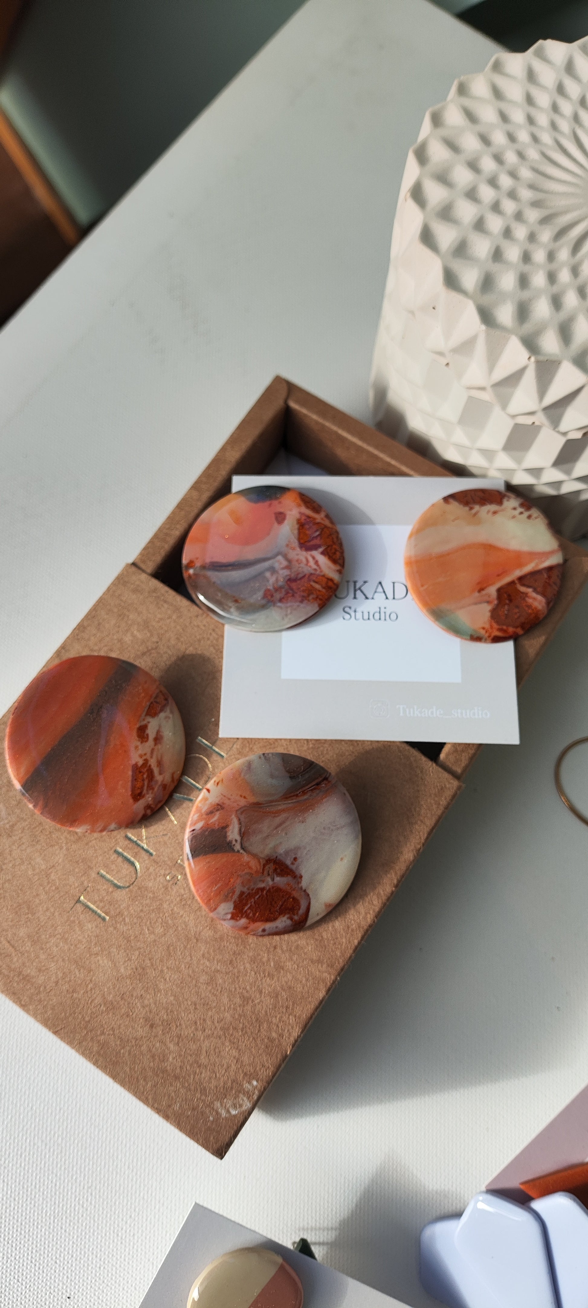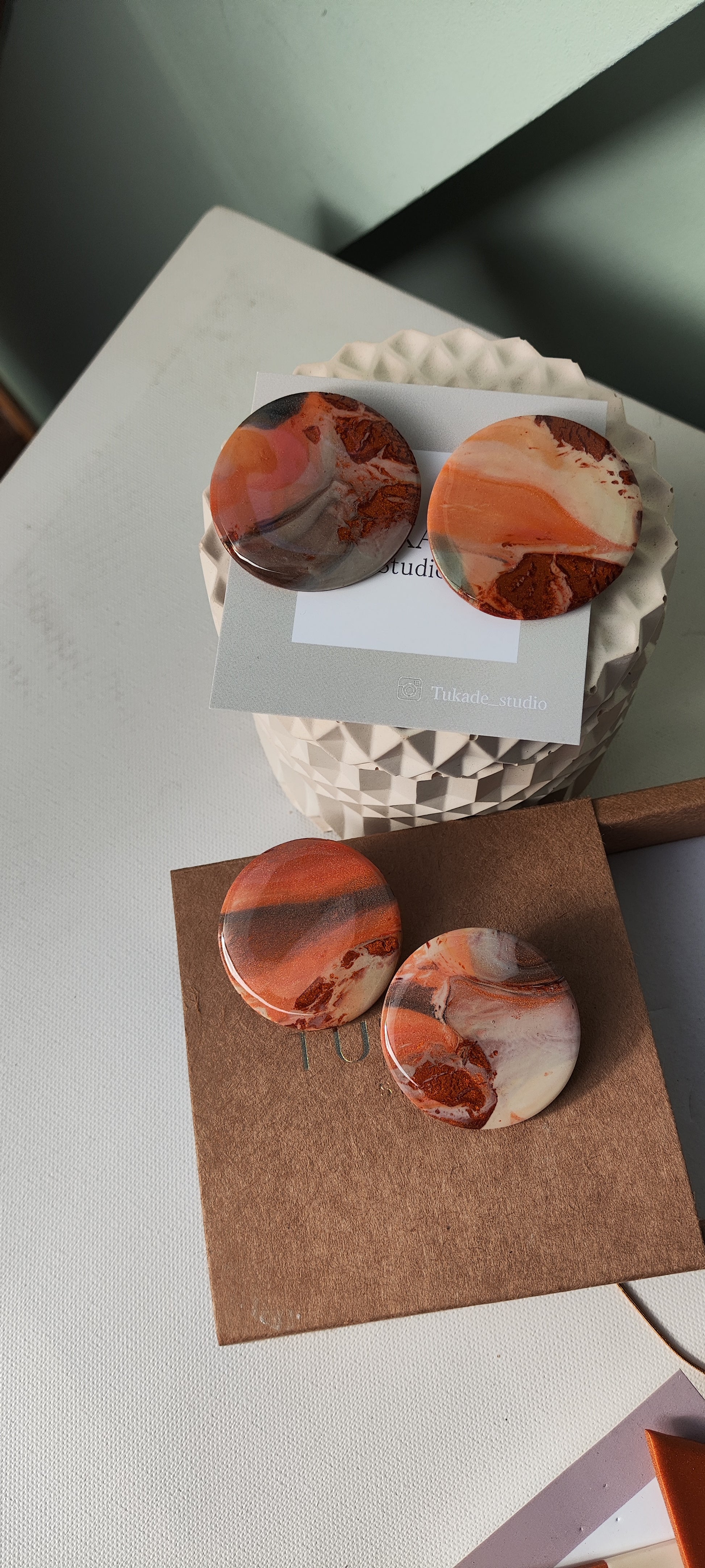 Cada par de pendientes está realizado a mano con mucho cuidado y cariño, con todo su proceso desde el modelado, corte, varios horneados, lijado y pulido.