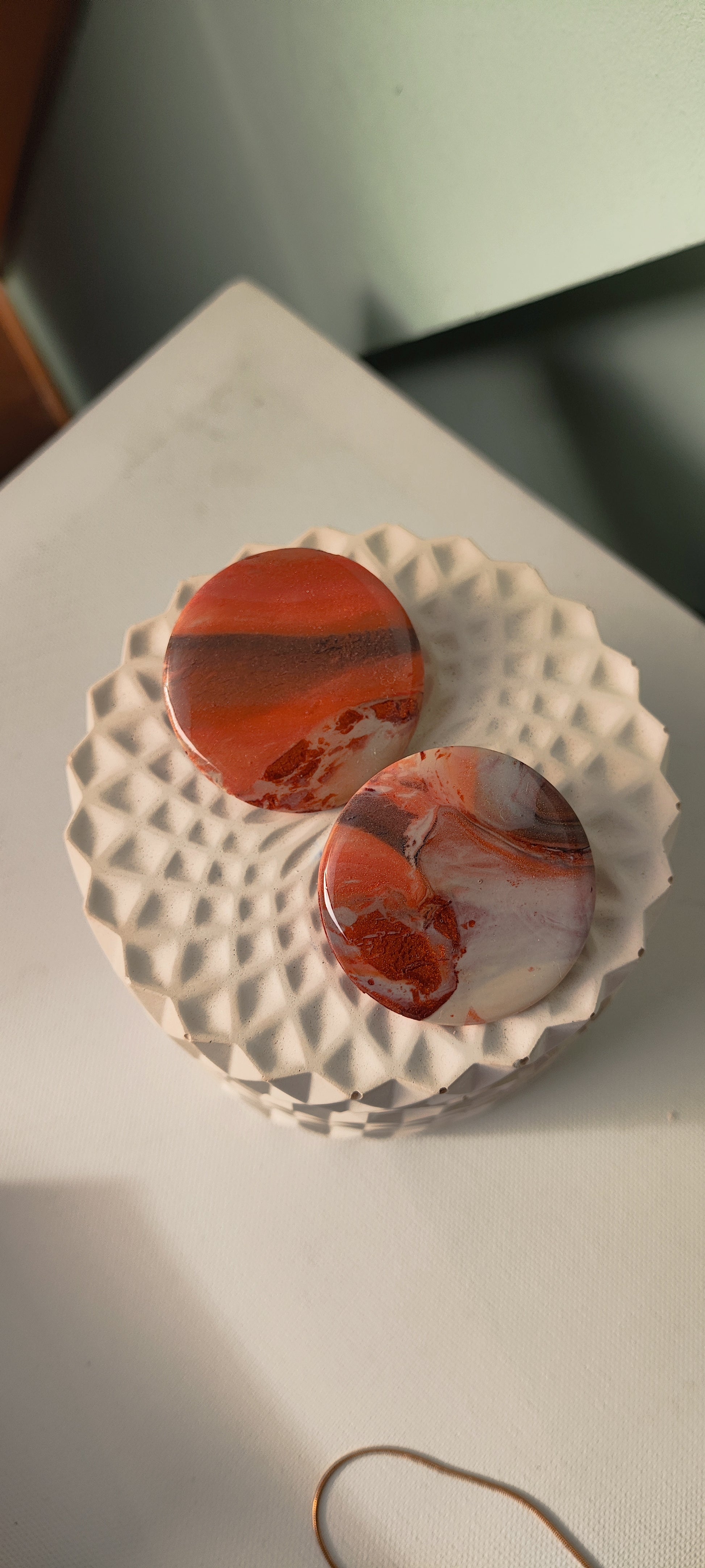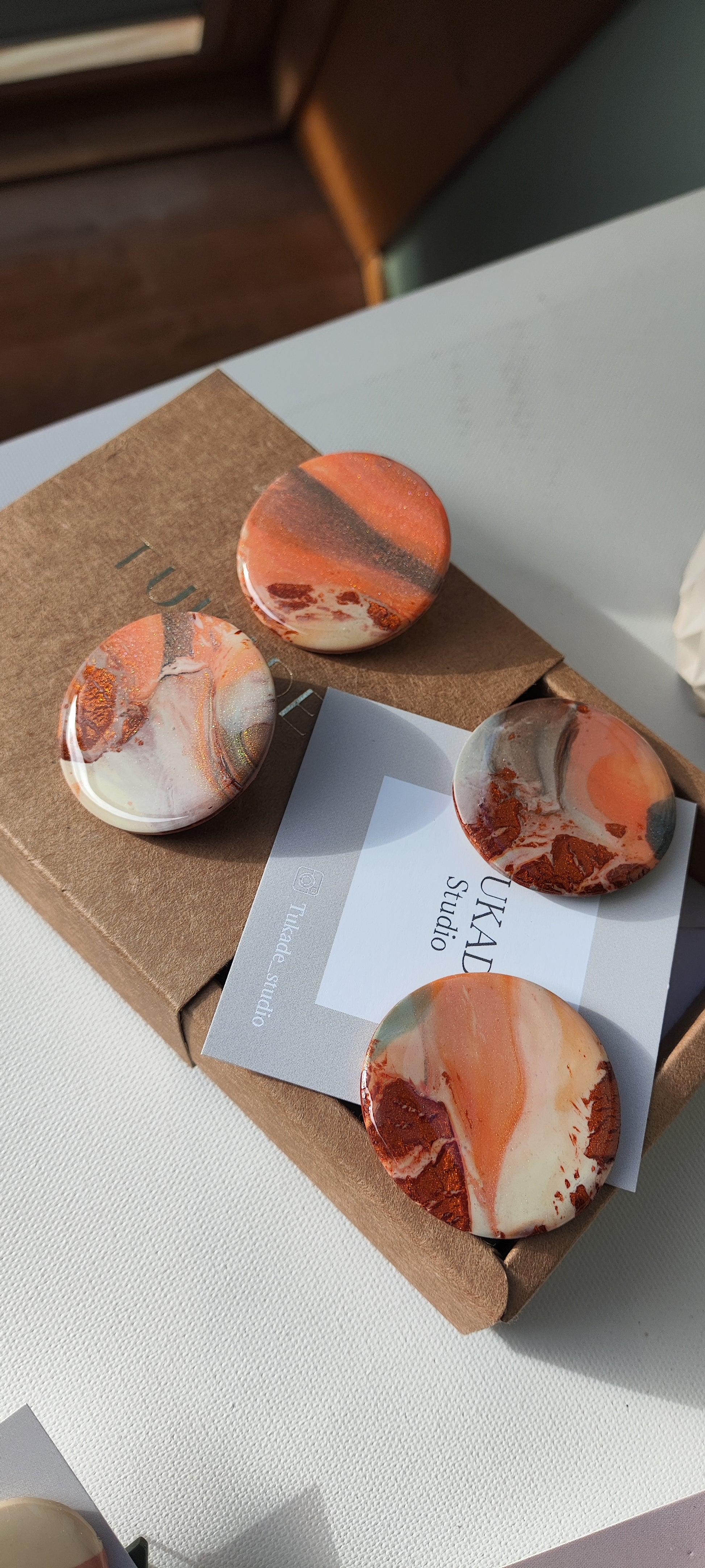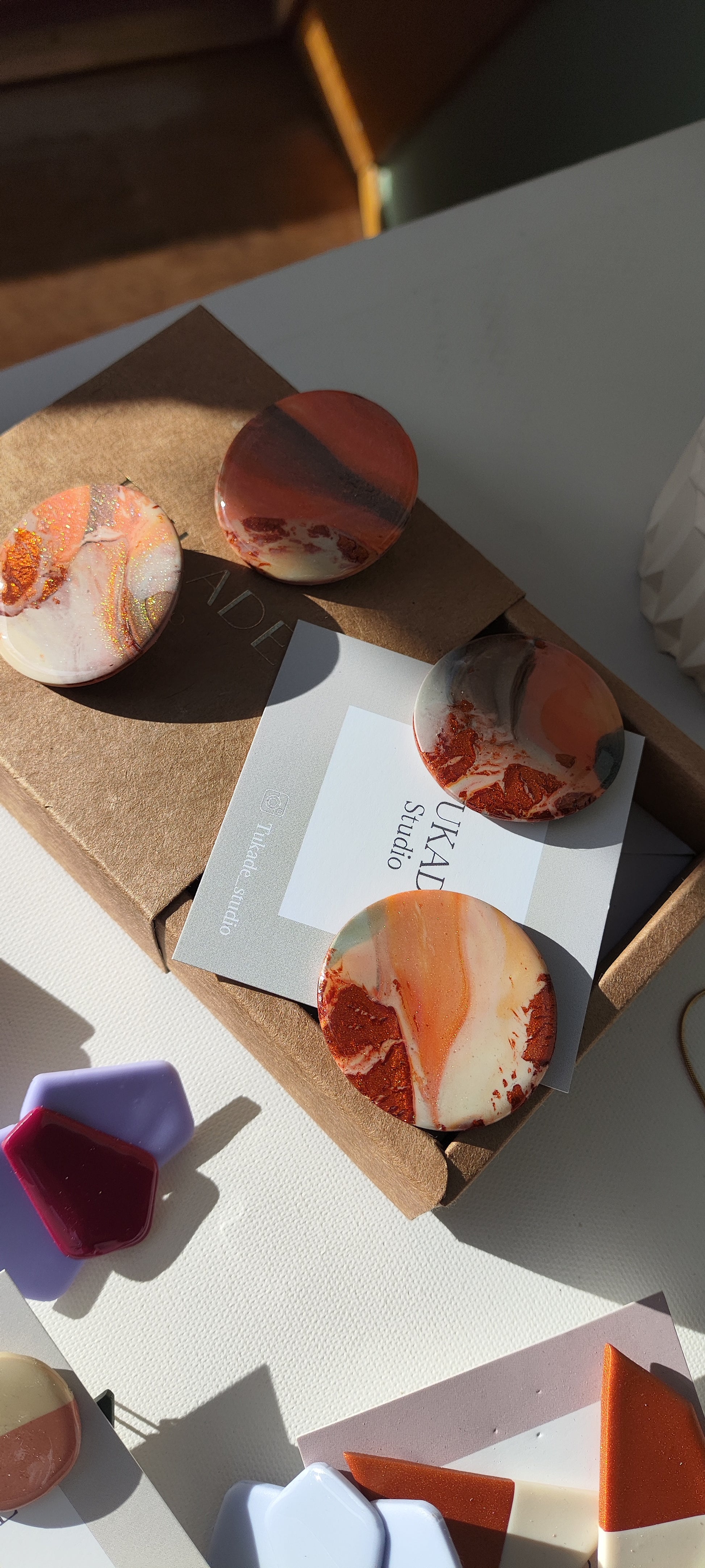Cada par de pendientes está realizado a mano con mucho cuidado y cariño, con todo su proceso desde el modelado, corte, varios horneados, lijado y pulido.