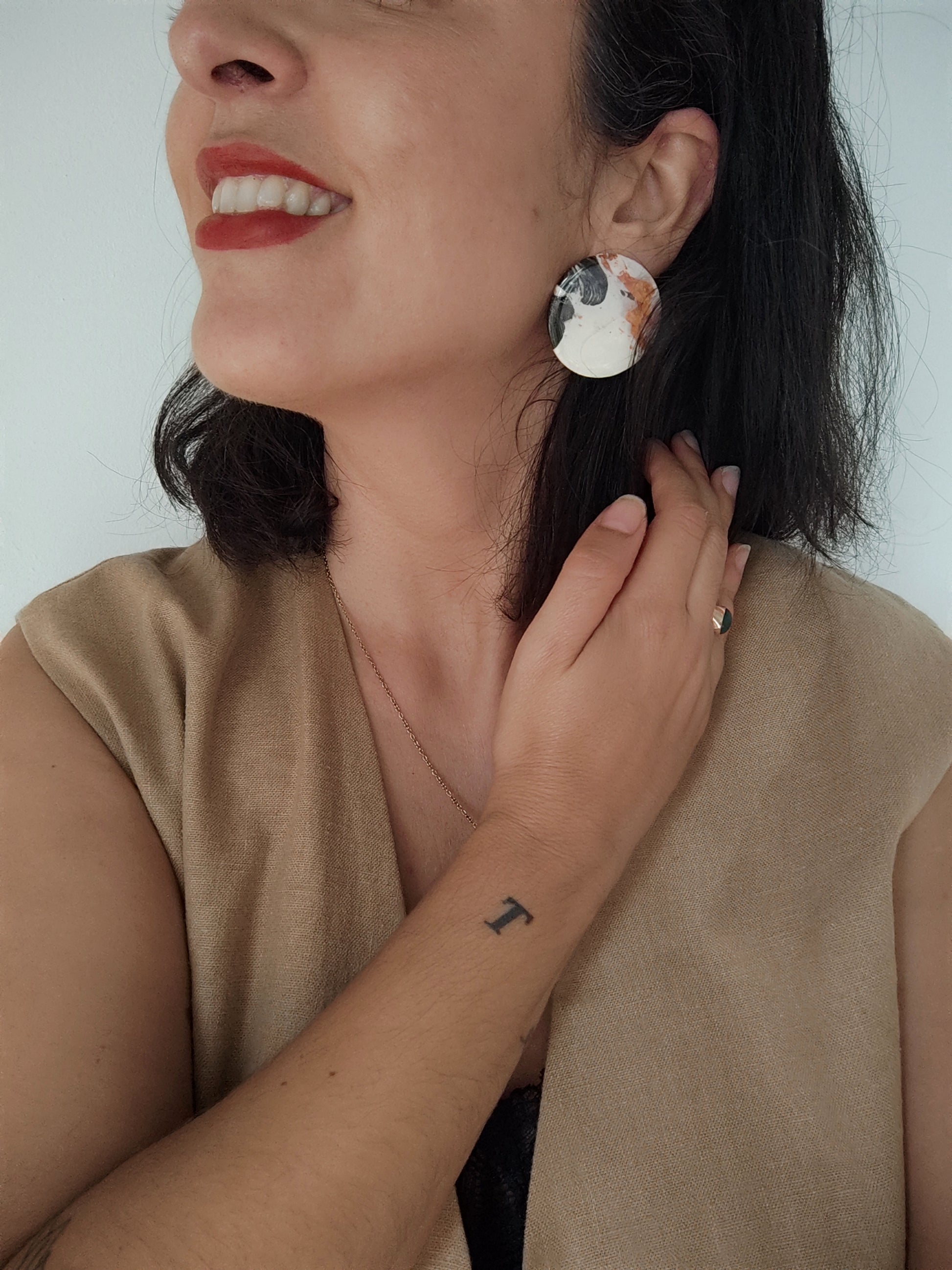 Pendientes minimalistas NOAH maxi en forma de círculo y RENATA media luna con acabado brillo en resina