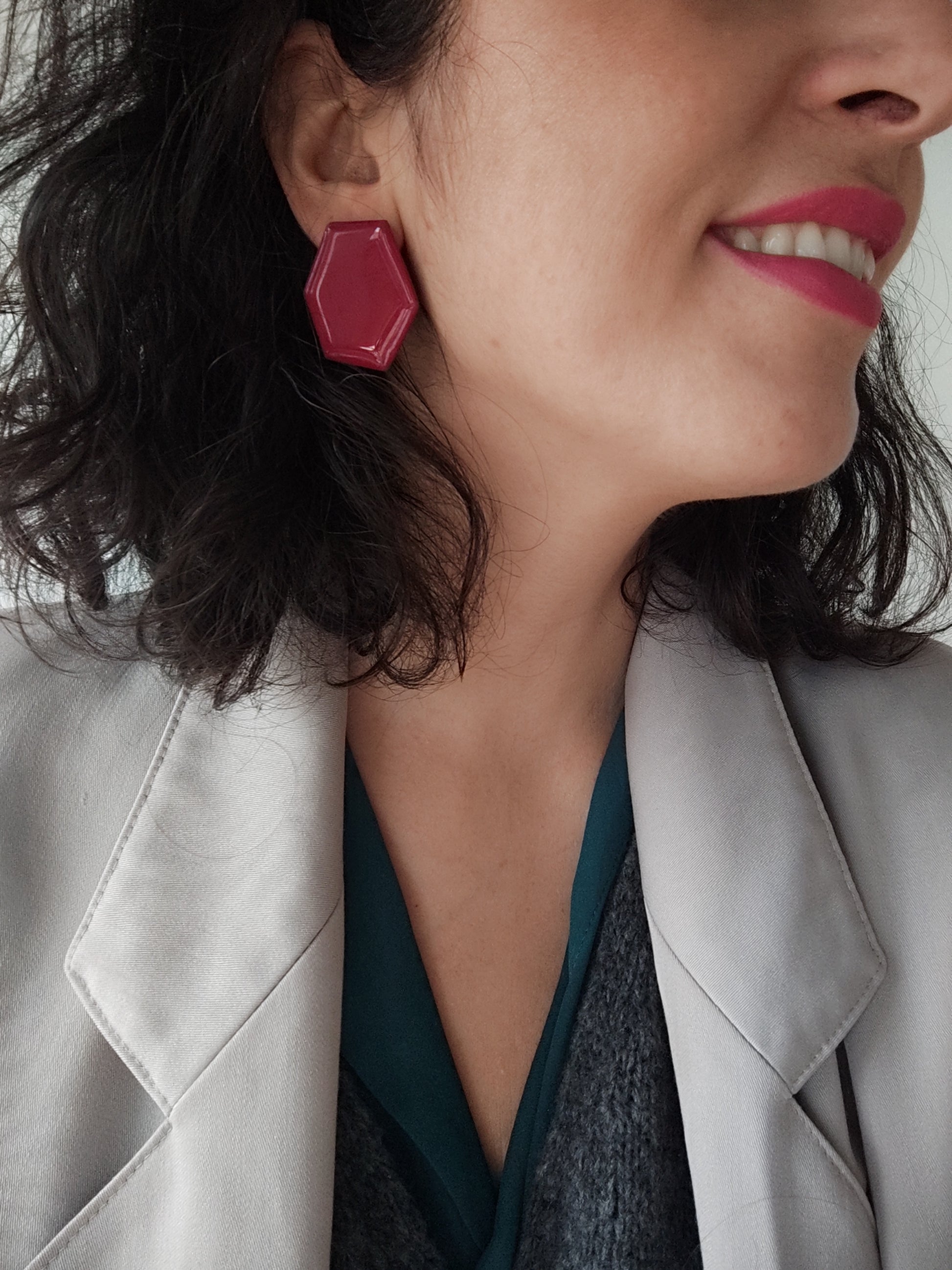 Pendientes minimalistas ONNA en forma de hexágono y con capa de brillo en resina.