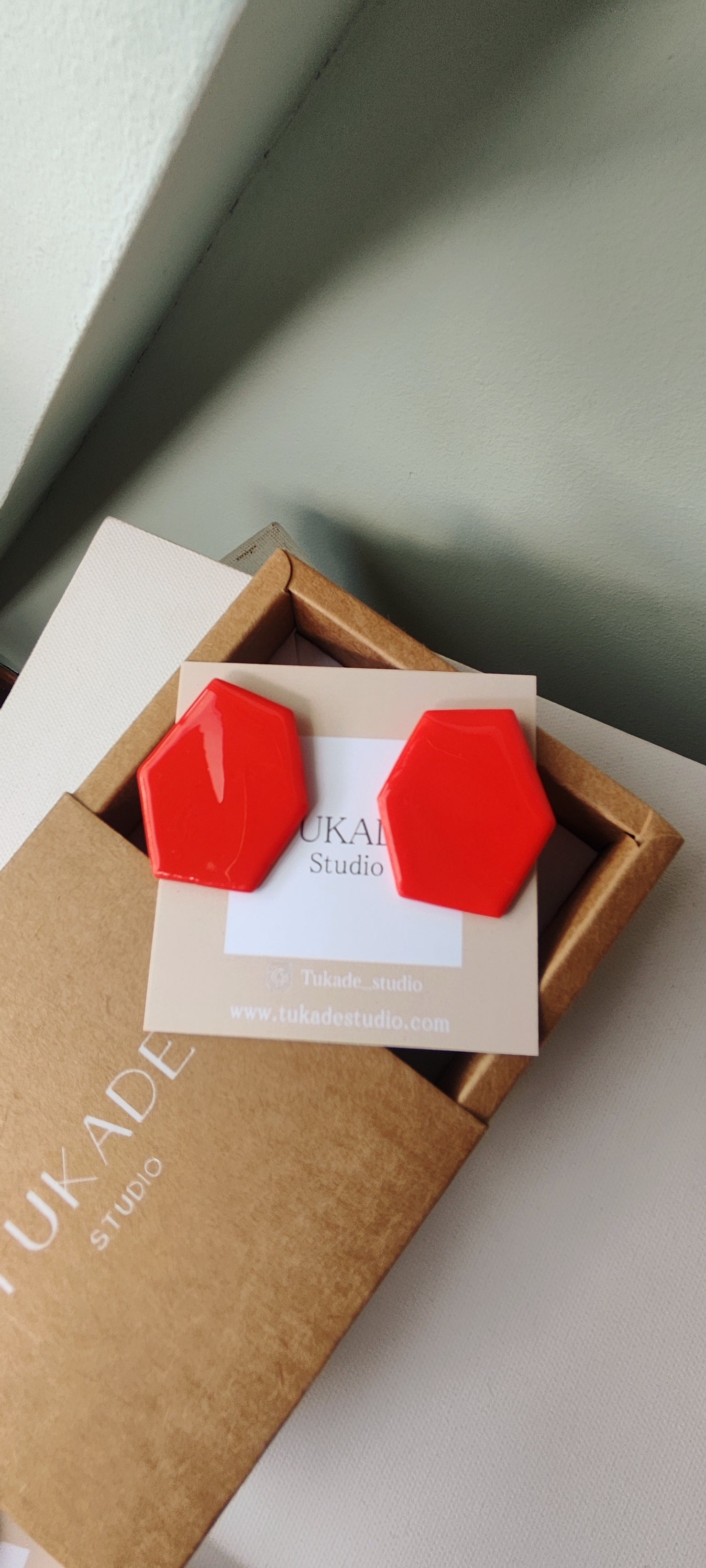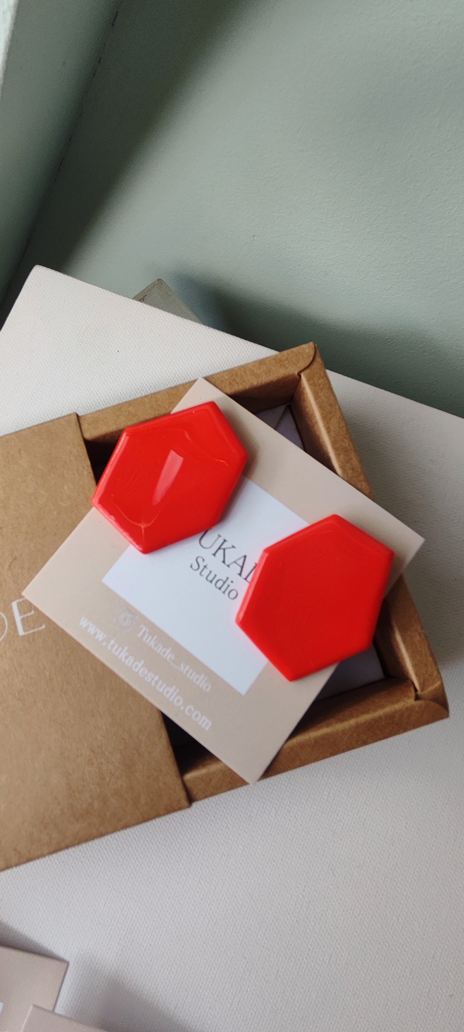 Pendientes minimalistas ONNA en forma de hexágono y con capa de brillo en resina.