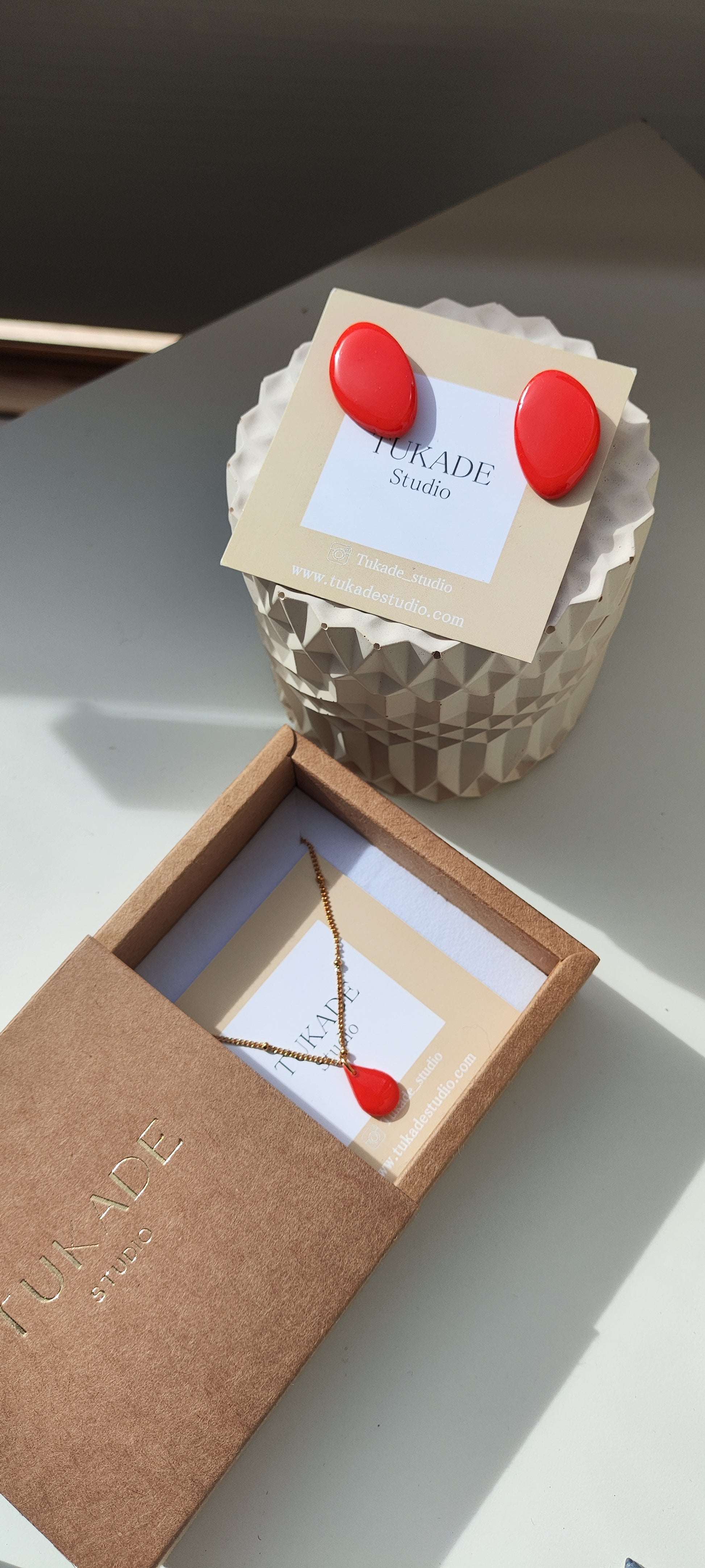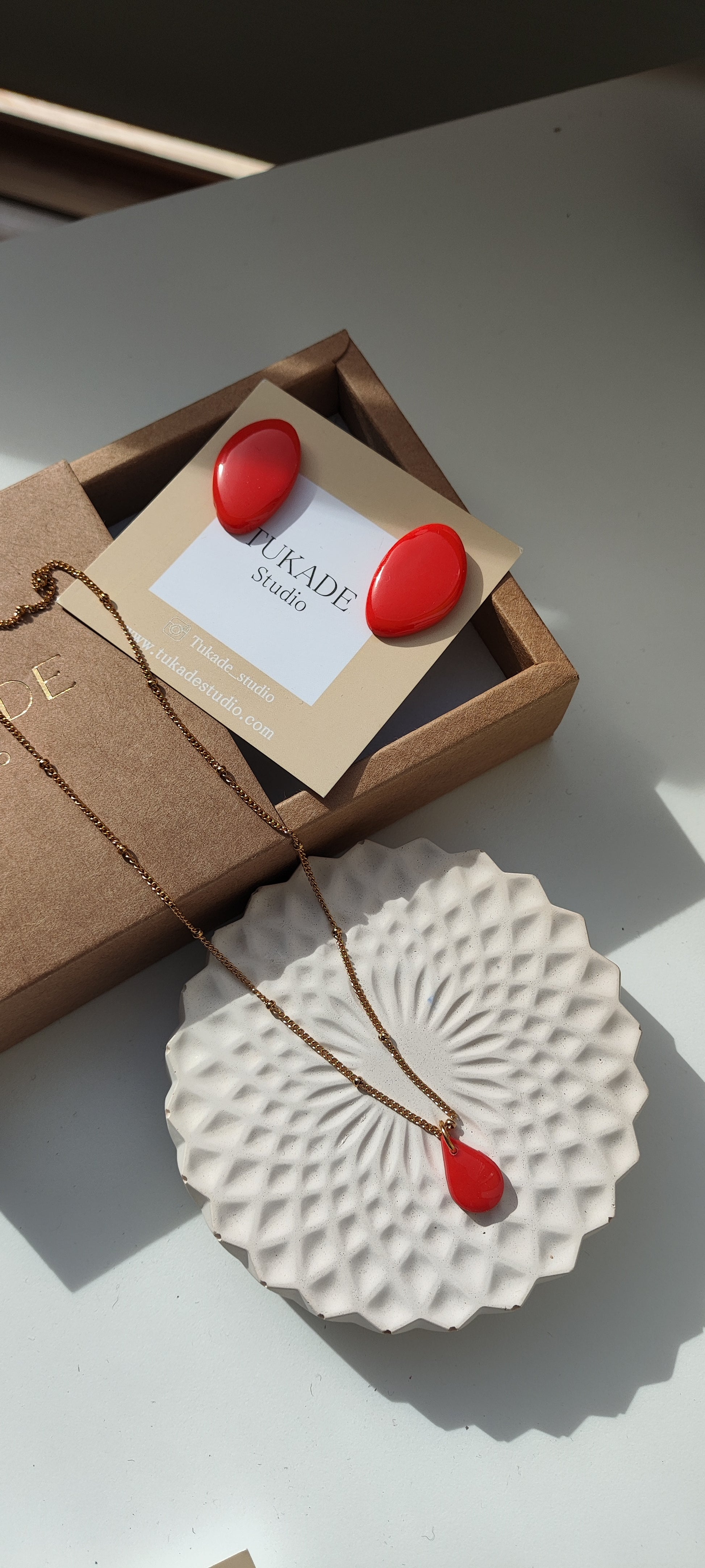 Preciosos pack conpuesto por pendientes Mariana color rojo amapola, en forma óvalo irregular con capa de brillo en resina y collar CUCA con pieza Tukade en lágrima y cadena con bolitas de acero inoxidable y baño en oro.