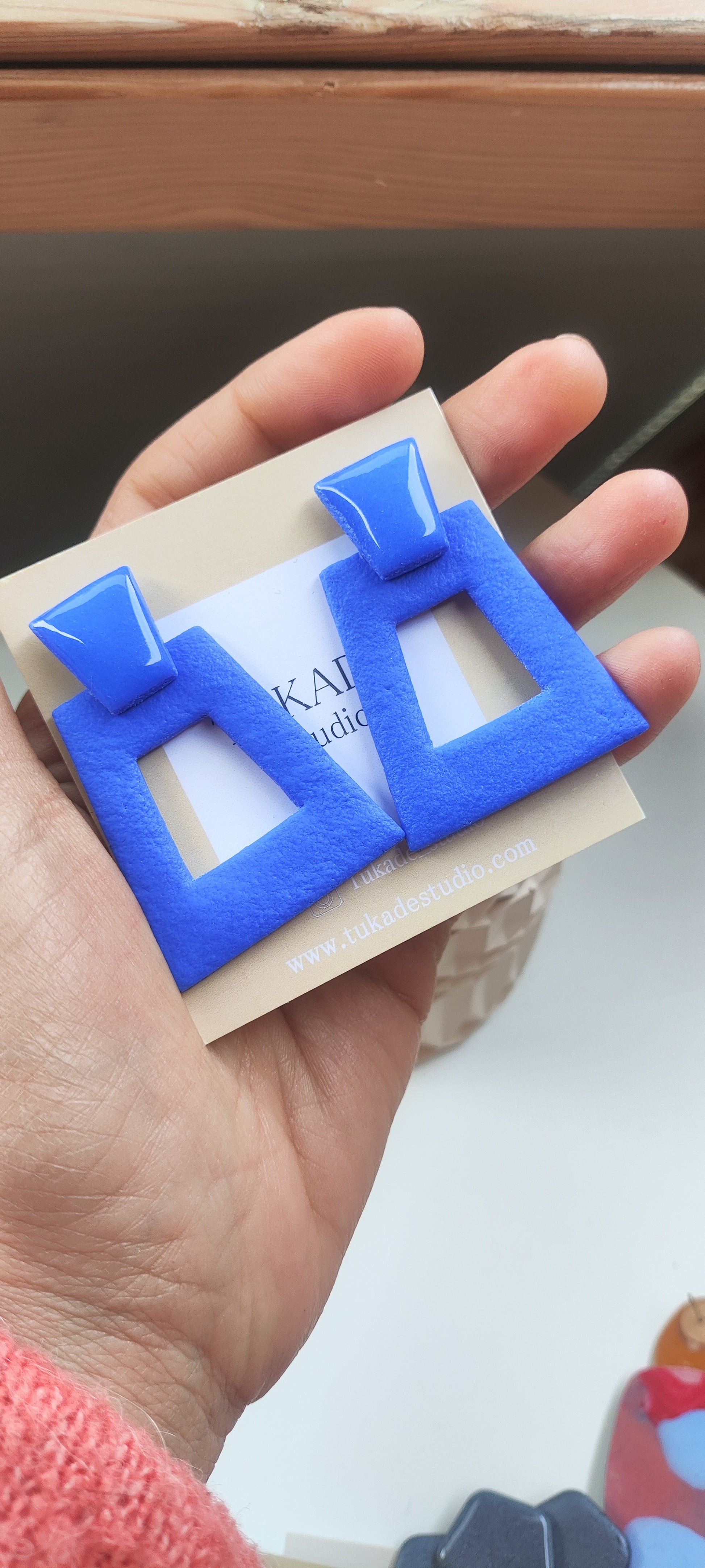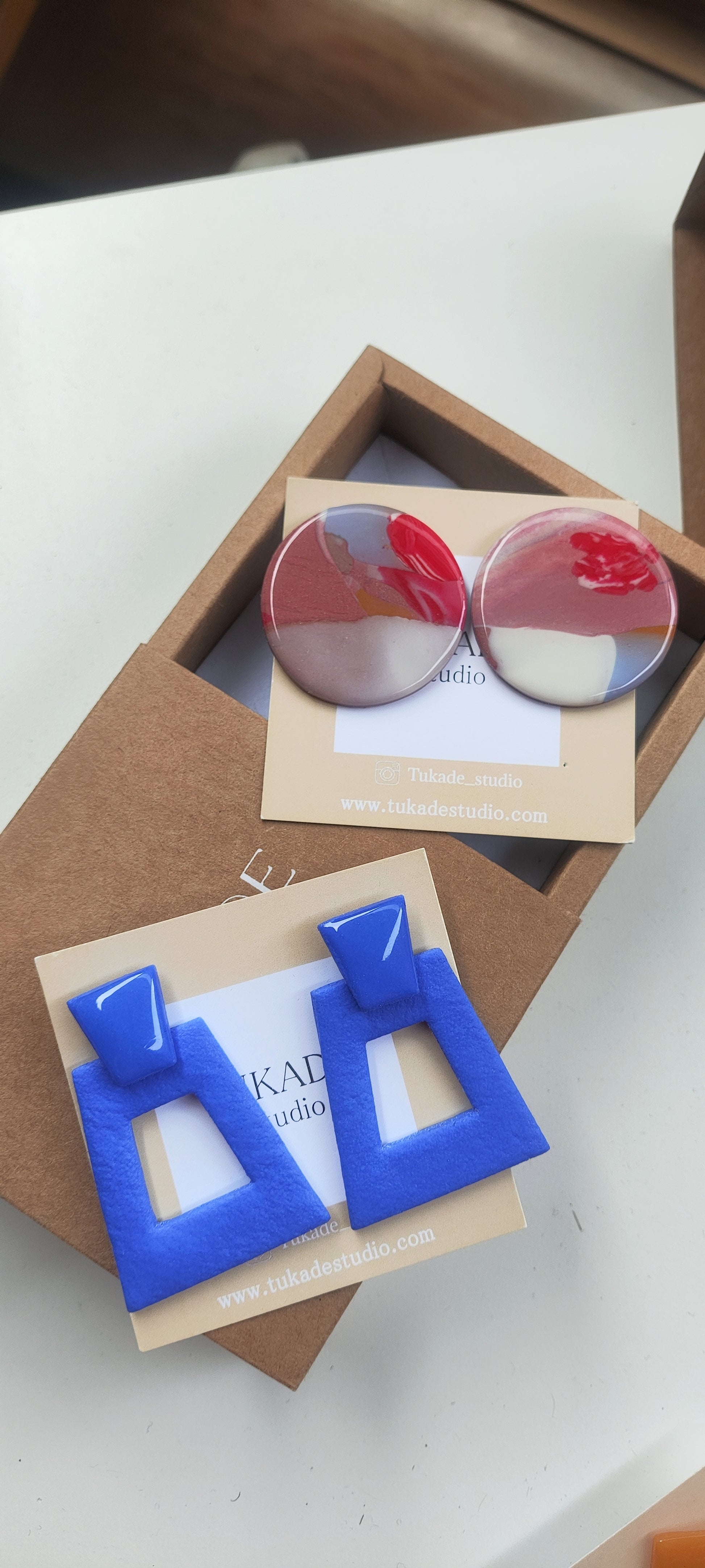 Cada par de pendientes está realizado a mano con mucho cuidado y cariño, con todo su proceso desde el modelado, corte, varios horneados, lijado y pulido.
