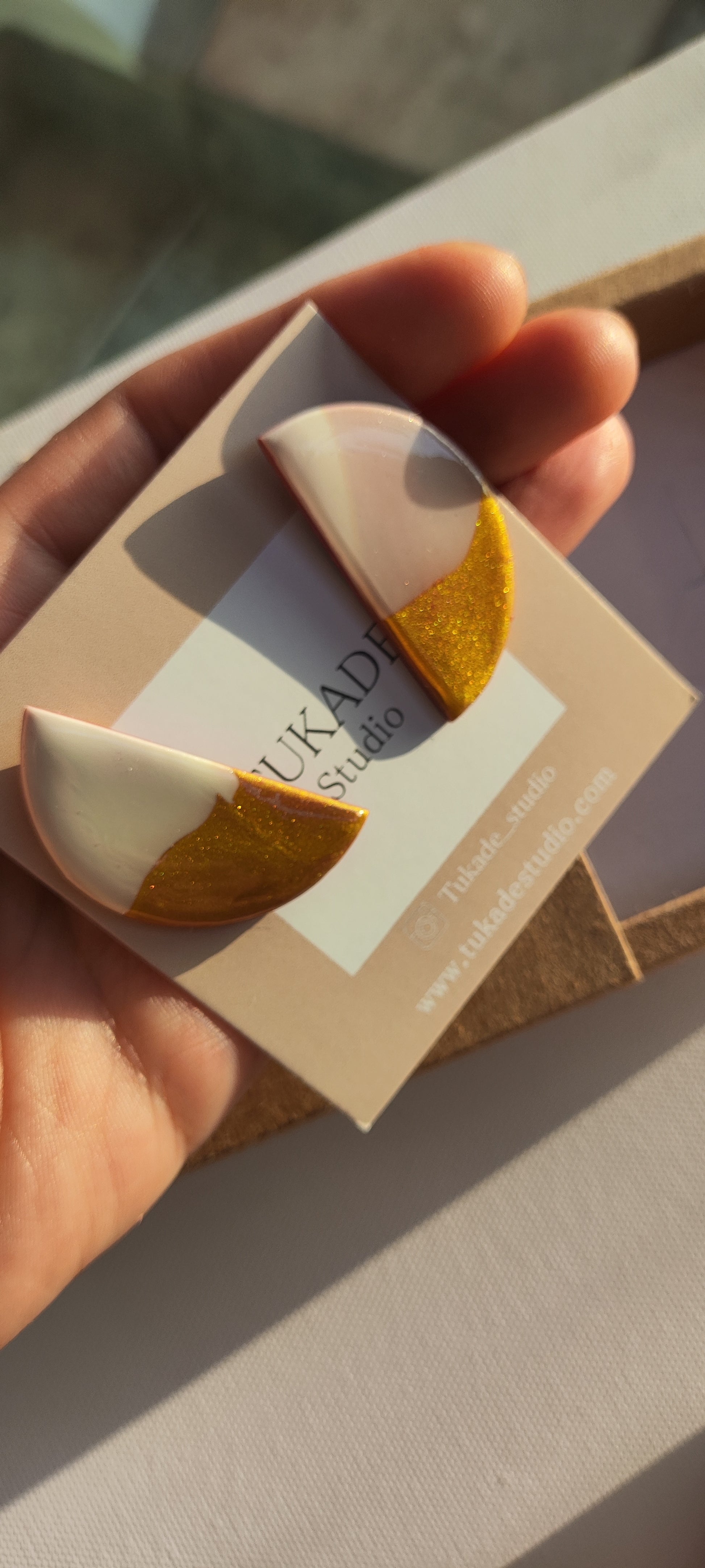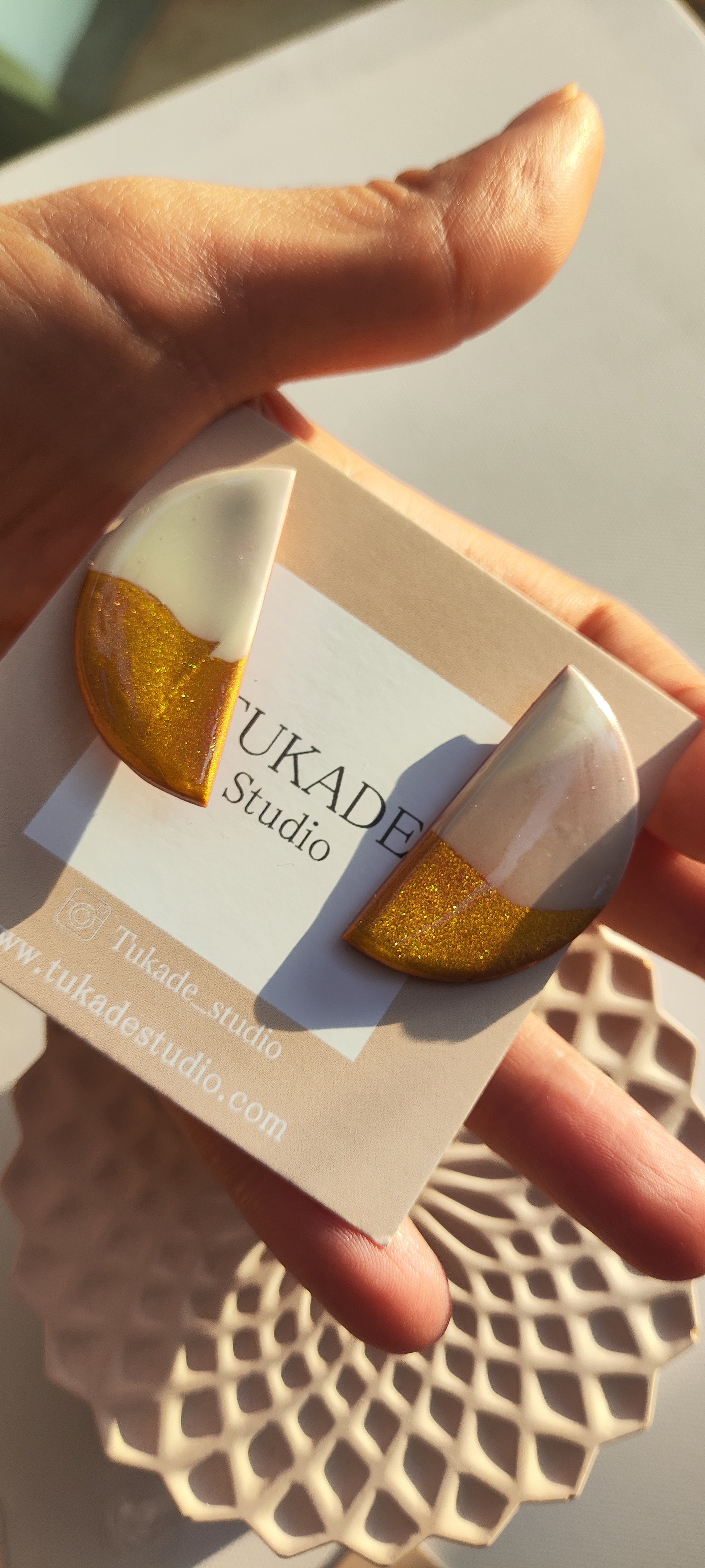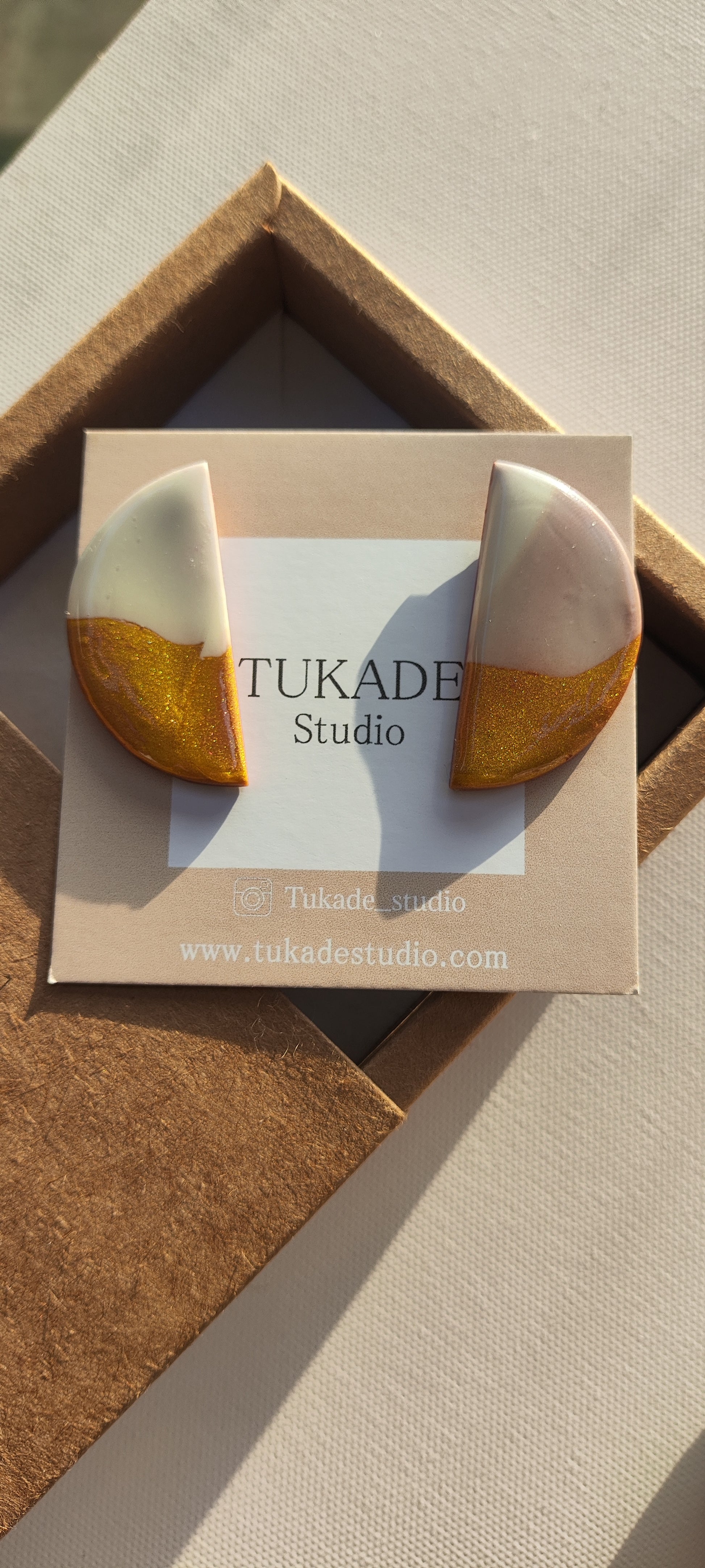 Pendientes minimalistas RENATA en forma de media luna en mezcla de colores crudo y ocre dorado y acabado en brillo resina. Par único e irrepetible.