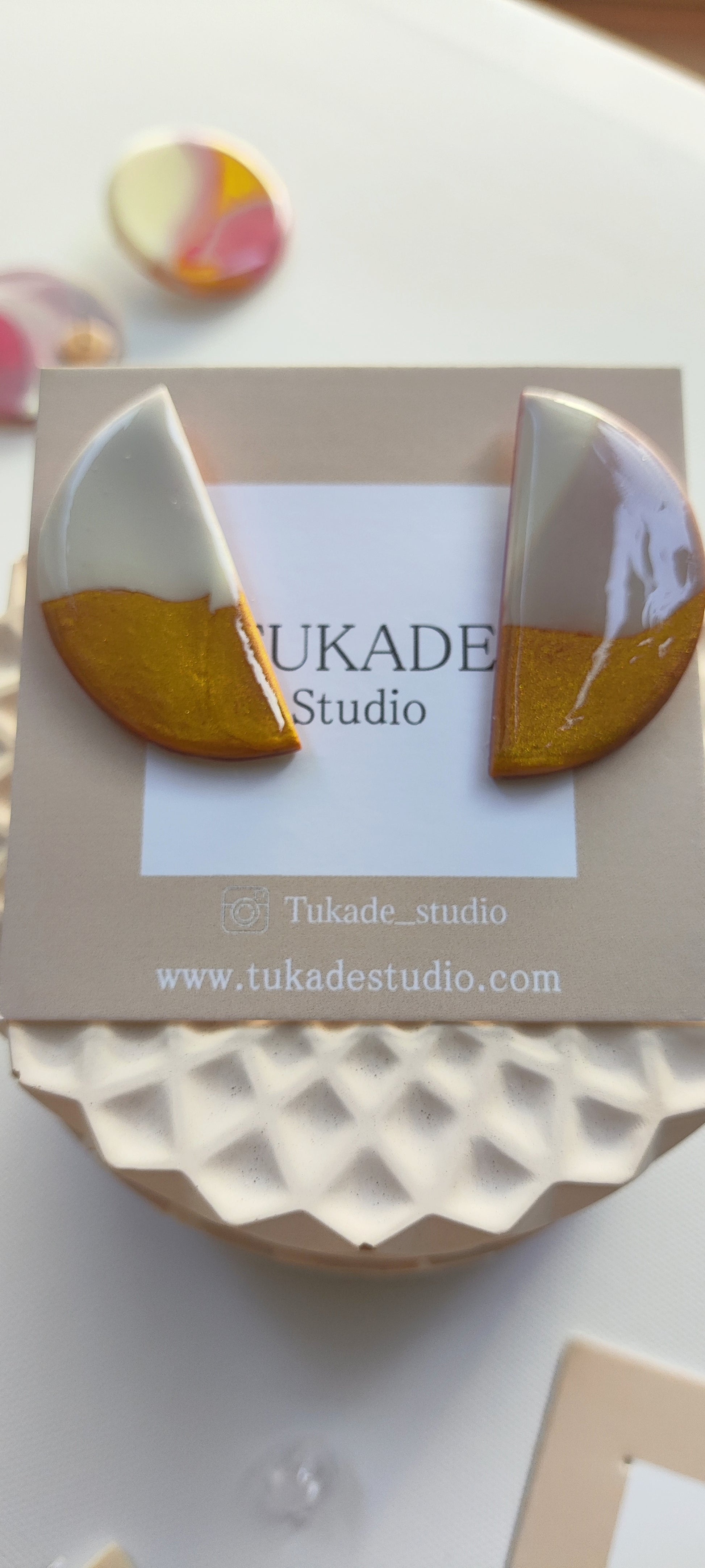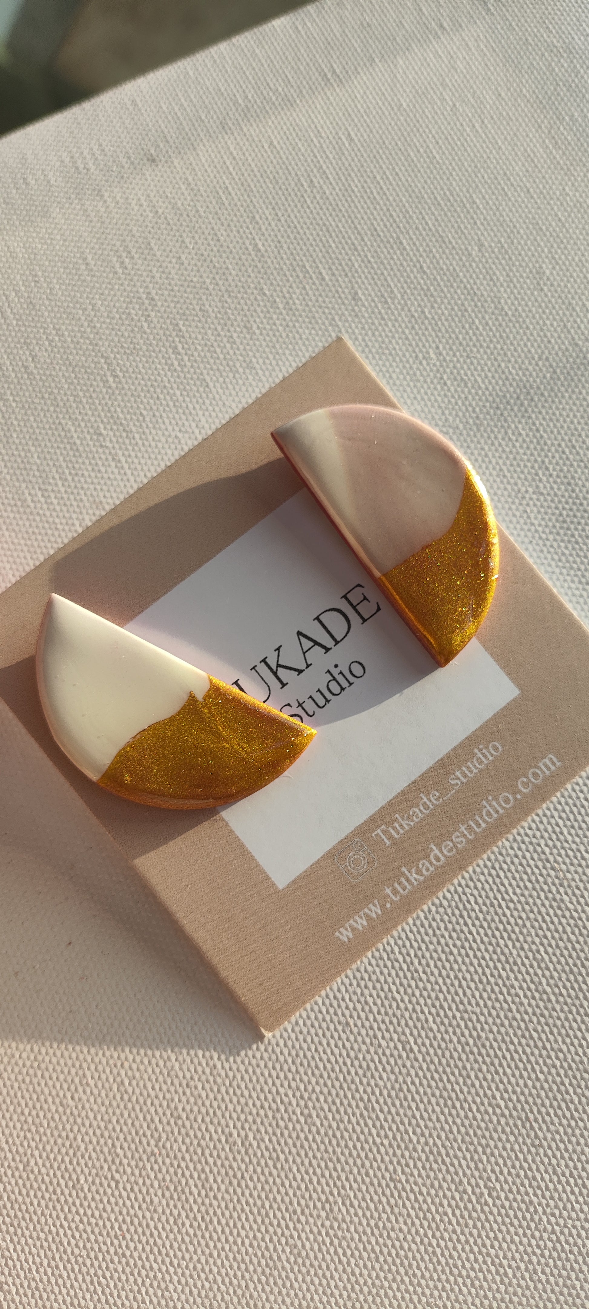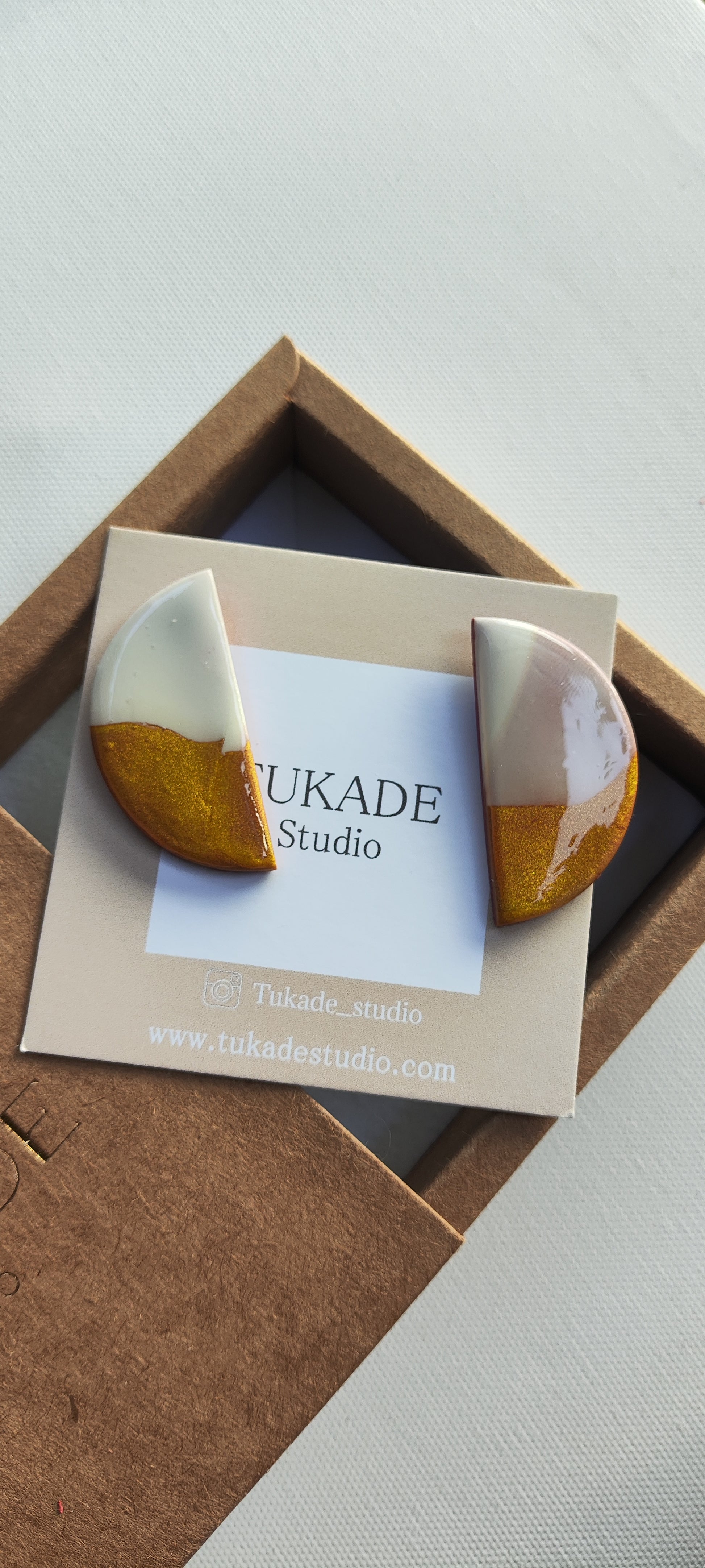 Pendientes minimalistas RENATA en forma de media luna en mezcla de colores crudo y ocre dorado y acabado en brillo resina. Par único e irrepetible.