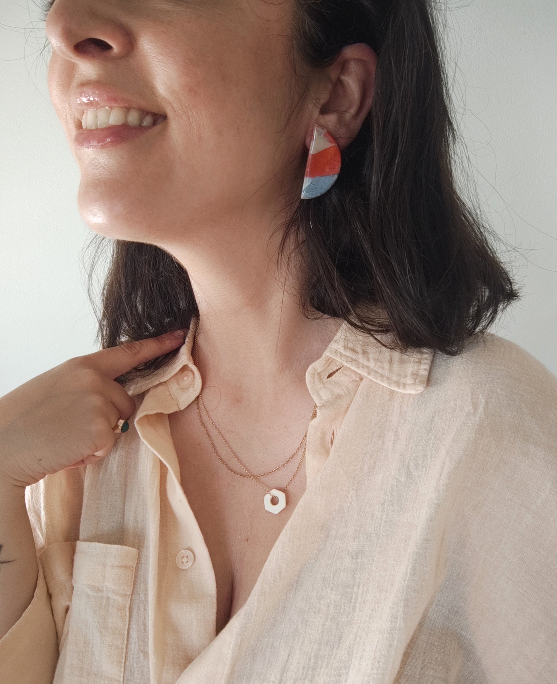 Cada par de pendientes está realizado a mano con mucho cuidado y cariño, con todo su proceso desde el modelado, corte, varios horneados, lijado y pulido.