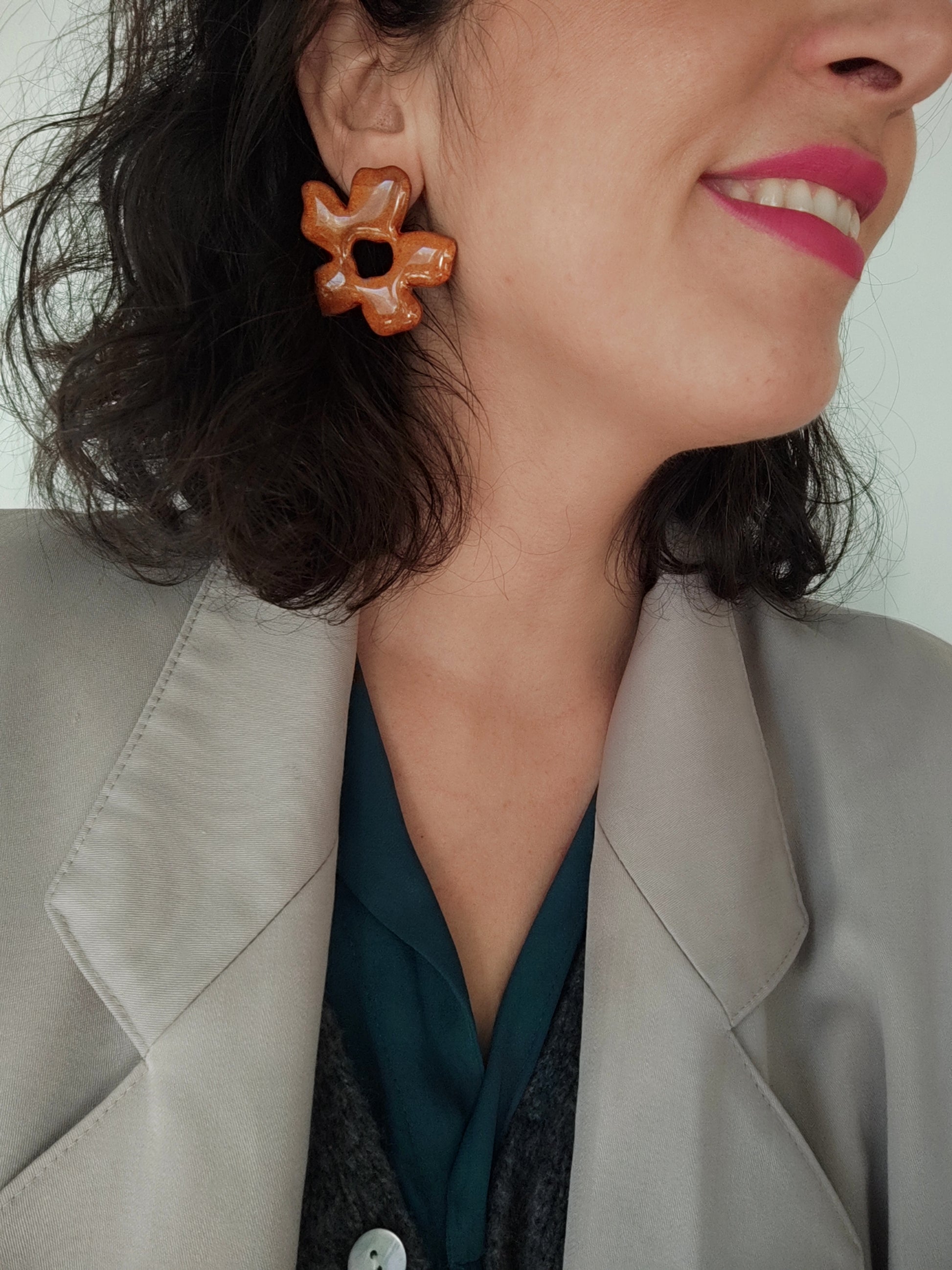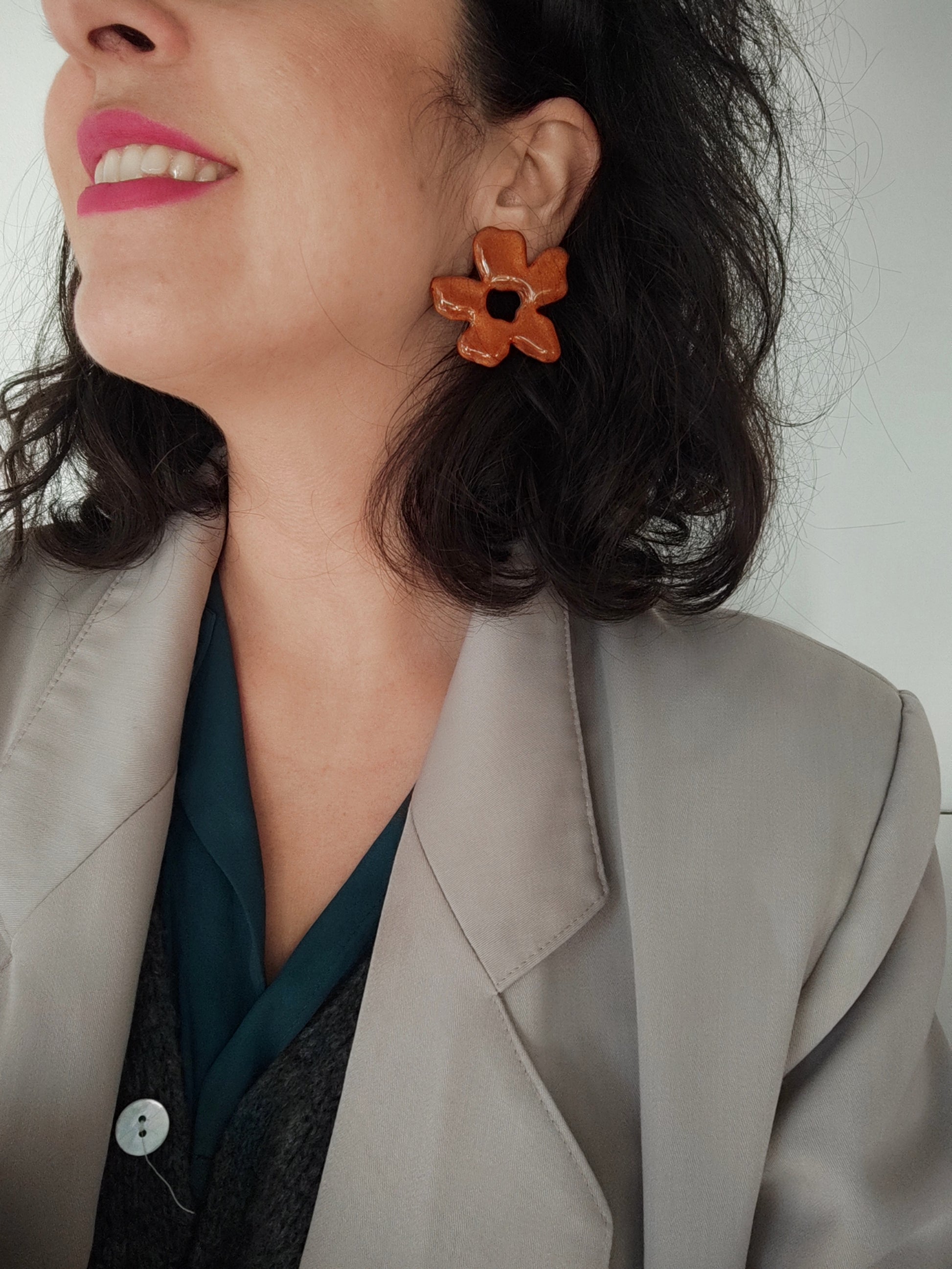 Pendientes RUFINA en forma de flor maxi en color chocolate y acabado en resina brillo.