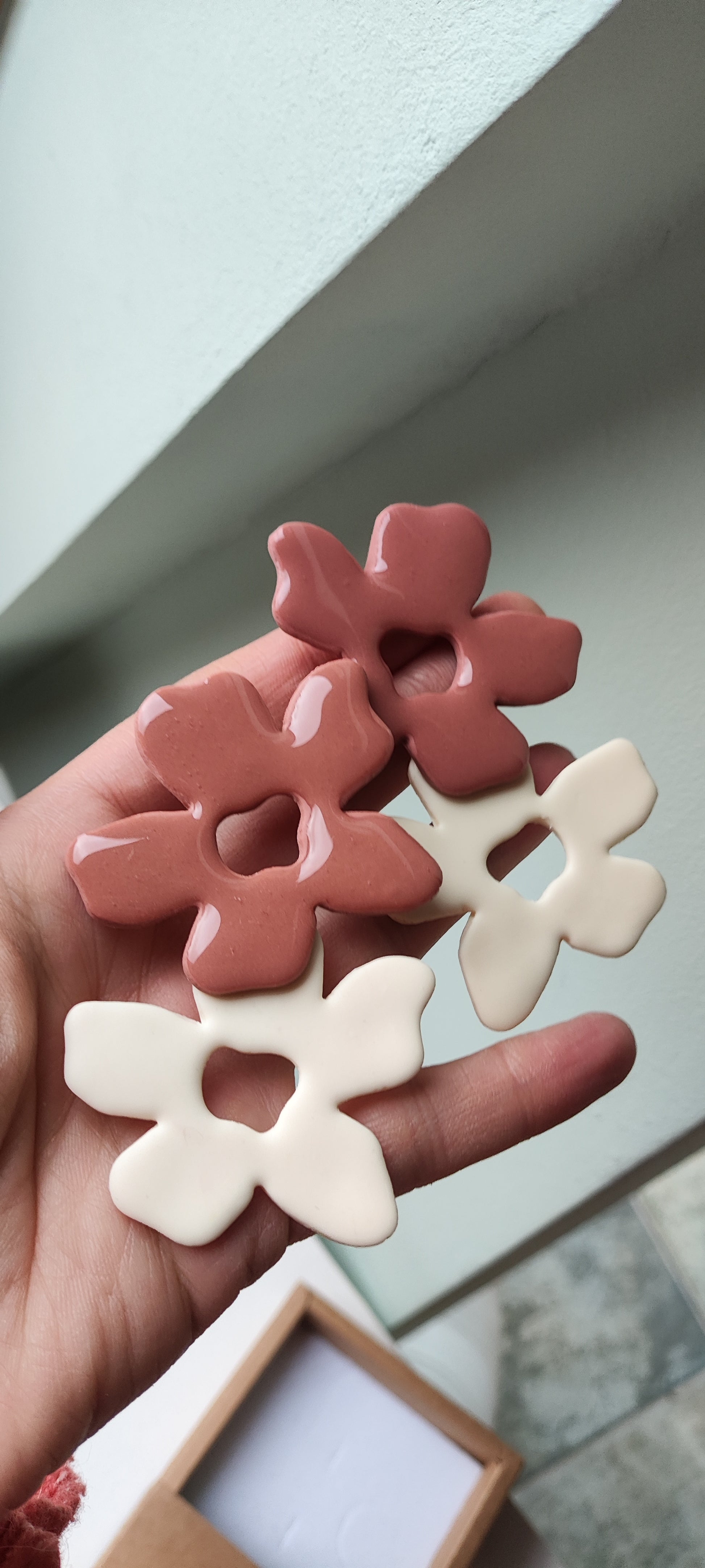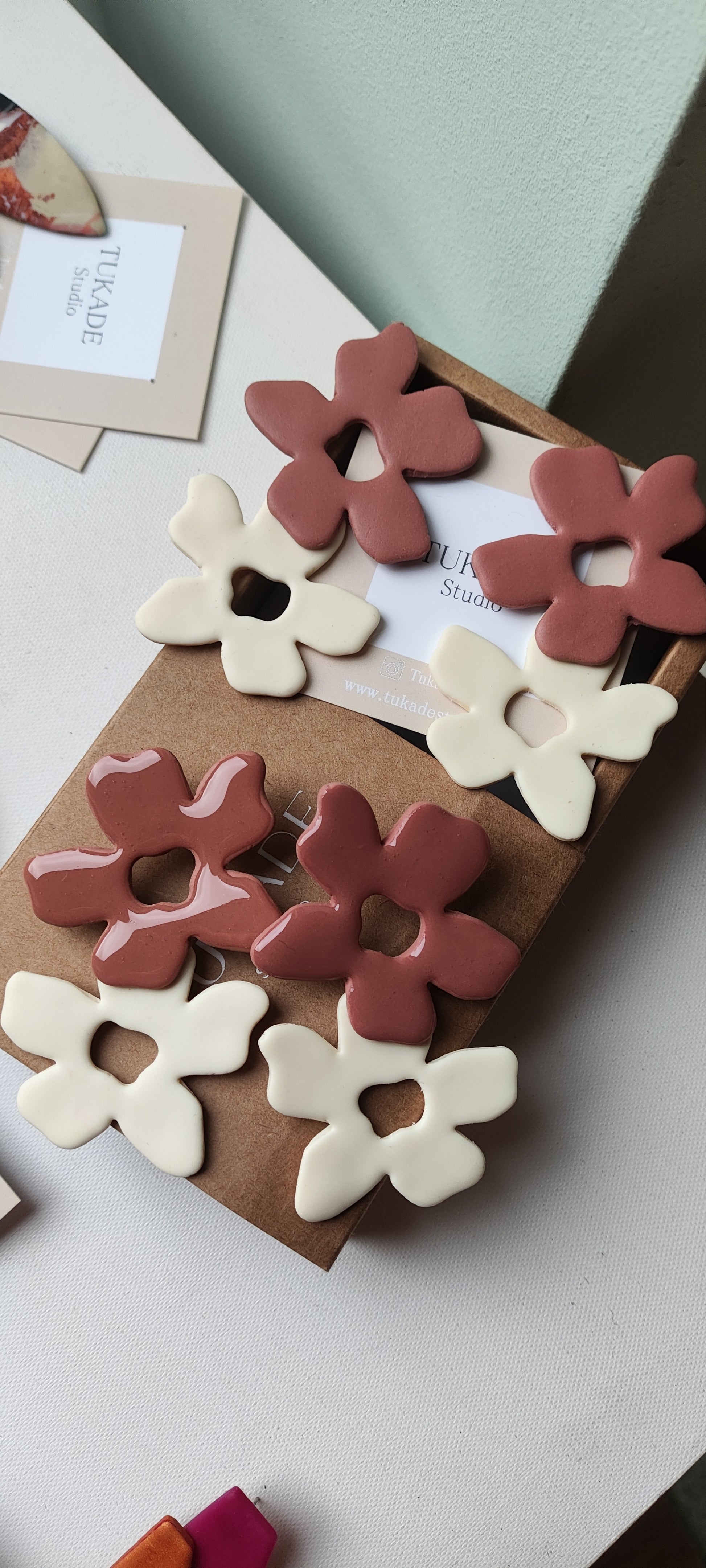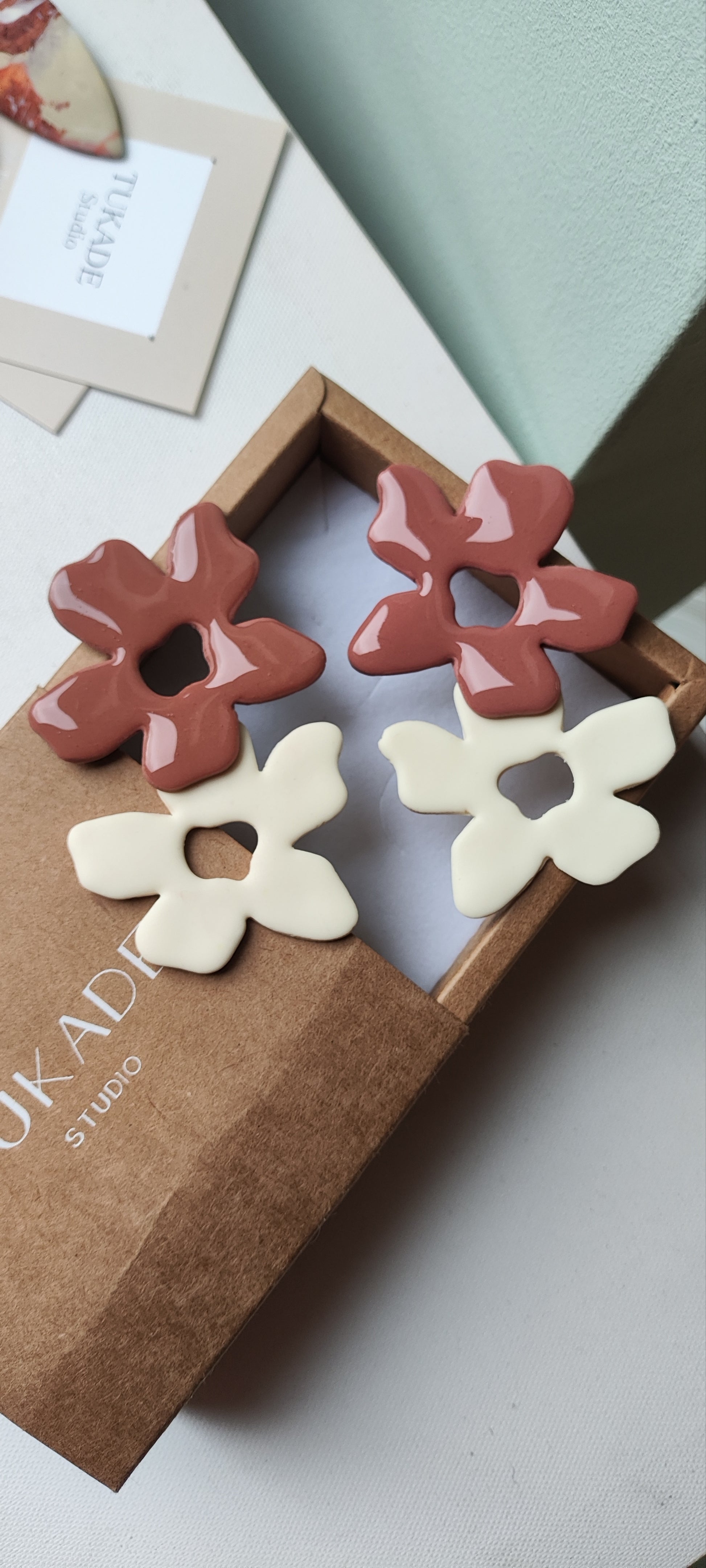Pendientes RUFINA en forma de flor maxi doble en color ocre y crudo o color rosa viejo-mouse y crudo. Las flores están posicionadas de diferente manera en un el color ocre o en el taupe-mouse. Perfectos para evento u ocasión especial.
