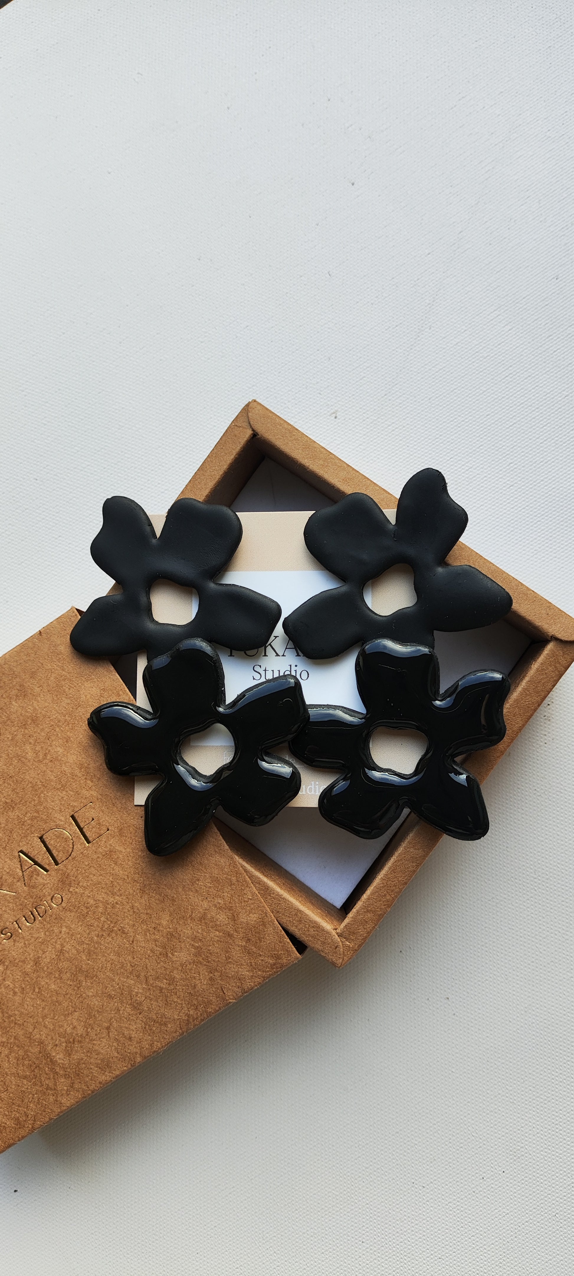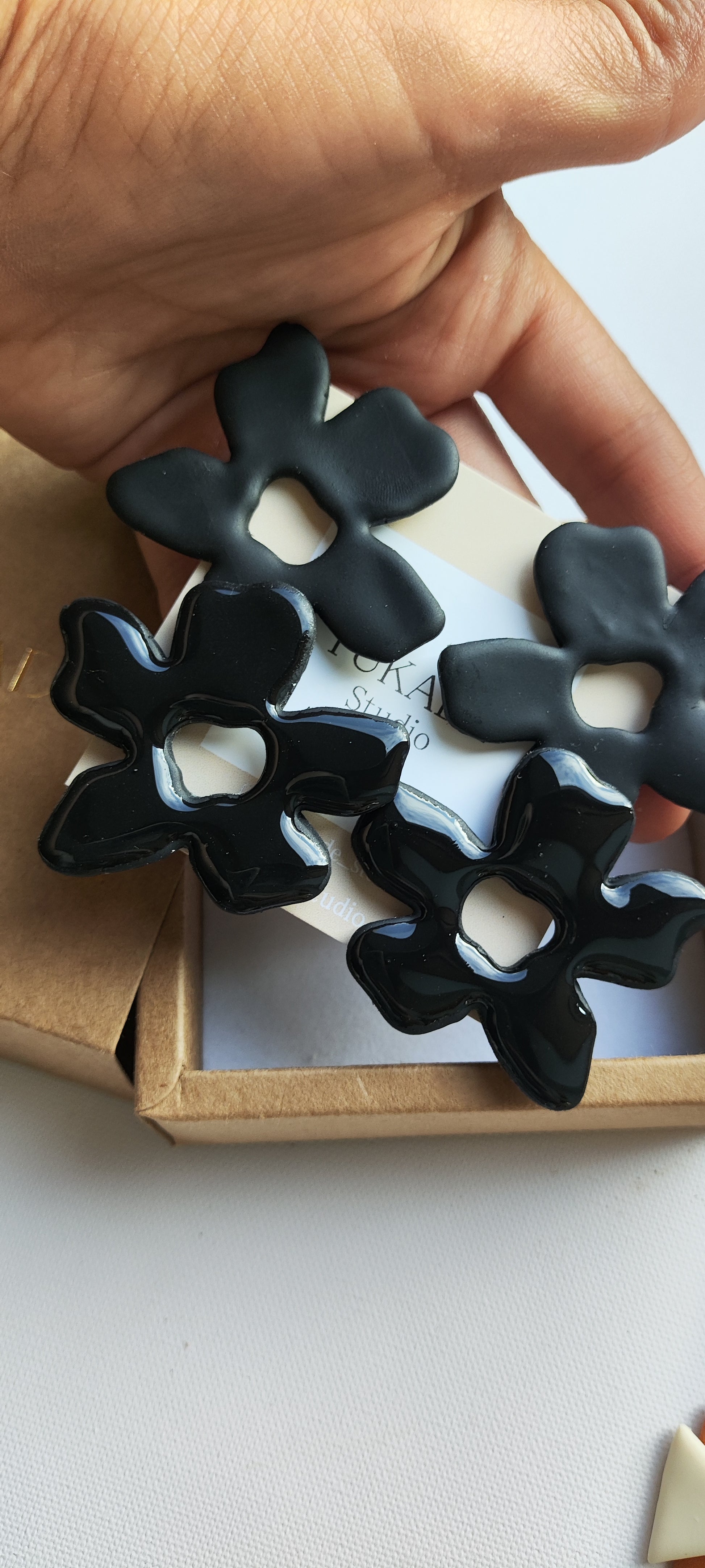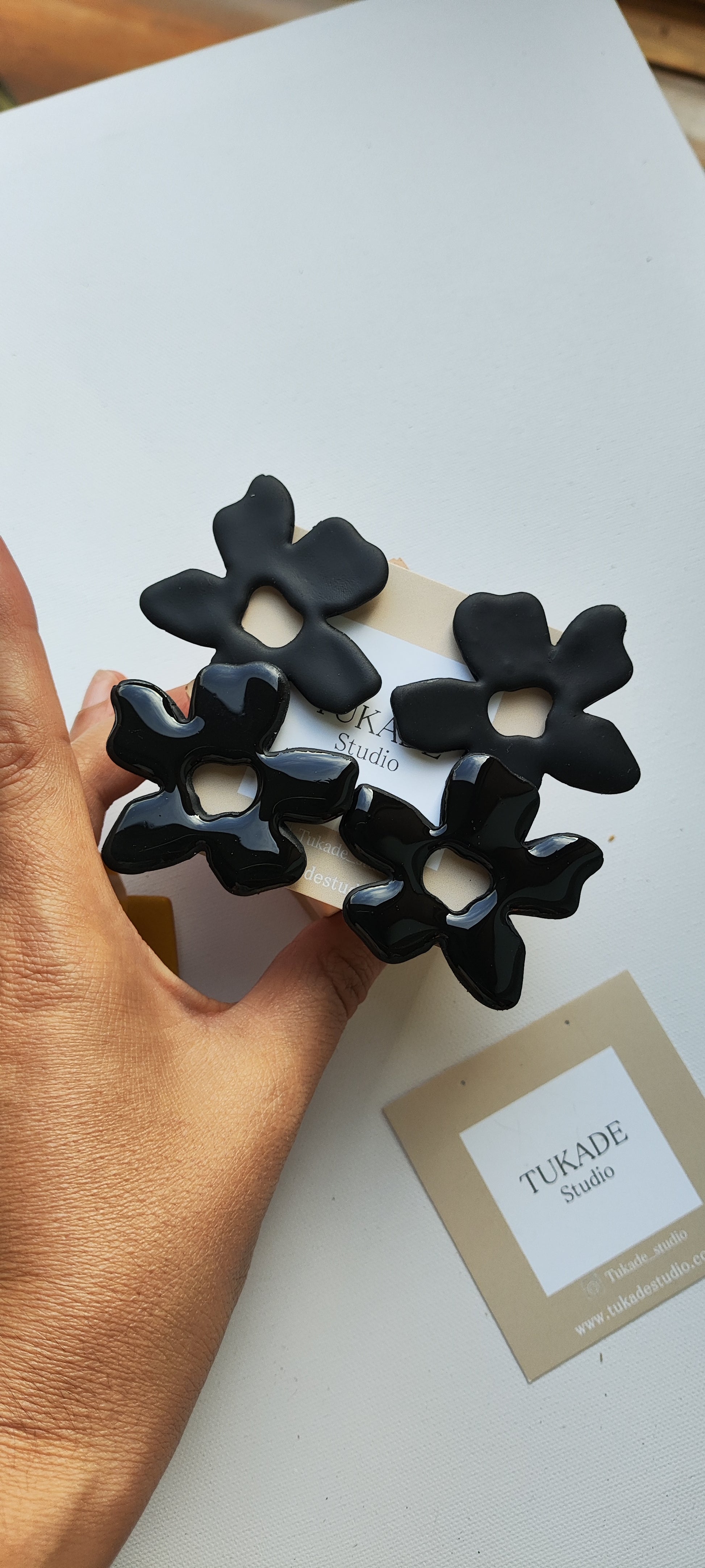 Cada par de pendientes está realizado a mano con mucho cuidado y cariño, con todo su proceso desde el modelado, corte, varios horneados, lijado y pulido.