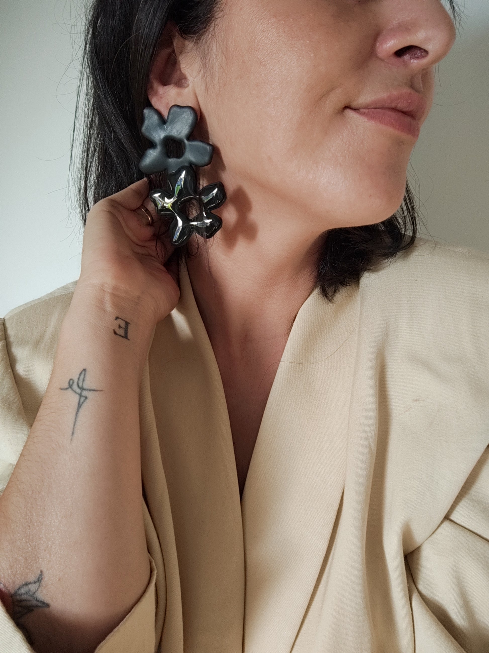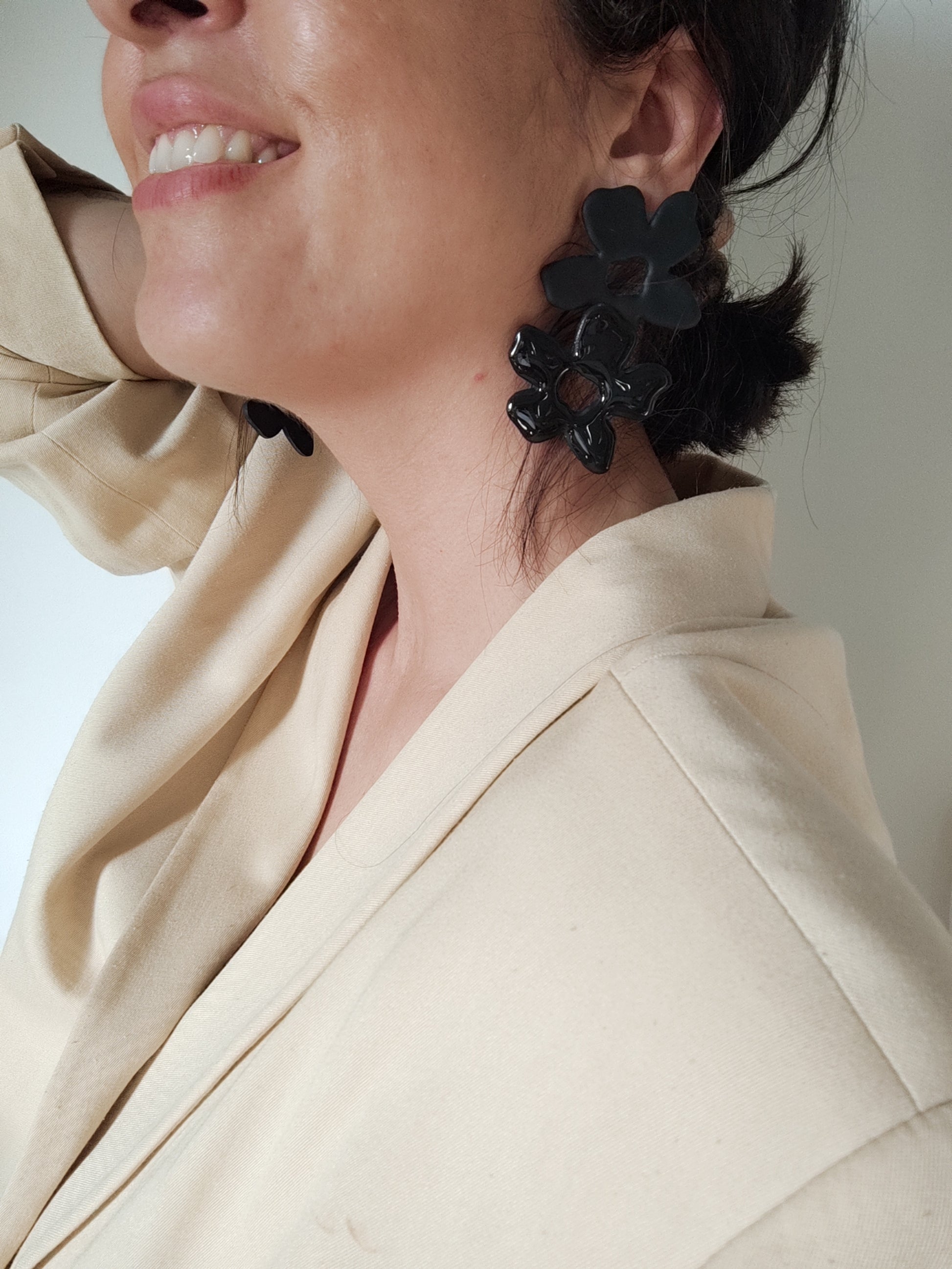Pendientes RUFINA en forma de flor maxi doble en color negro y negro con capa de brillo en resina. Perfectos para evento, noche u ocasión especial.