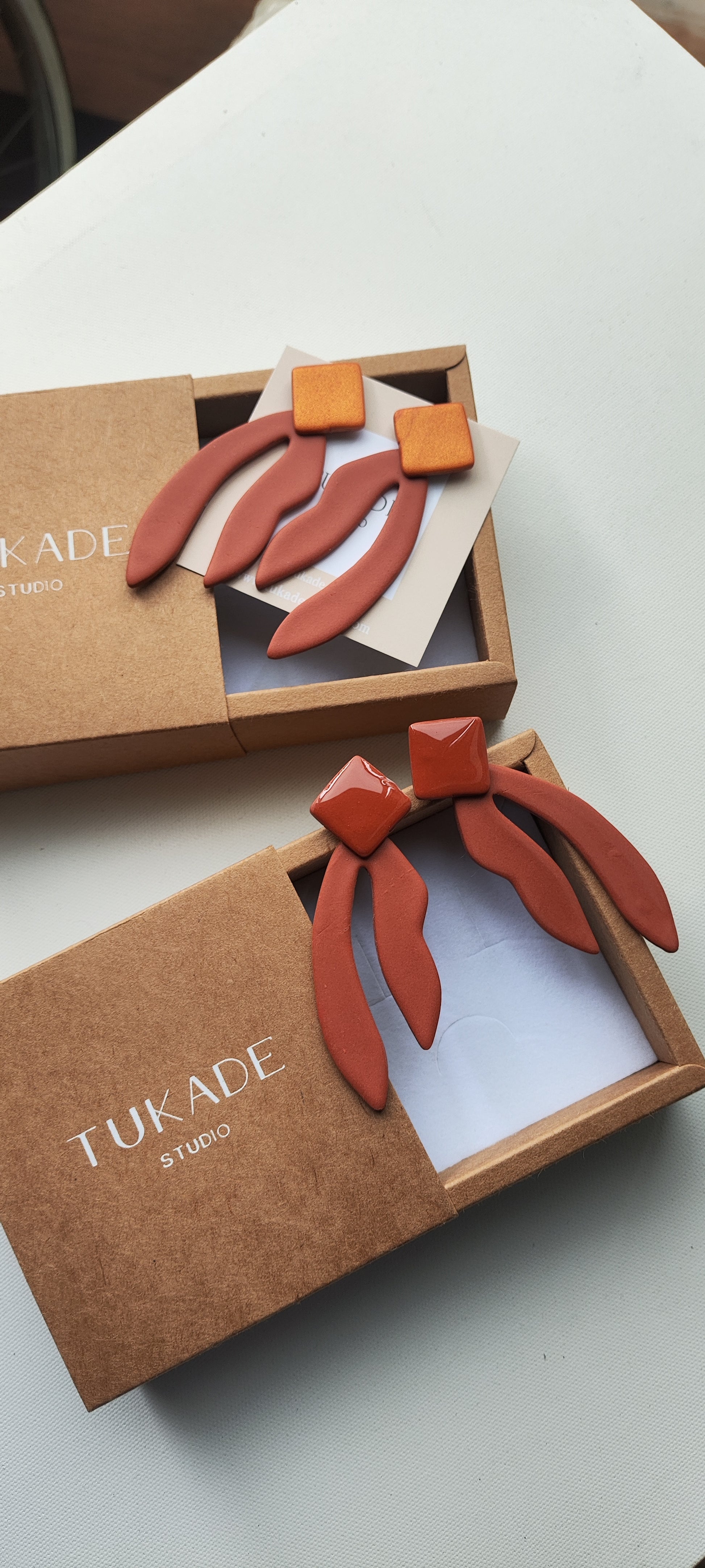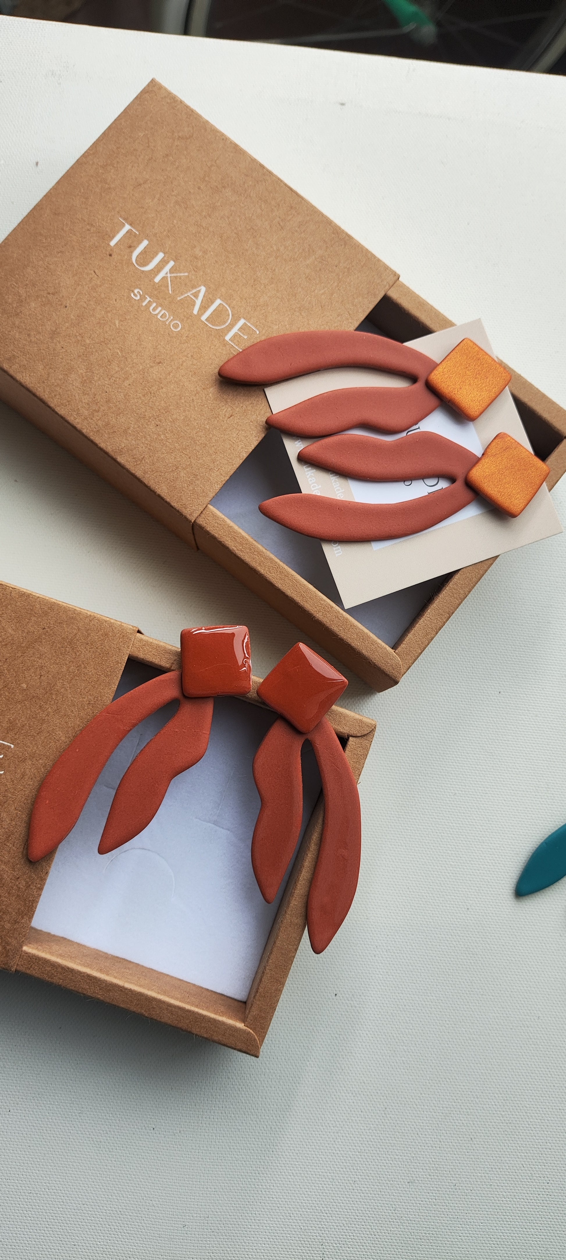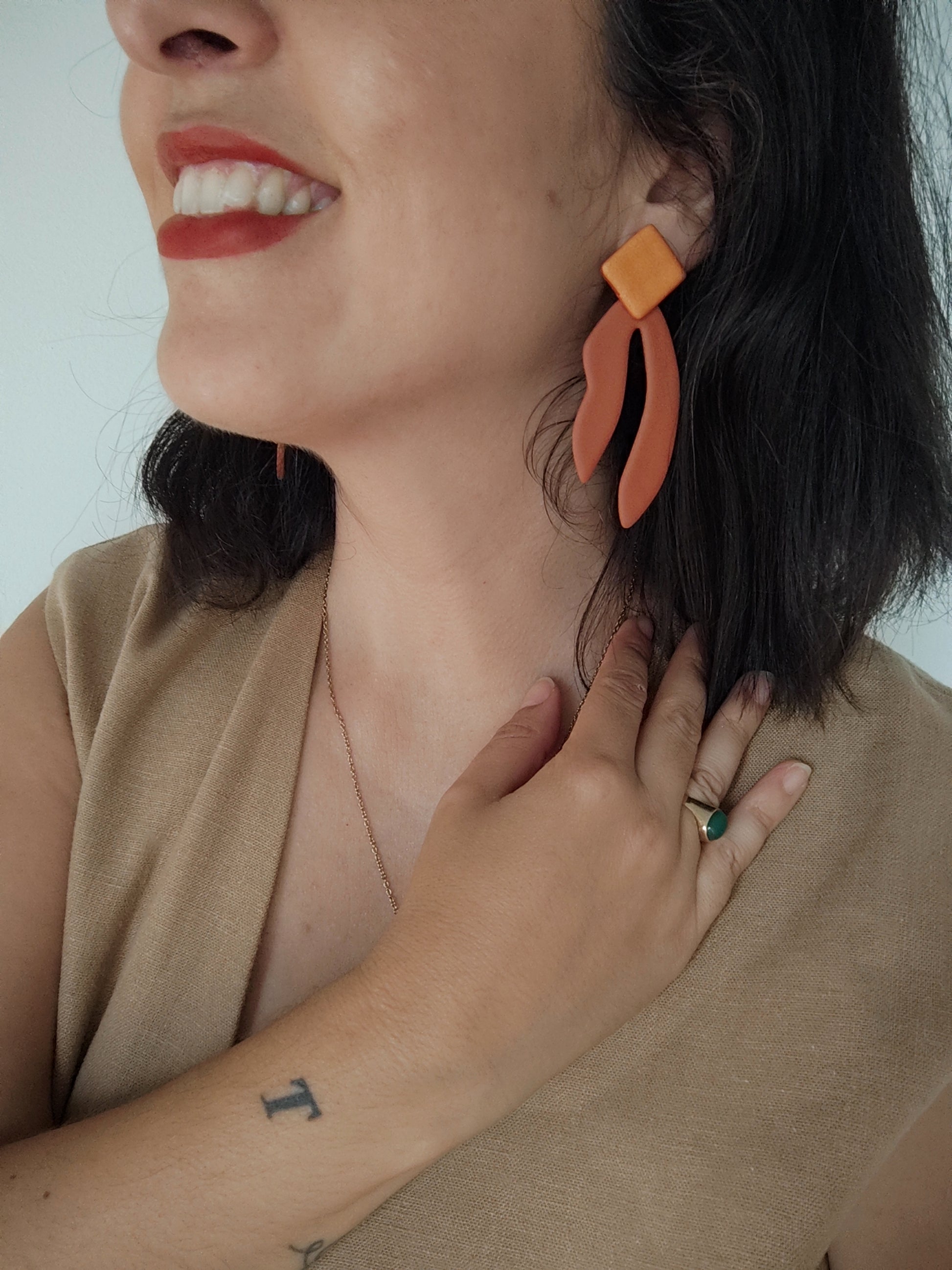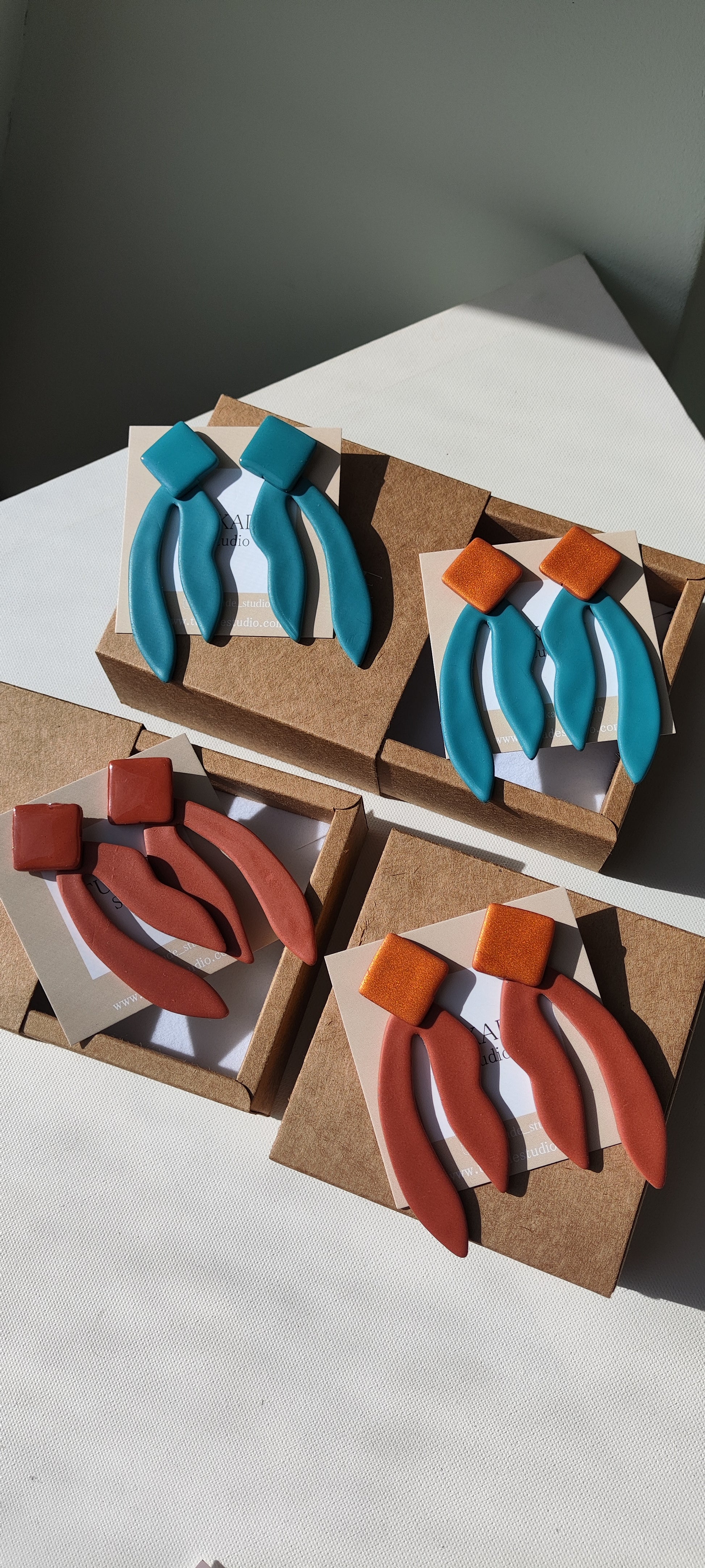 Cada par de pendientes está realizado a mano con mucho cuidado y cariño, con todo su proceso desde el modelado, corte, varios horneados, lijado y pulido.