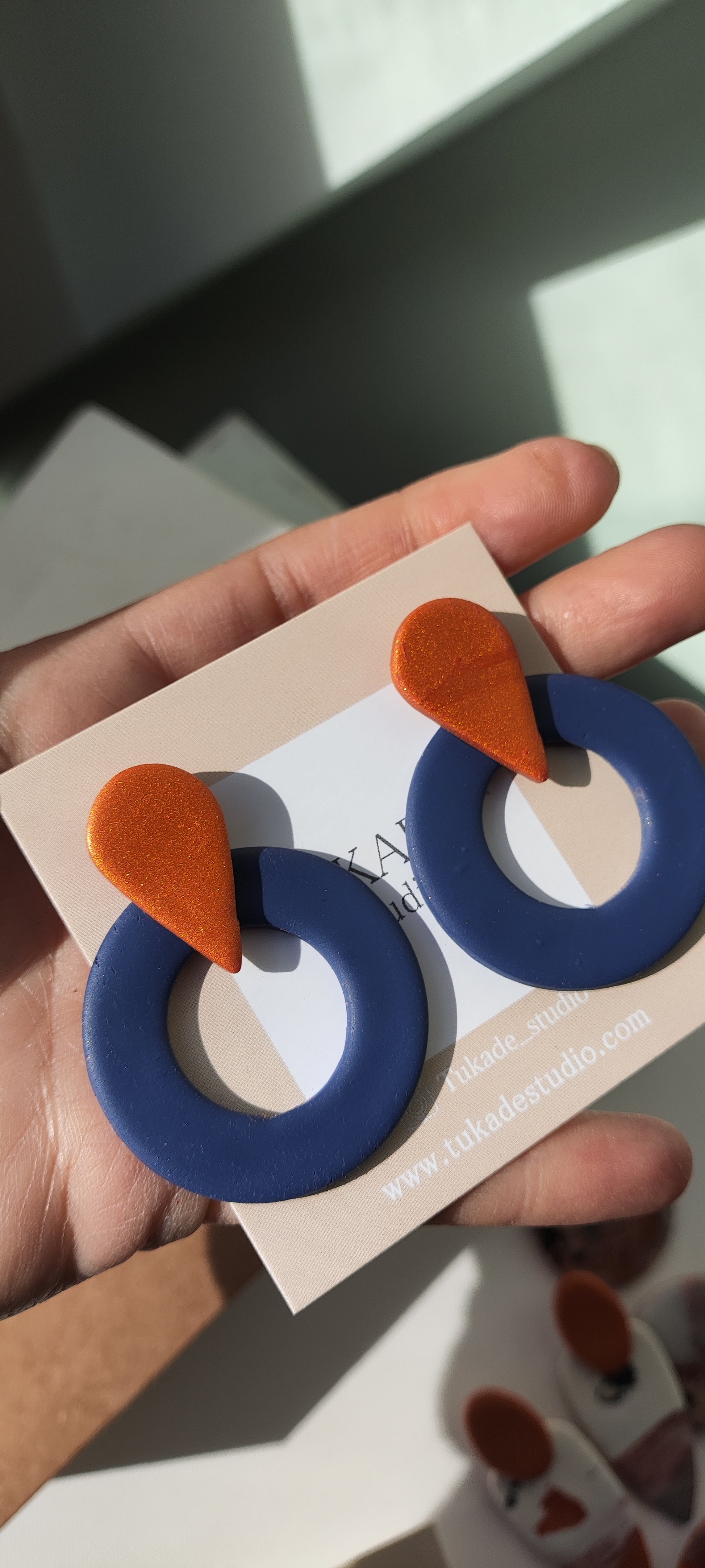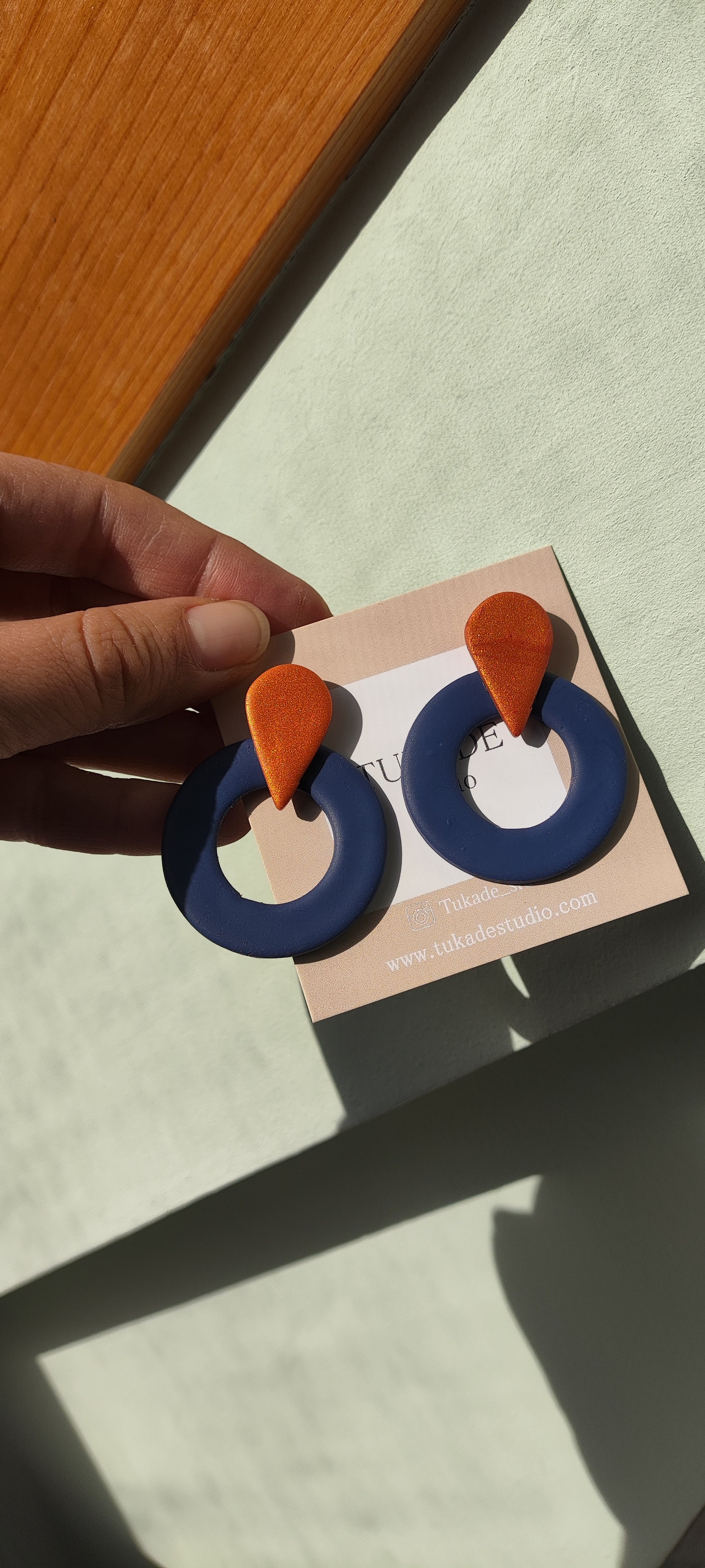 Pendientes minimalistas TOMASA en forma de círculo y lágrima color azul marino y cobre metalizado.